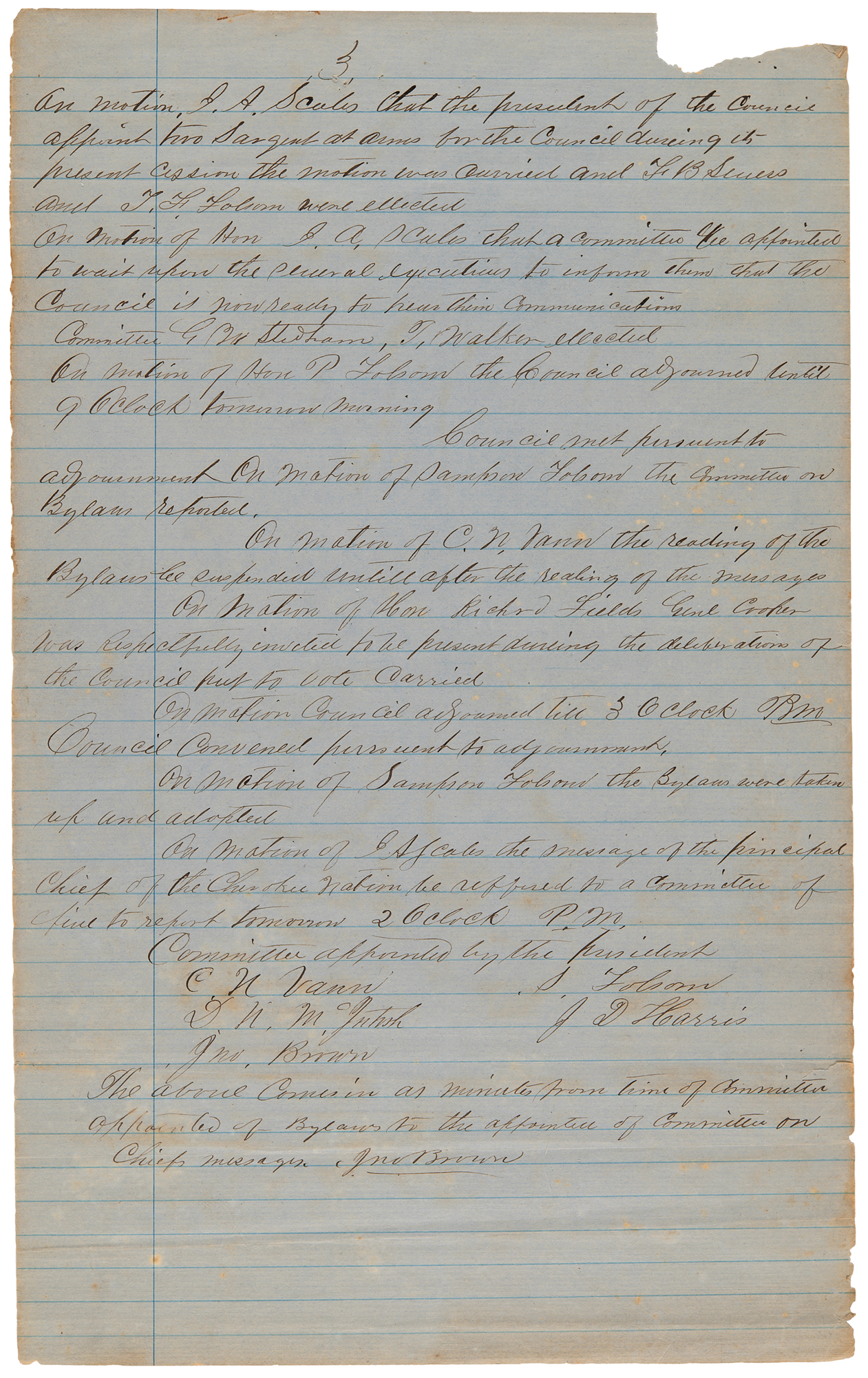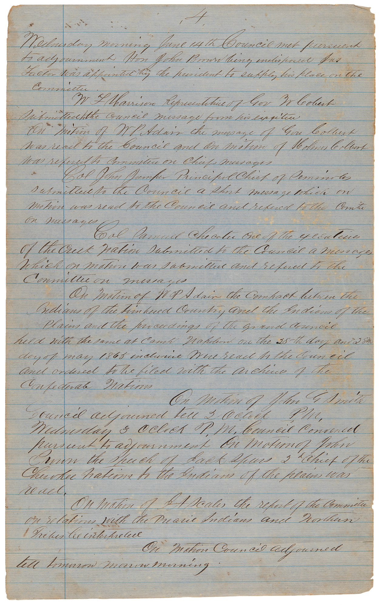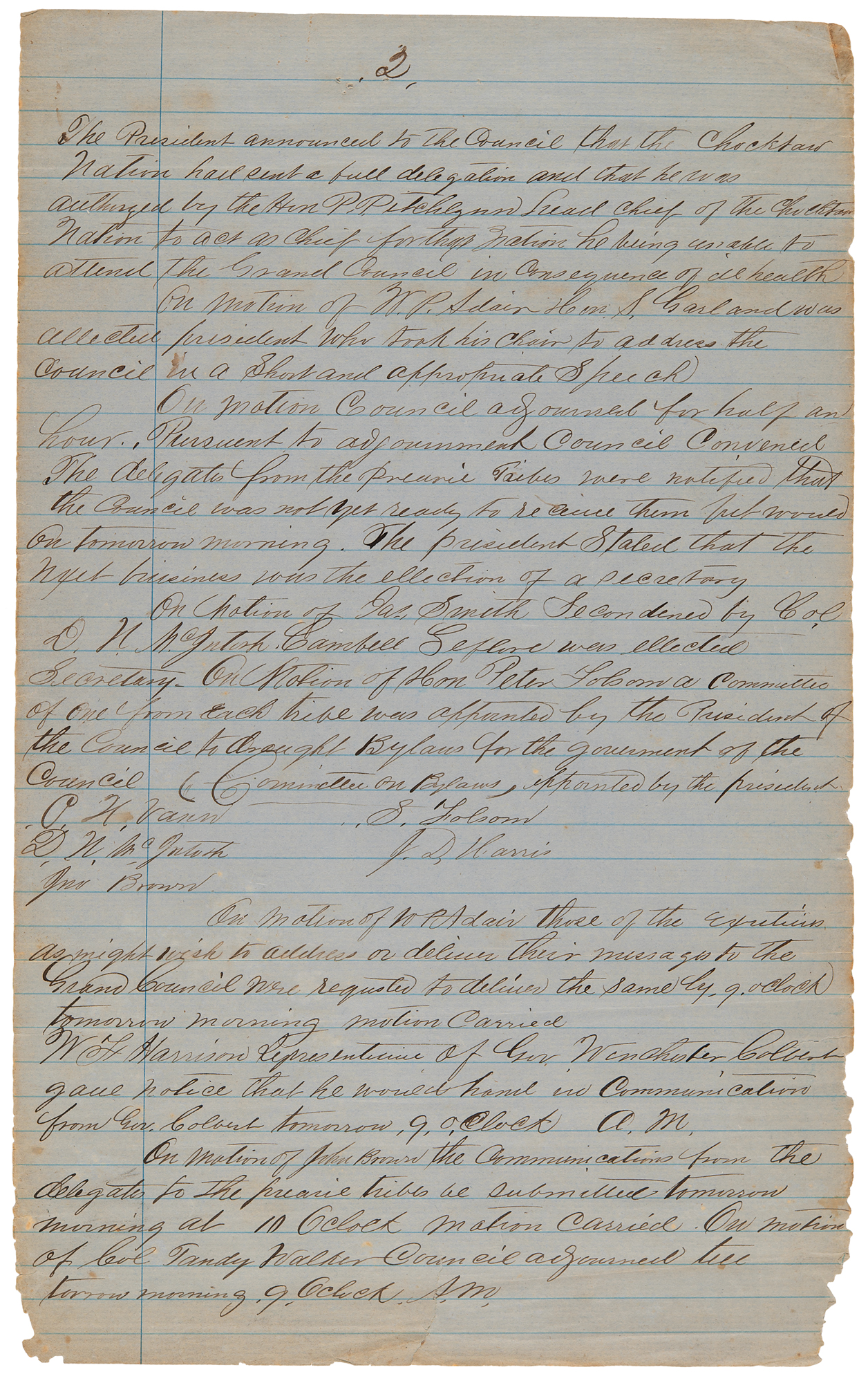 Manuscript resolutions and meeting minutes, six pages, 8 x 13, June 14, 1865. Six manuscript pages from the "Grand Council" convened at "Armstrong Academy, Choctaw Nation, Present to the call of Hon. Stand Watie, President," including one page of partial resolutions calling for the creation of a 'United Nations of the Indian Territories,' four pages of meeting minutes, and an attendance list.
