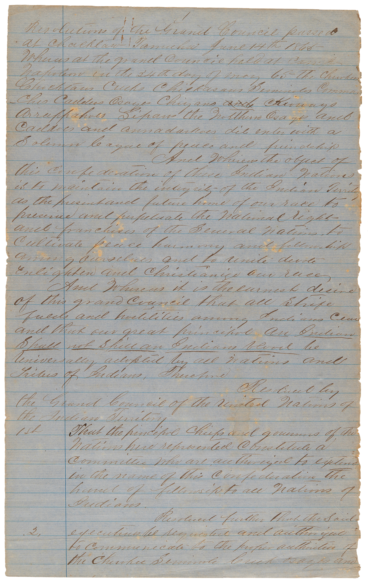 The resolutions, in part: "The Cherokees, Chocktaws, Creeks, Chickasaws, Seminoles, Commanches, Caddoes, Osages, Chigans, Chioways, Arrappahoes, Sipans, the Northern Osages and Caddoes and Annadarkoes did enter with a solemn league of peace and friendship. And whereas the object of this confederation of these Indian Nations is to maintain the integrity of the Indian territory as the present and future home of our our race; to preserve and perpetuate the National Rights and Franchises of Several Nations; to cultivate peace, harmony, and fellowship ourselves; and to unite, devote, enlighten and christianize our race. And whereas it is the earnest desire of this Grand Council that all strifes, feuds, and hostilities among Indians cease, and that our great principal, 'An Indian Shall not Spill an Indians Blood,' be universally adopted by all nations and tribes of Indians. Therefore: Resolved by the general council of the United Nations of Indian Territories; That the principal chiefs and governors of the nations constitute a committee who are authorized to extend the hand of fellowship to all Nations of Indians. Resolved further that the said executives be requested and authorized to communicate to the proper authorities of the Cherokee, Seminole, and…"