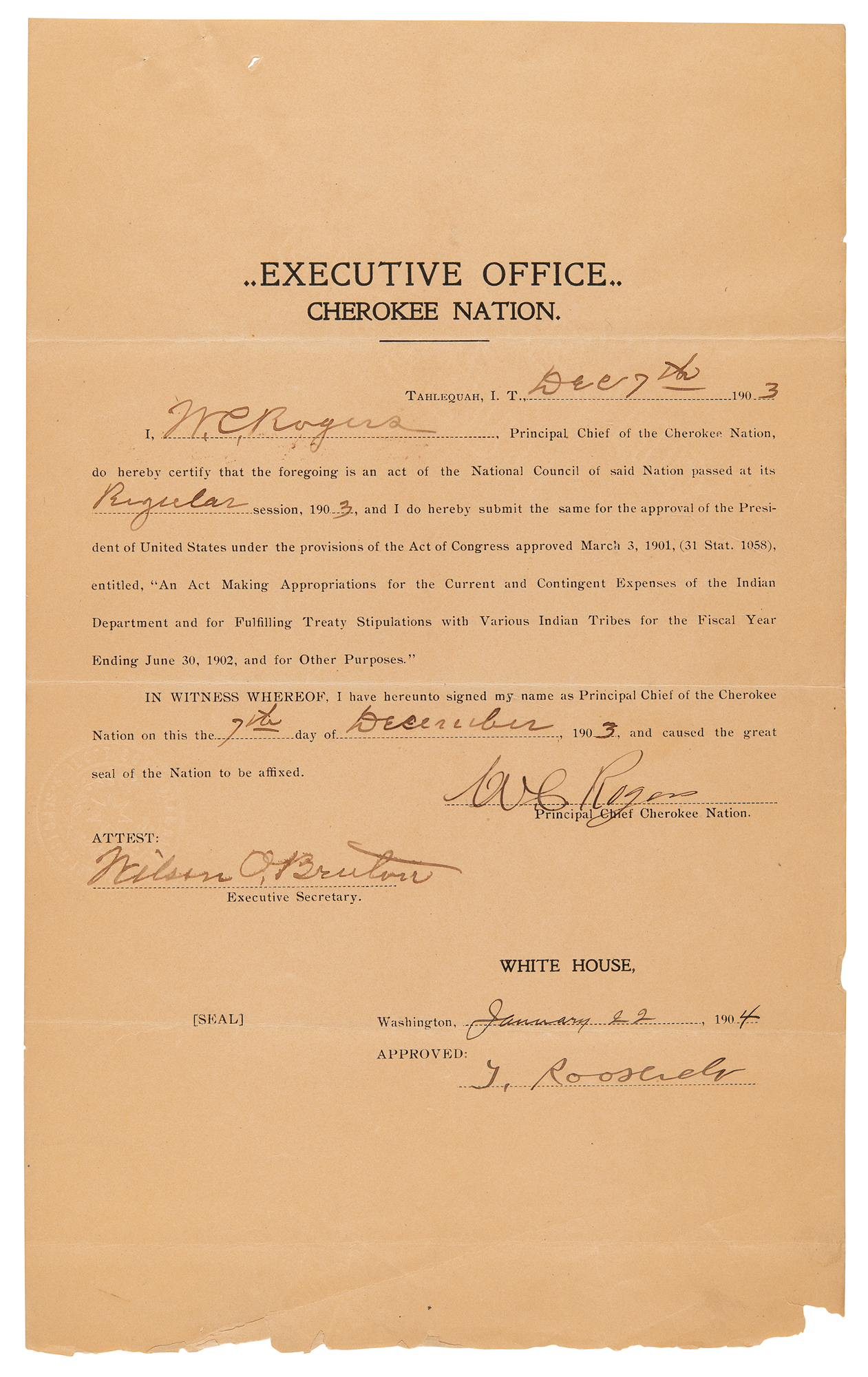 Partly-printed DS as president, signed “T. Roosevelt,” one page, 8.5 x 14, December 7, 1903. President Roosevelt certifies an act passed by the Cherokee Nation, in part: "I, W. C. Rogers, Principal Chief of the Cherokee Nation, do hereby certify that the foregoing is an act of the National Council of said Nation passed at its Regular session, 1903, and I do hereby submit the same for the approval of the President of the United States under the provisions of the Act of Congress approved Marc 3, 1901…entitled 'An Act Making Appropriations for the Current and Contingent Expenses of the Indian Department and for Fulfilling Treaty Stipulations with Various Indian Tribes for the Fiscal Year Ending June 30, 1902." Signed at the conclusion by Chief W. C. Rogers, Executive Secretary Wilson O. Bruton, and President Theodore Roosevelt. Includes its original paper folder, docketed: "Insane Asylum Appropriation." In fine condition, with some creasing and chipping to the bottom.