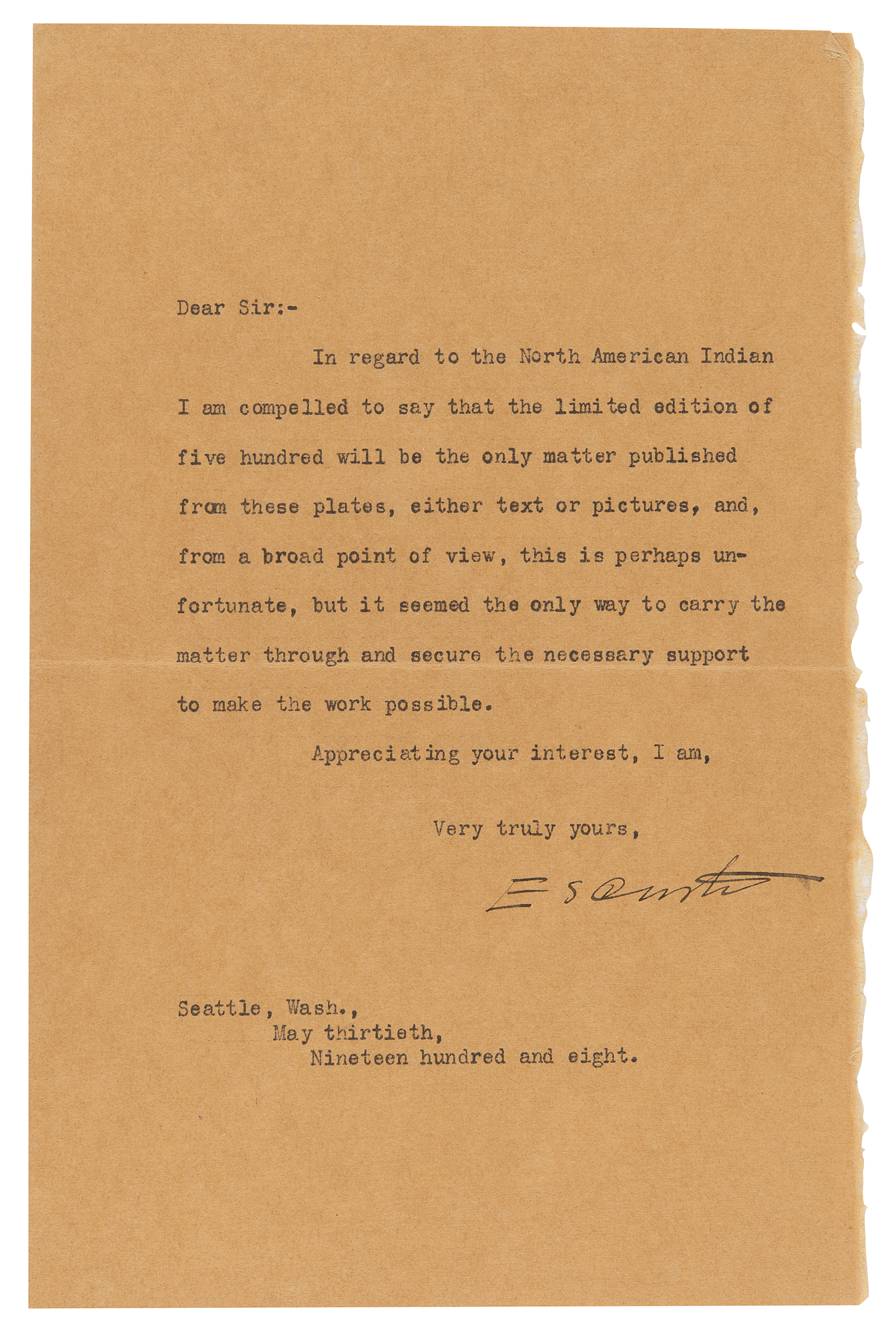 Photographer (1868–1952) known for his photos of the American West and stylized portraits of Native Americans. TLS signed “E. S. Curtis,” one page, 5.5 x 8.5, May 30, 1908. Letter concerning his magnum opus, the extraordinary 20-volume set The North American Indian. In full: "In regard to the North American Indian I am compelled to say that the limited edition of five hundred will be the only matter published from these plates, either text or pictures, and, from a broad point of view, this is perhaps unfortunate, but it seemed the only way to carry the matter through and secure the necessary support to make the work possible." In fine condition.