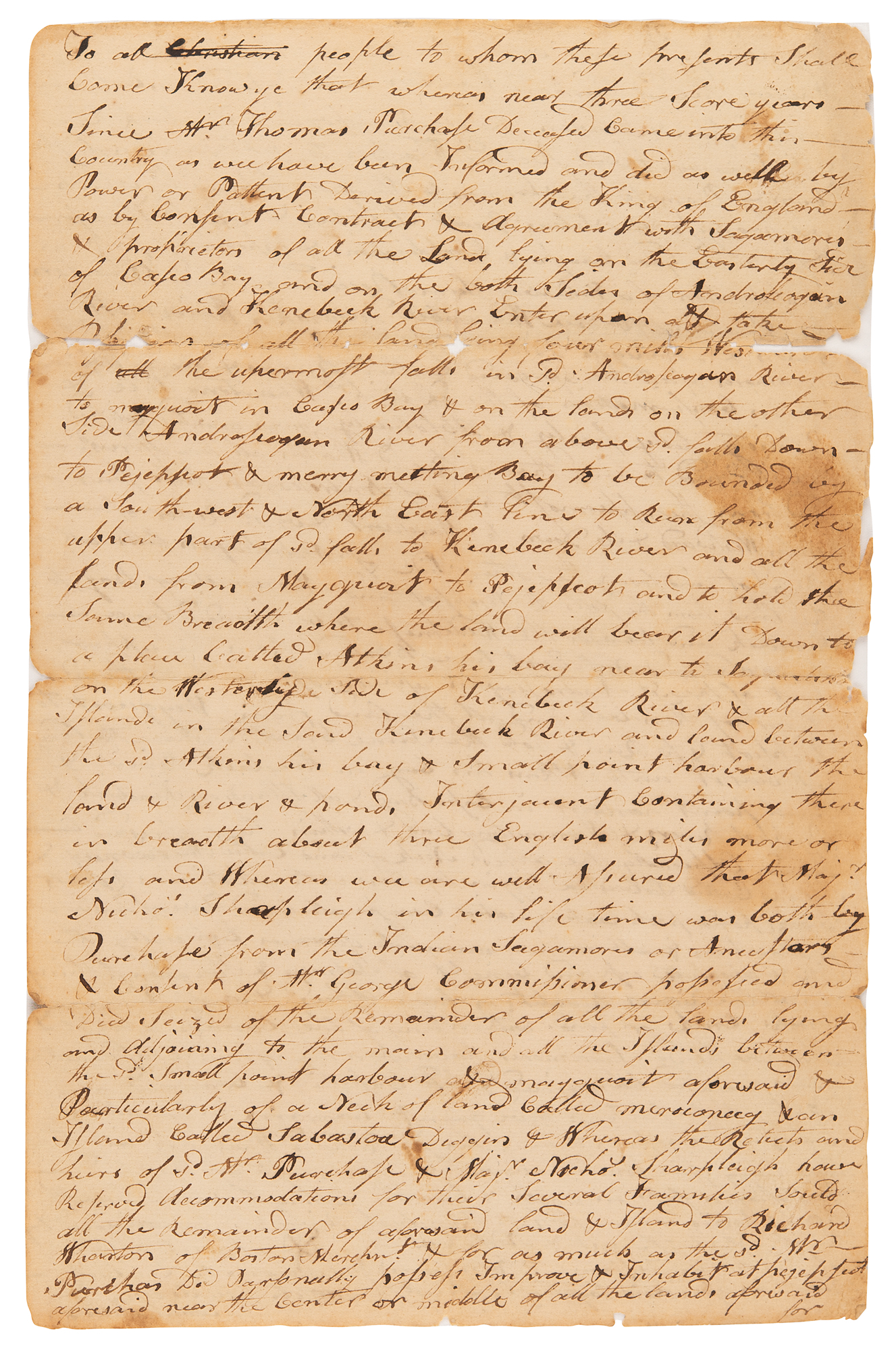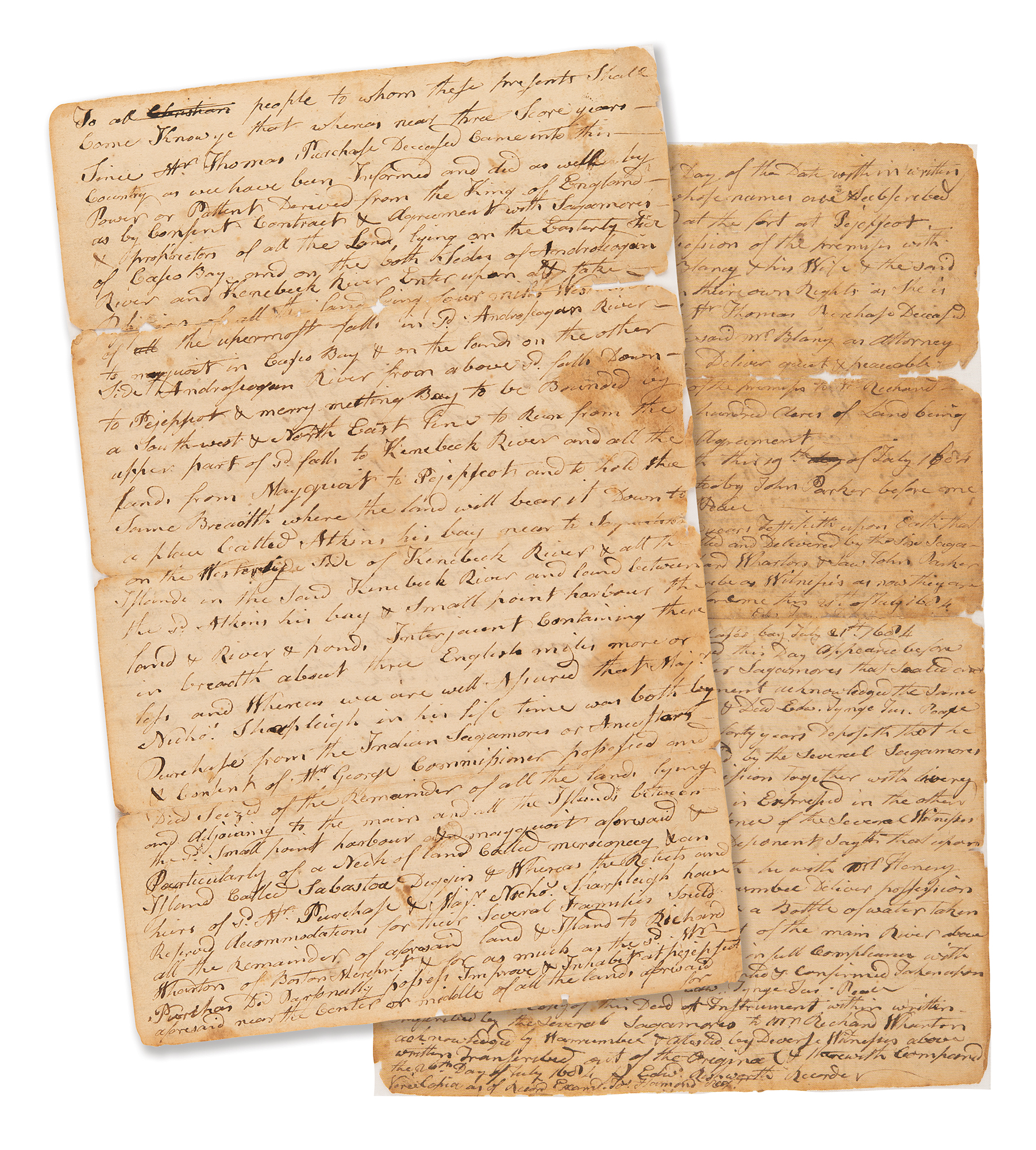 Manuscript document, two pages both sides, 8 x 12.25, July 26, 1684. Contemporary manuscript true copy of a deed by which Sagamores of the Kennebec, Androscoggin, and Casco Bay regions agree to cede lands to the use of Richard Wharton, a Boston merchant, land proprietor, attorney, and slave trader. The original deed was executed in mid-July 1684, with this true copy made just a few days later according to its memorandum on the reverse.