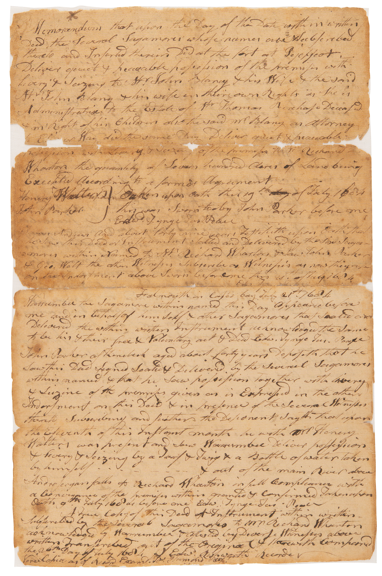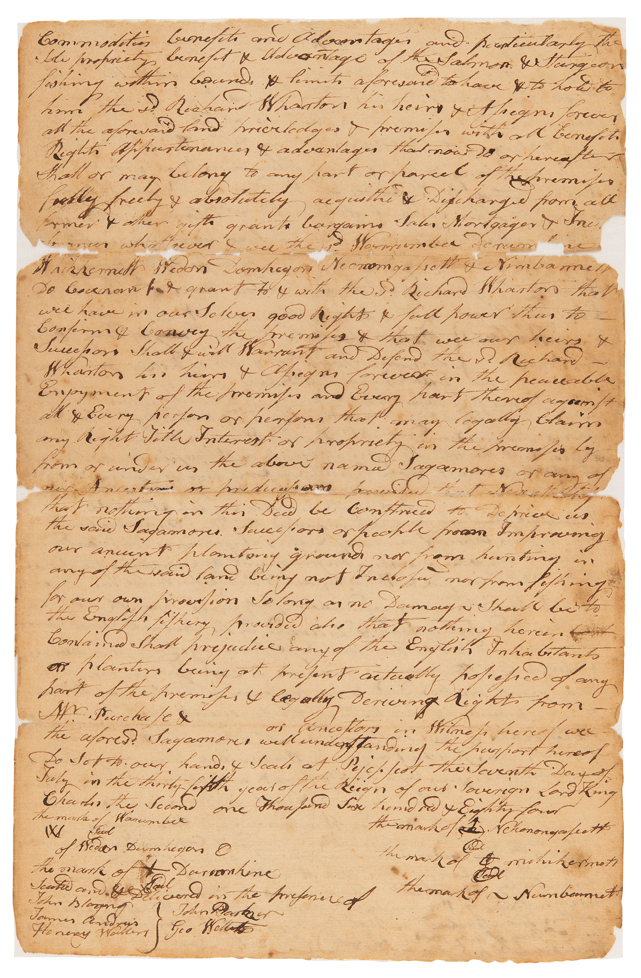 The memorandum on the reverse, in part: "A True Copy of this Deed of Instrument within written—Subscribed by Several Sagamores to Mr. Richard Wharton acknowledged by Warrumber & Attested by Diverse Witnesses above written Transcribed out of the Original & Herewith Compared the 26th Day of July 1684, Edwd. Rushworth Recorder." In very good condition, with small areas of paper and fragile folds, reinforced with complete silking to one side of each sheet. Accompanied by a complete typed transcription.
