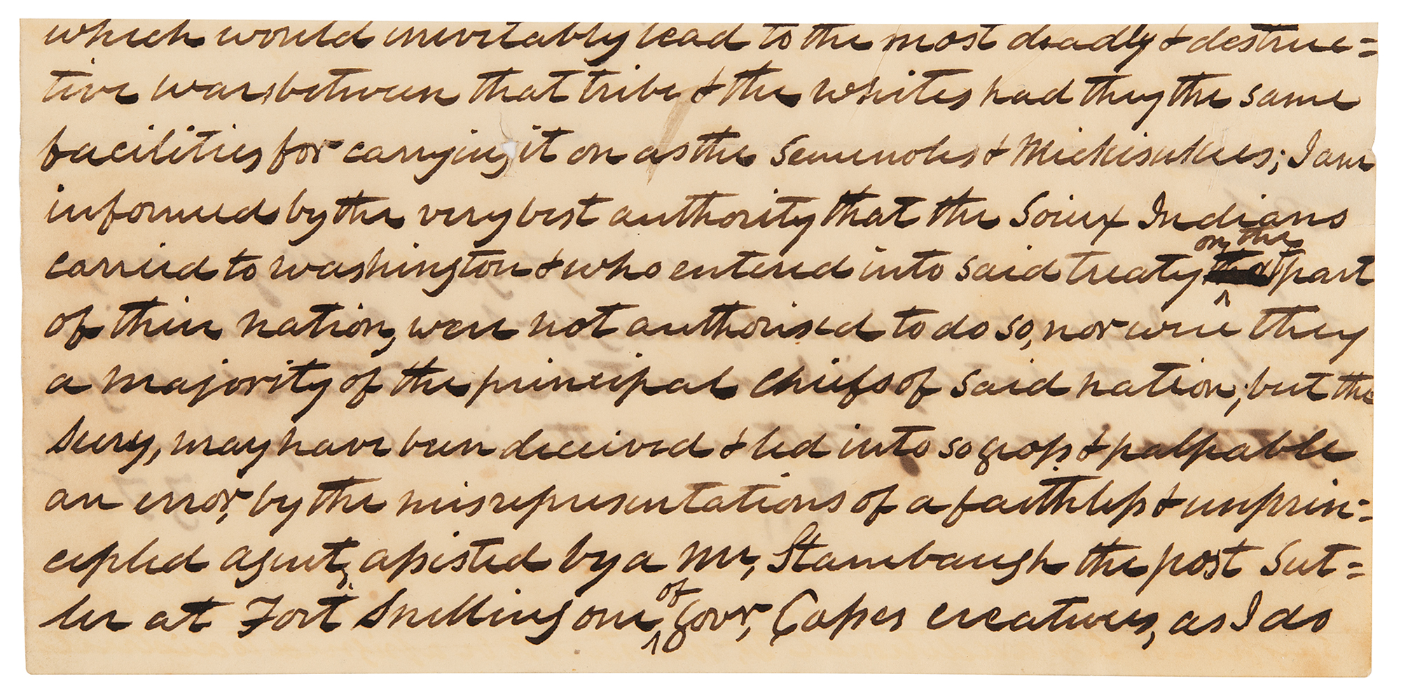 Partial ALS signed "Z.T.," one page both sides, 7.75 x 3.75, no date but circa 1837–1838. Taylor writes to "the Hon. J. J. Crittenden, Member of the U.S. Senate from K.Y.," in full: "…which would inevitably lead to the most deadly & destructive war between that tribe & the whites had they the same facilities for carrying it on as the Seminoles & Mickisukees; I am informed by the very best authority that the Sioux Indians carried to Washington & who entered into said treaty on the part of their nation, were not authorized to do so, nor were they a majority of the principal chiefs of said nation; but…may have been deceived & led into so gross & palpable an error, by the misrepresentations of a faithless & unprincipled agent, assisted by a Mr. Stambaugh the post Sutler at Fort Snelling one of Gov'r Cass's creatures, as I do."