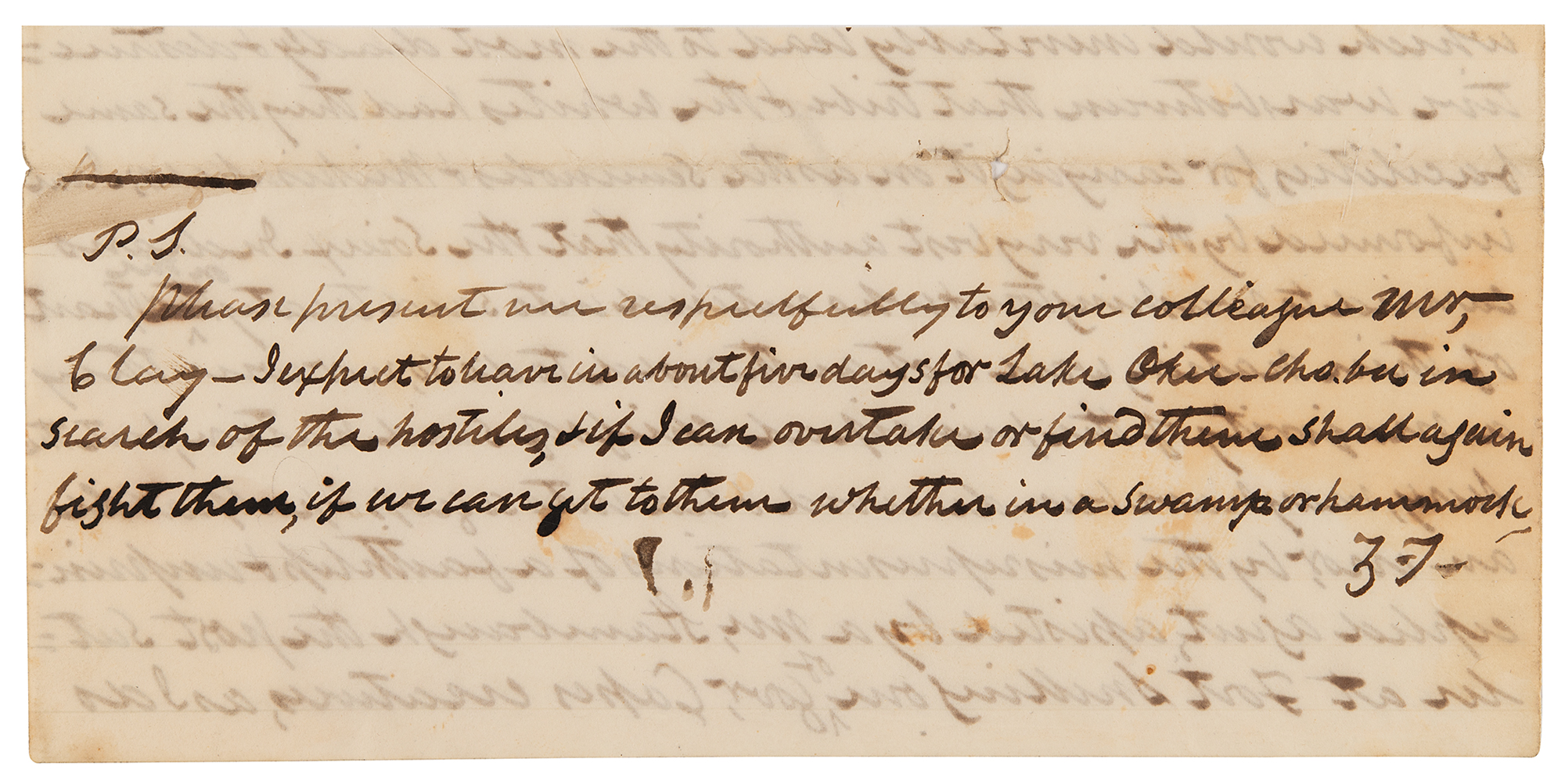 On the reverse, Taylor writes a postscript: "P.S. Please present me respectfully to your colleague Mr. Clay—I expect to leave in about five days for Lake Okee-chobee in search of the hostiles, & if I can overtake or find them shall again fight them, if we can get to them whether in a swamp or hammock." In fine condition. Accompanied by the original mailing panel, addressed in Taylor's own hand, and annotated with his name in another hand.