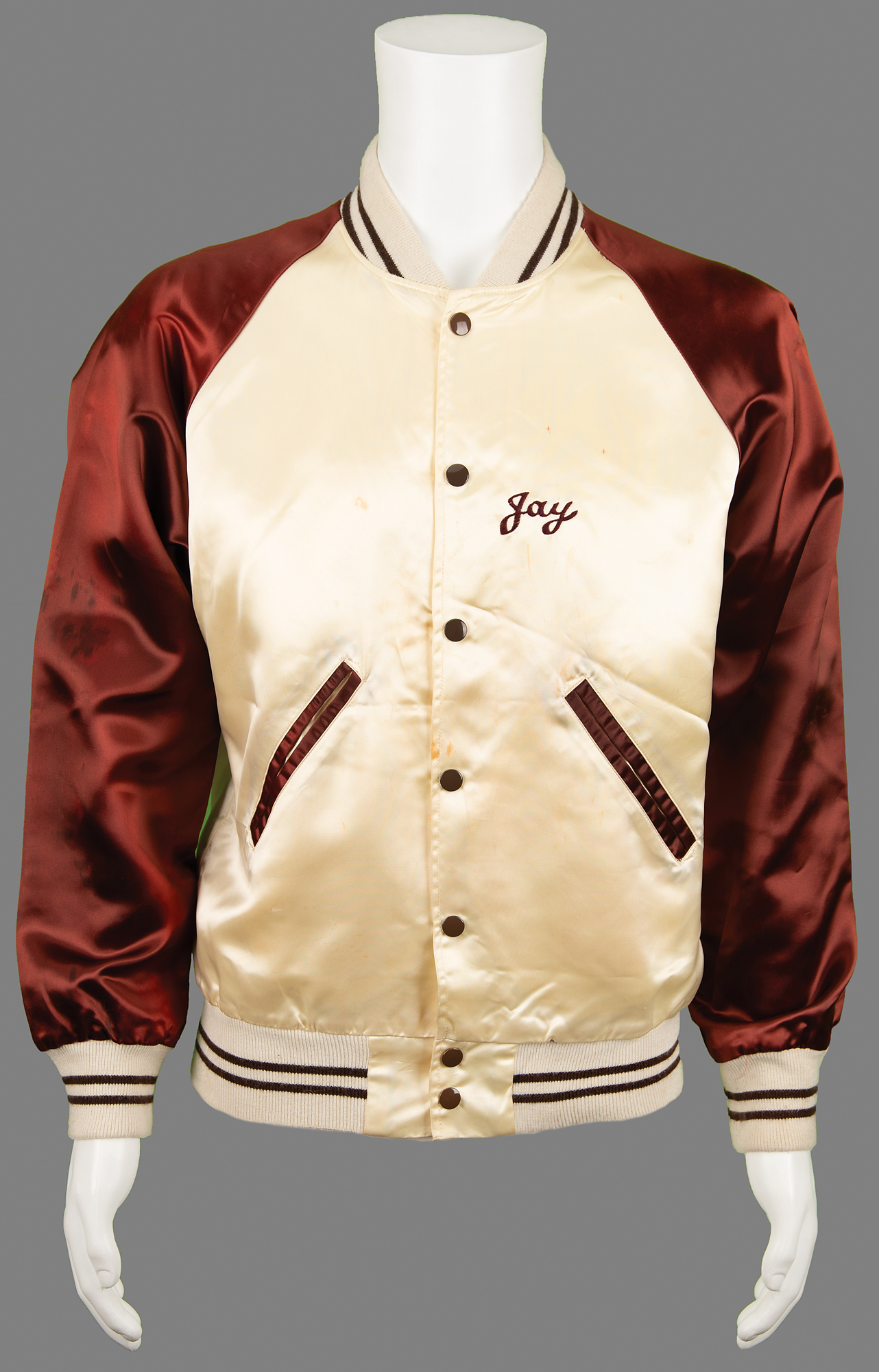 Extremely rare satin bomber jacket from Jimmy Buffet's 1979 'Volcano' tour of the Untied States, featuring a large, finely embroidered emblem of an exotic "Volcano" landscape on the back. The jacket features a snap-down placket, two slash pockets trimmed in rust, with "Jay" embroidered on the chest. The "Jonathan B, California" maker's label is sewn inside the neck, size unlabeled but about medium. In very good condition, with some scattered staining. Originates from the collection of a tour manager who worked for Concerts West in the 1970s, and subsequently as an independent contractor providing tour management and entertainment accounting services in the early 1980s.
