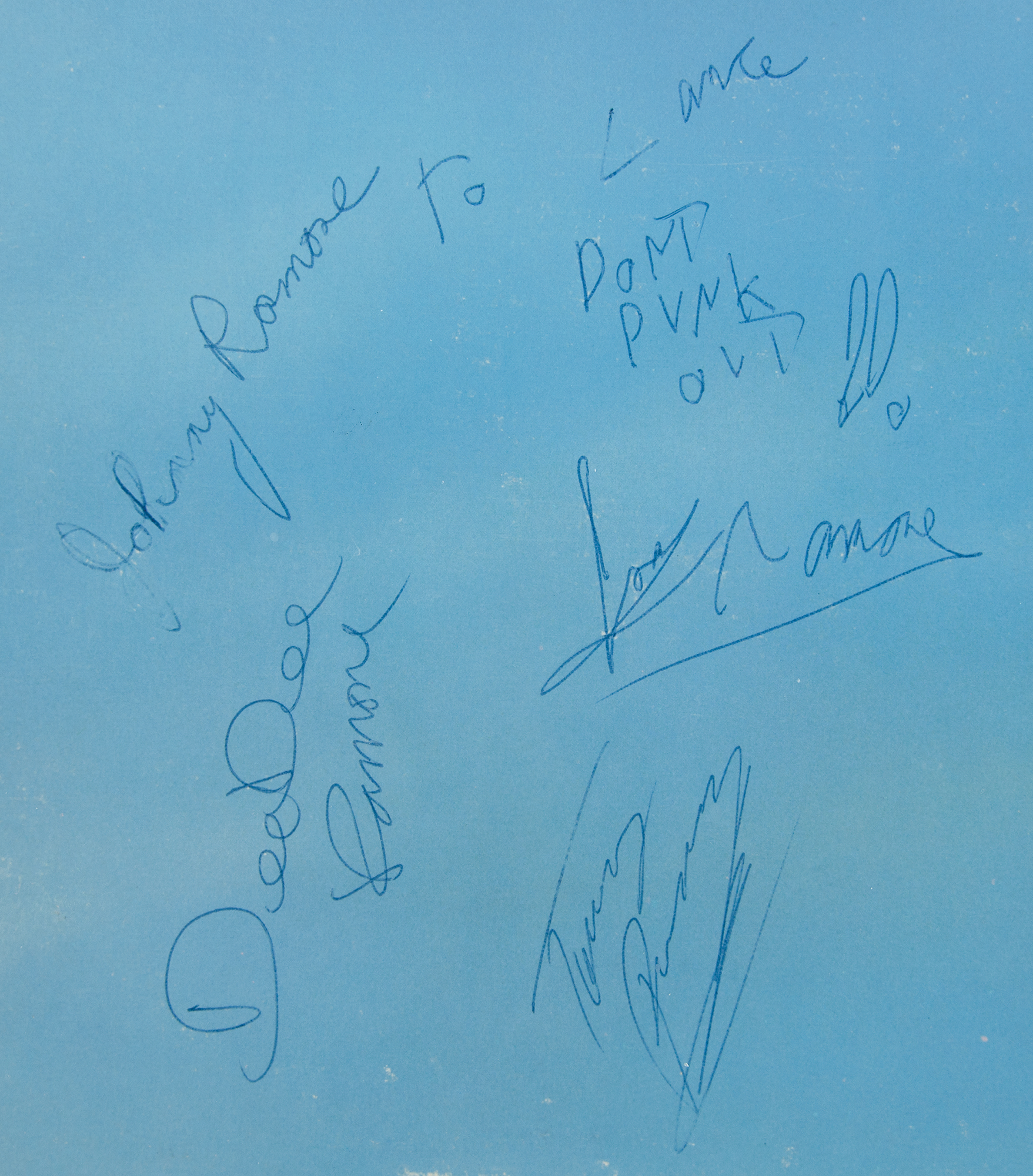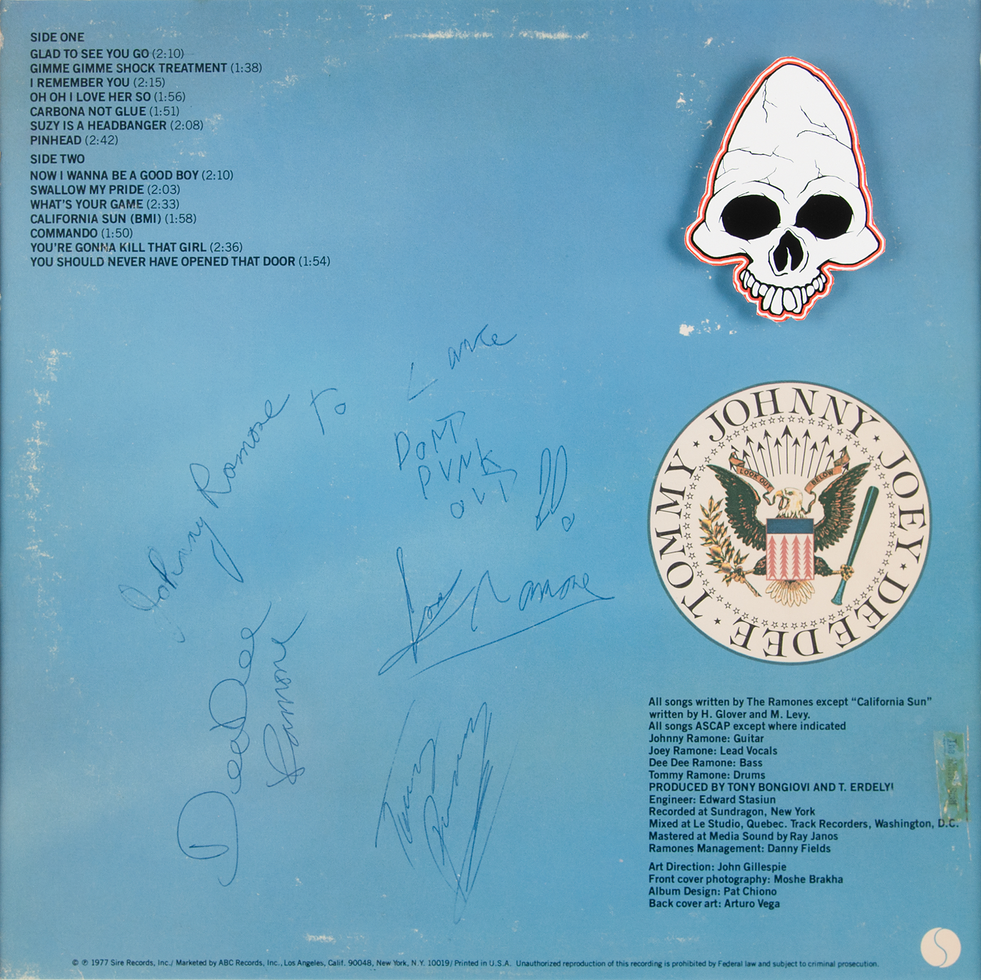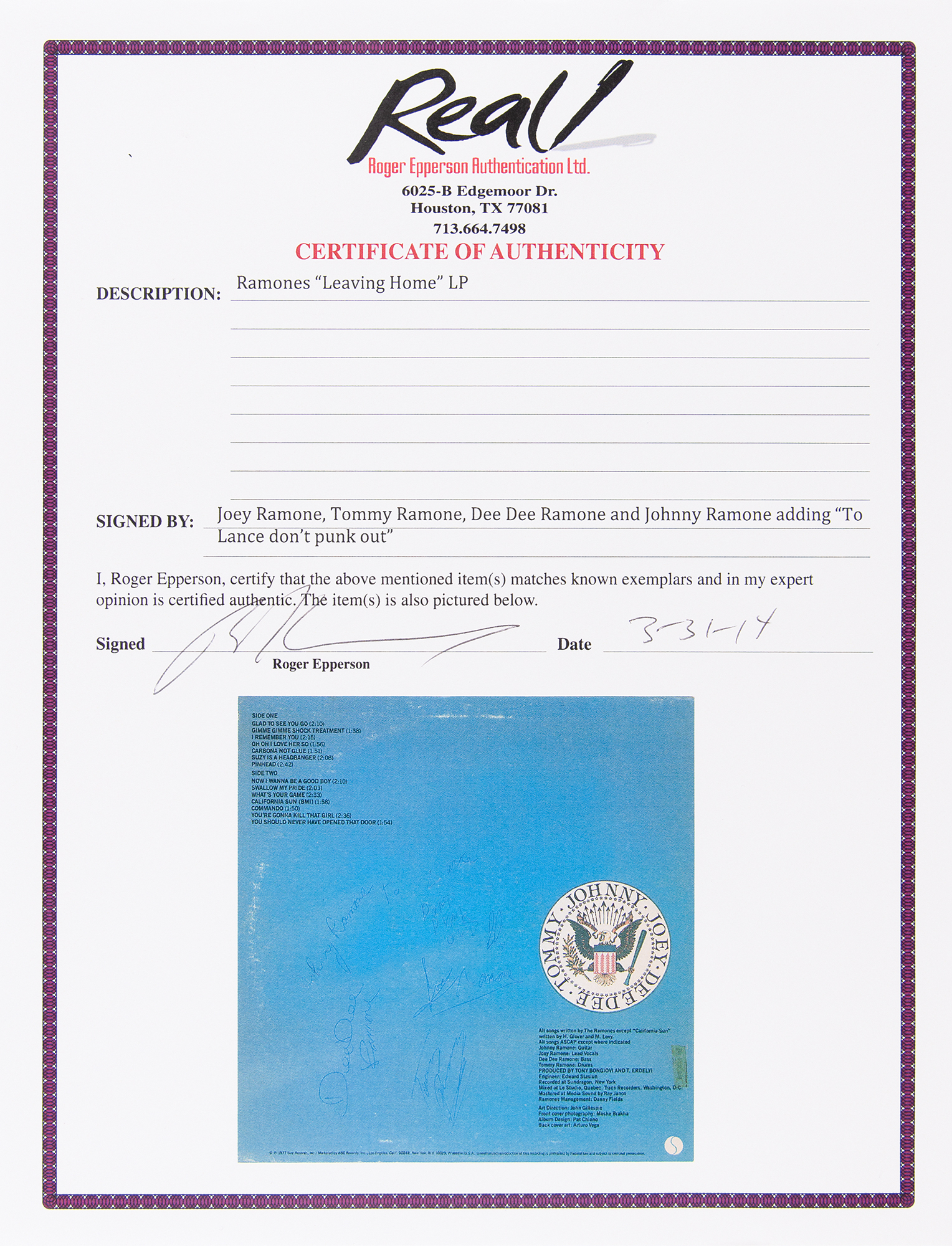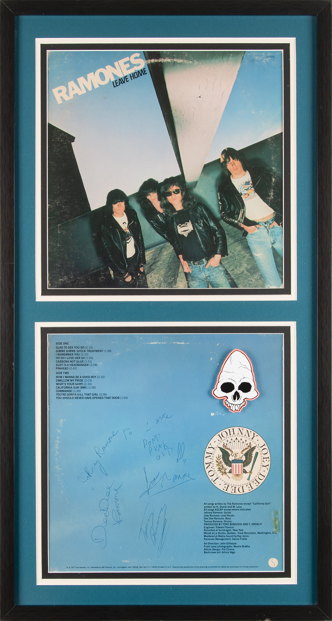 Leaving Home album signed and inscribed on the back cover, "To Lance, Don't punk out!! Joey Ramone," "Johnny Ramone," "Dee Dee Ramone," and "Tommy Ramone." Archivally triple-matted and framed with the album cover under museum glass to an overall size of 17.25 x 32. In very good to fine condition, with some light scuffing, a small old tape remnant, and Johnny writing over a first attempt at his name. Consignor notes that the signatures were obtained in 1977 at Randy's Rodeo in Texas on the Ramones' third tour; includes six original color candids of the band's performance at Randy's Rodeo. Also accompanied by full letters of authenticity from REAL and JSA.