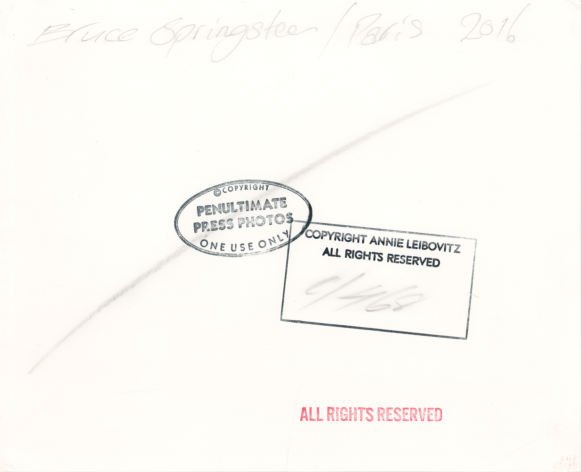 Great color 10.5 x 8.5 photographic print of Bruce Springsteen posing on a Harley-Davidson motorcycle with an American flag hanging in the background, taken by Annie Leibovitz in Paris in 2016. Reverse is stamped "Copyright Annie Leibovitz, All Rights Reserved," "Copyright, Penultimate Press Photos, One Use Only," and annotated in pencil, "Bruce Springsteen / Paris 2016." In fine condition.