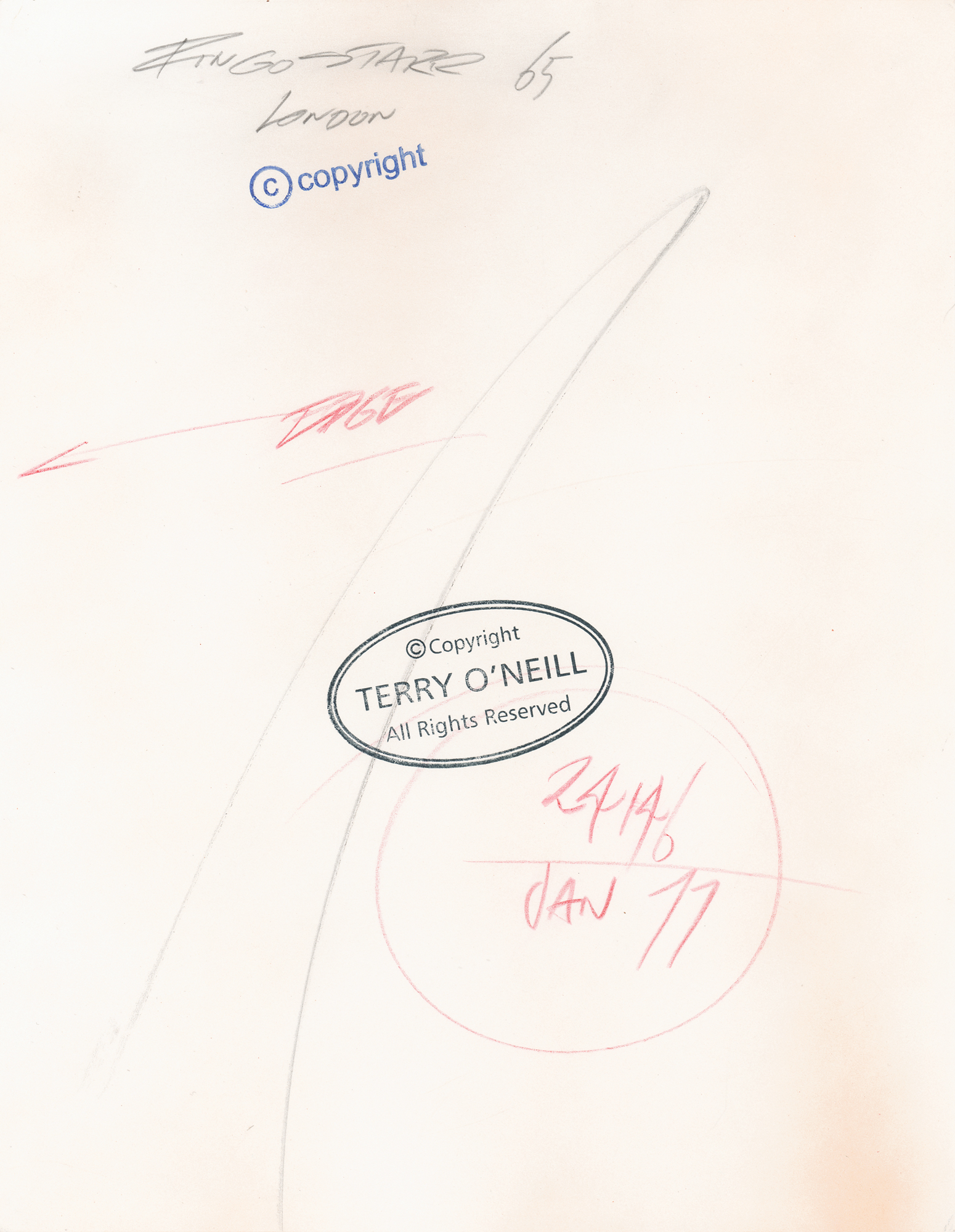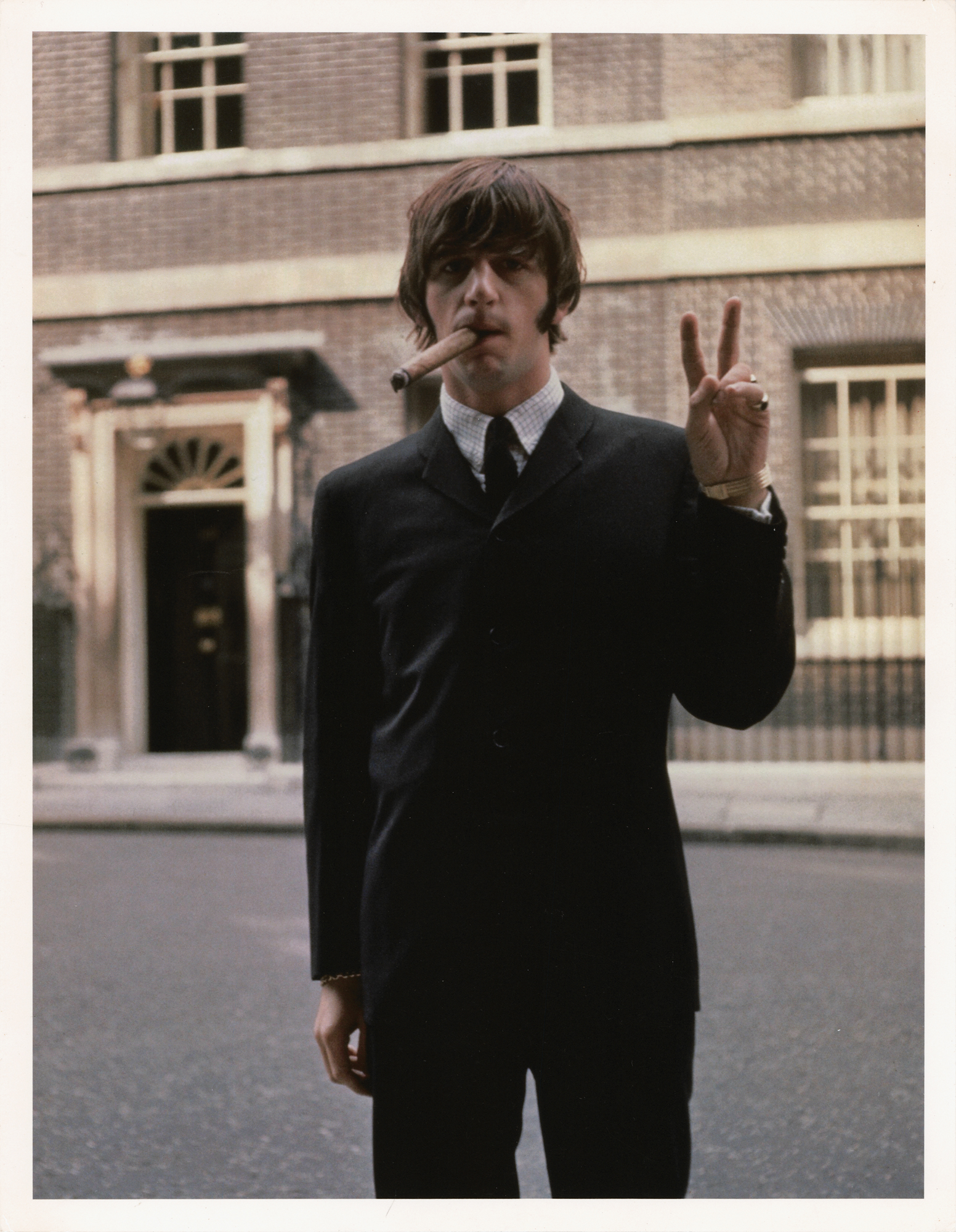 Superb color semi-glossy 8.5 x 11 archival print of Beatles drummer Ringo Star posing outside 10 Downing Street, chomping a cigar and throwing a peace sign, taken by Terry O'Neill in London in 1965. Reverse bears Terry O'Neill's copyright stamp. In fine condition.