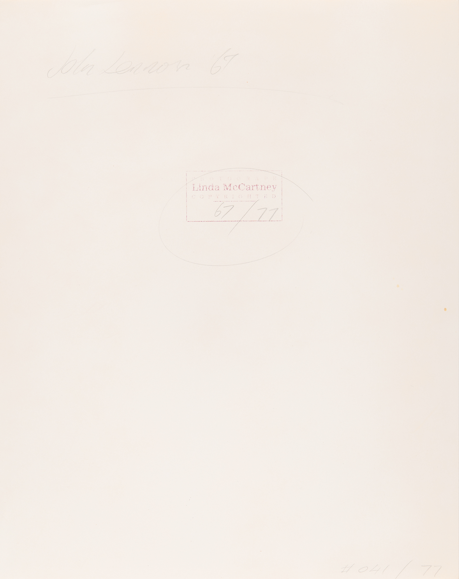 Color semi-glossy 11.5 x 14.5 archival print of John Lennon at the Sgt. Pepper’s Lonely Hearts Club Band launch party, taken in 1967 by Linda McCartney. Reverse is stamped, "Photograph, Linda McCartney, Copyrighted," and annotated in pencil, "John Lennon 67." In fine condition.