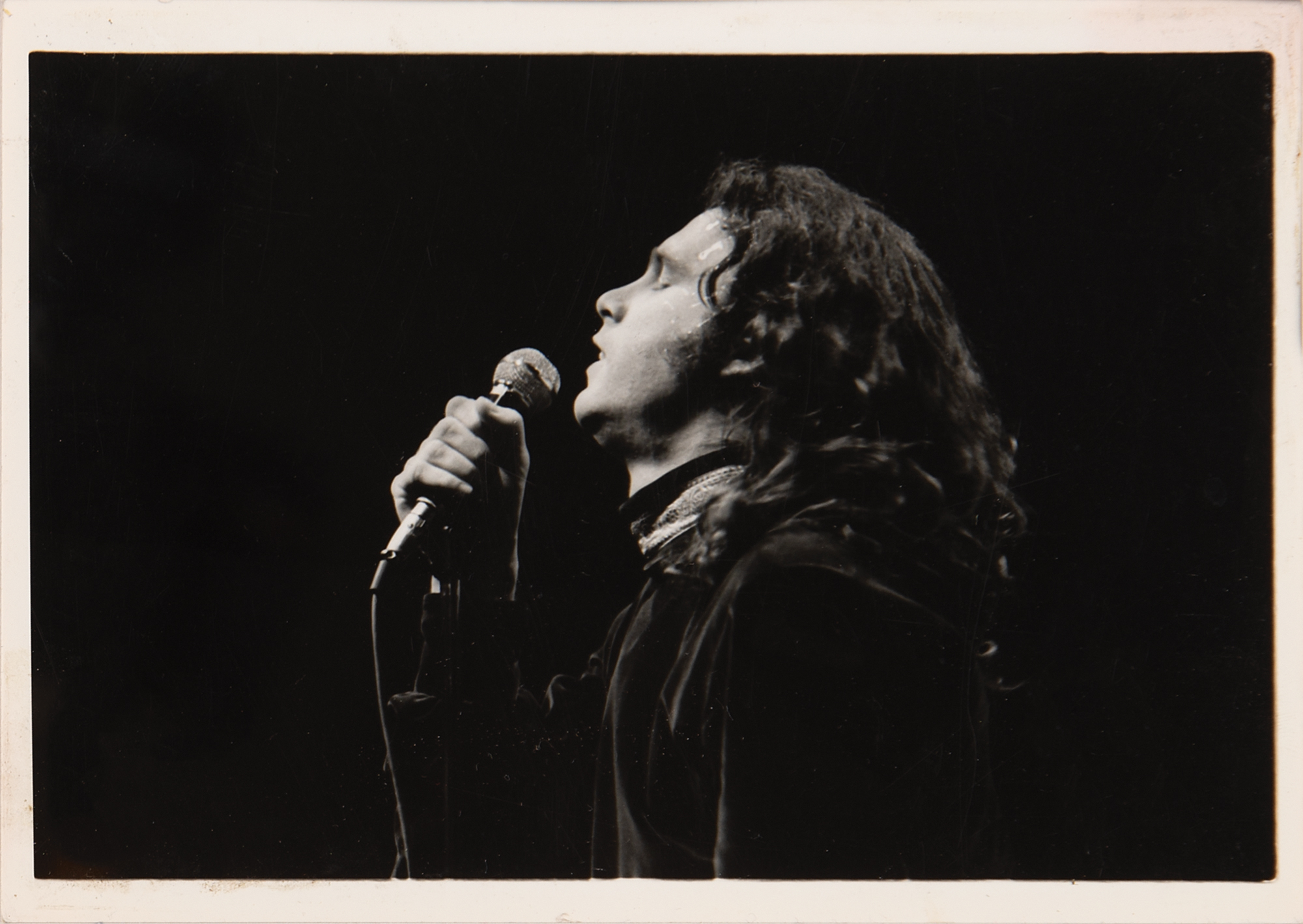Fantastic collection of original photographs of The Doors on stage at Hunter College in New York City on November 24, 1967, taken by great rock photographer Elliott Landy. Includes three original 5 x 7 silver gelatin photos of Jim Morrison with his microphone—one with a psychedelic blurred effect—plus six original 11 x 8.5 silver gelatin contact sheet proof prints of Landy's negatives, primarily containing similar images of Morrison. A few other contact sheet images show band members backstage. The three photos of Morrison bear Landy's copyright stamp on the reverse, with "This Paper Manufactured by Kodak" watermarks. In overall fine condition.