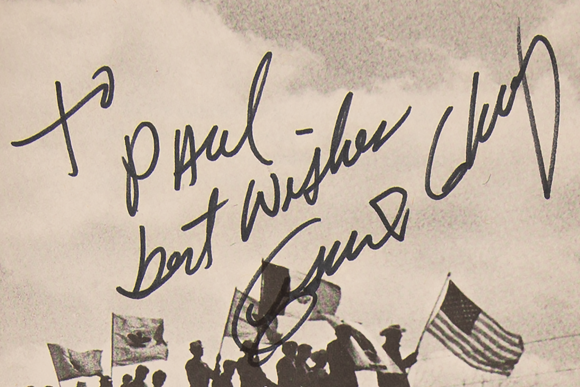 American labor leader and civil rights activist (1927–1993) who, with Dolores Huerta, co-founded the National Farm Workers Association in 1962. Signed book: Cesar Chavez: Autobiography of La Causa. First edition. NY: W. W. Norton, 1975. Hardcover with dust jacket, 6.25 x 9.5, 546 pages. Signed and inscribed on the title page in black felt tip, "To Paul—best wishes, Cesar Chavez." In fine condition, with a price-clipped dust jacket.