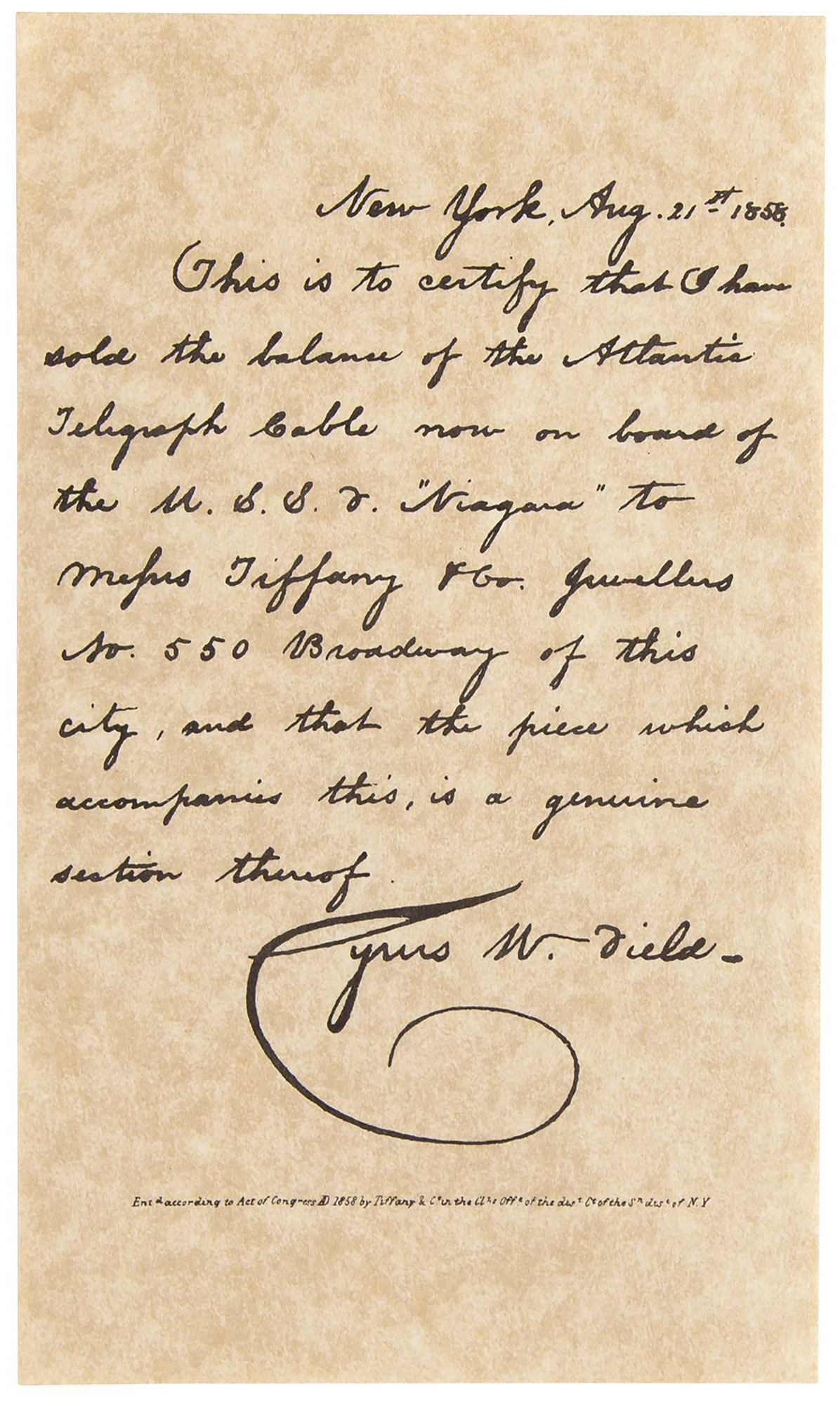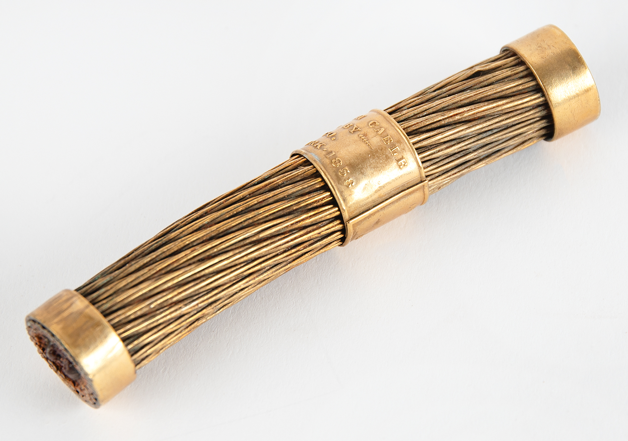 Segment of the first transatlantic telegraph cable from 1858, measuring 4" long, made into a souvenir and sold by Tiffany & Co. The cable is wrapped with a brass band, reading: "Atlantic Telegraph Cable, Guaranteed by Tiffany & Co., Broadway, New York, 1858." Includes the original wooden presentation box, 6˝ x 3˝ x 2˝, and a facsimile letter by Cyrus W. Field, dated August 21, 1858, which reads: "This is to certify that I have sold the balance of the Atlantic Telegraph cable now on board of the U.S.S.V. Niagara to Messrs Tiffany & Co. Jewellers No. 550 Broadway of this city, and that the piece which accompanies this is a genuine section thereof." In very good to fine condition.