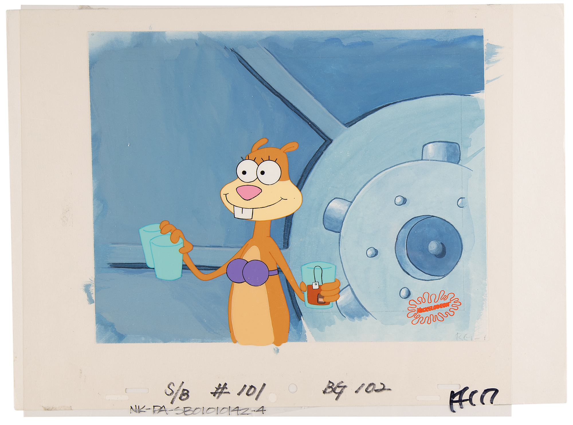 (Nickelodeon, 1999) Original production cel featuring Sandy Cheeks from the 'Tea at the Treedome' episode of the first season of SpongeBob SquarePants, placed on a master production background from same episode, showing the undersea squirrel at home in her air-filled treedome, serving tea. Character image measures 5 x 5.25, with overall dimensions of 14 x 10.5. In fine condition.