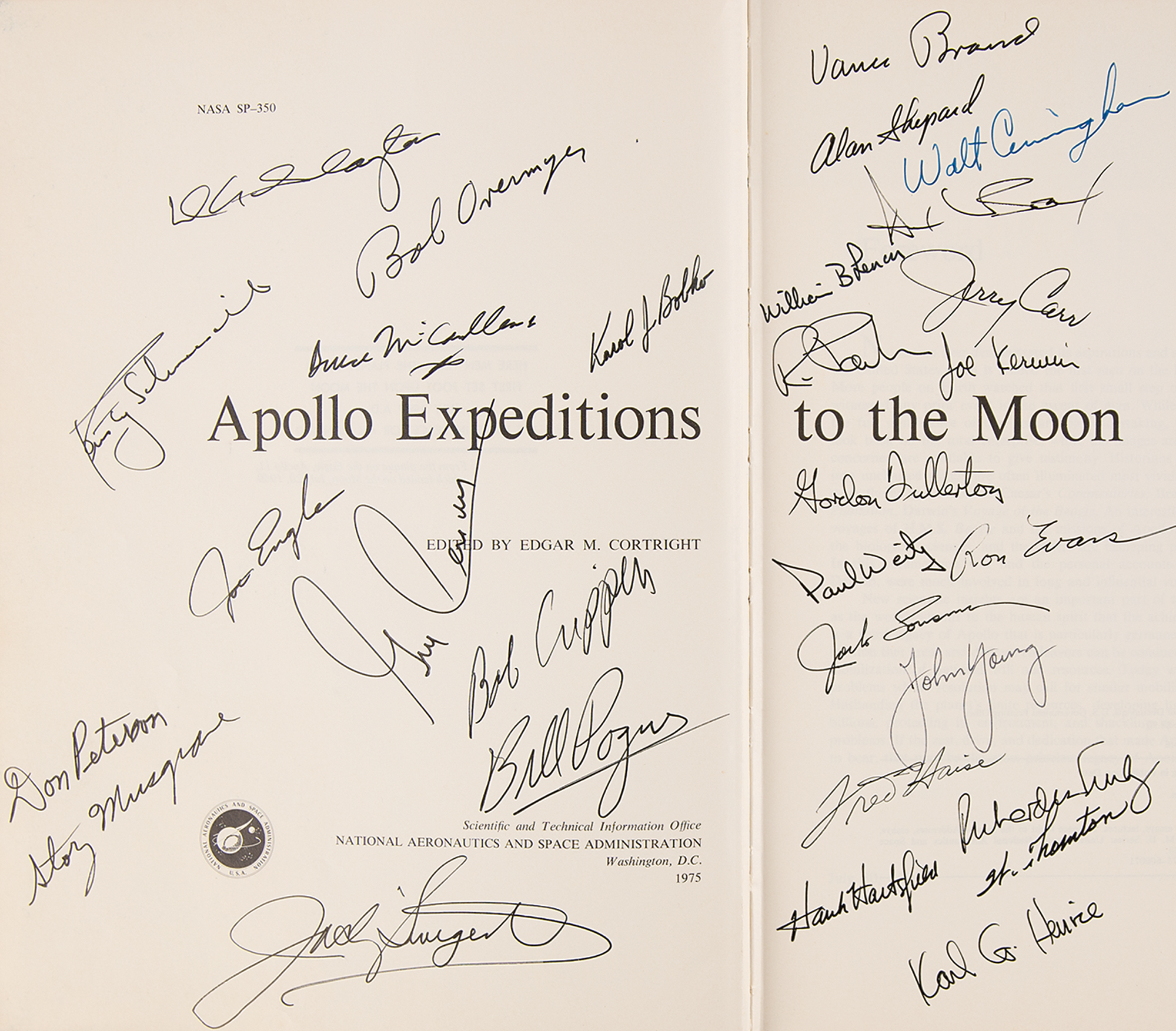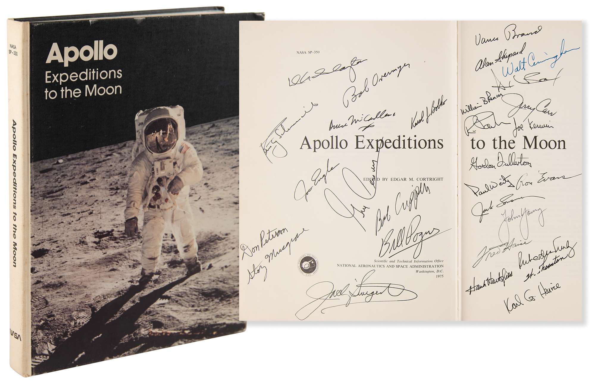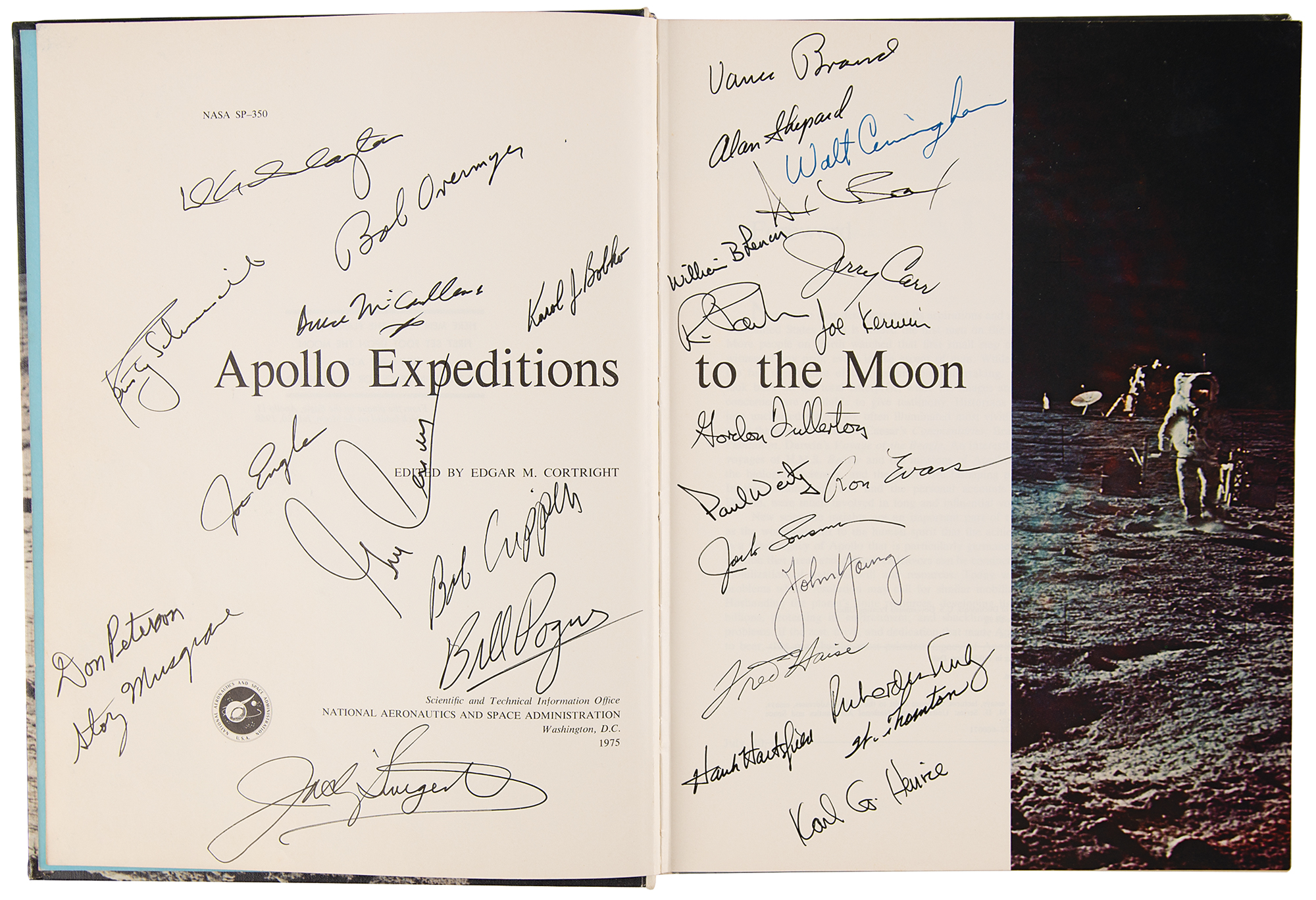 Multi-signed book: Apollo Expeditions to the Moon. First edition. Washington, DC: NASA, 1975. Hardcover, 9 x 12, 313 pages. Signed on the title pages in blue and black felt tip by 30 astronauts. Signers are: Alan Bean, Karol J. Bobko, Vance Brand, Jerry Carr, Gene Cernan, Bob Crippen, Walt Cunningham, Joe Engle, Ron Evans, Gordon Fullerton, Fred Haise, Hank Hartfield, Karl G. Henize, Joe Kerwin, William B. Lenoir, Jack Lousma, Bruce McCandless, Story Musgrave, Bob Overmeyer, Robert A. Parker, Don Peterson, Bill Pogue, Rusty Schweickart, Alan Shepard, Deke Slayton, Jack Swigert, William Thornton, Richard Truly, Paul Weitz, and John Young. In fine condition. Accompanied by a full letter of authenticity from Zarelli Space Authentication.