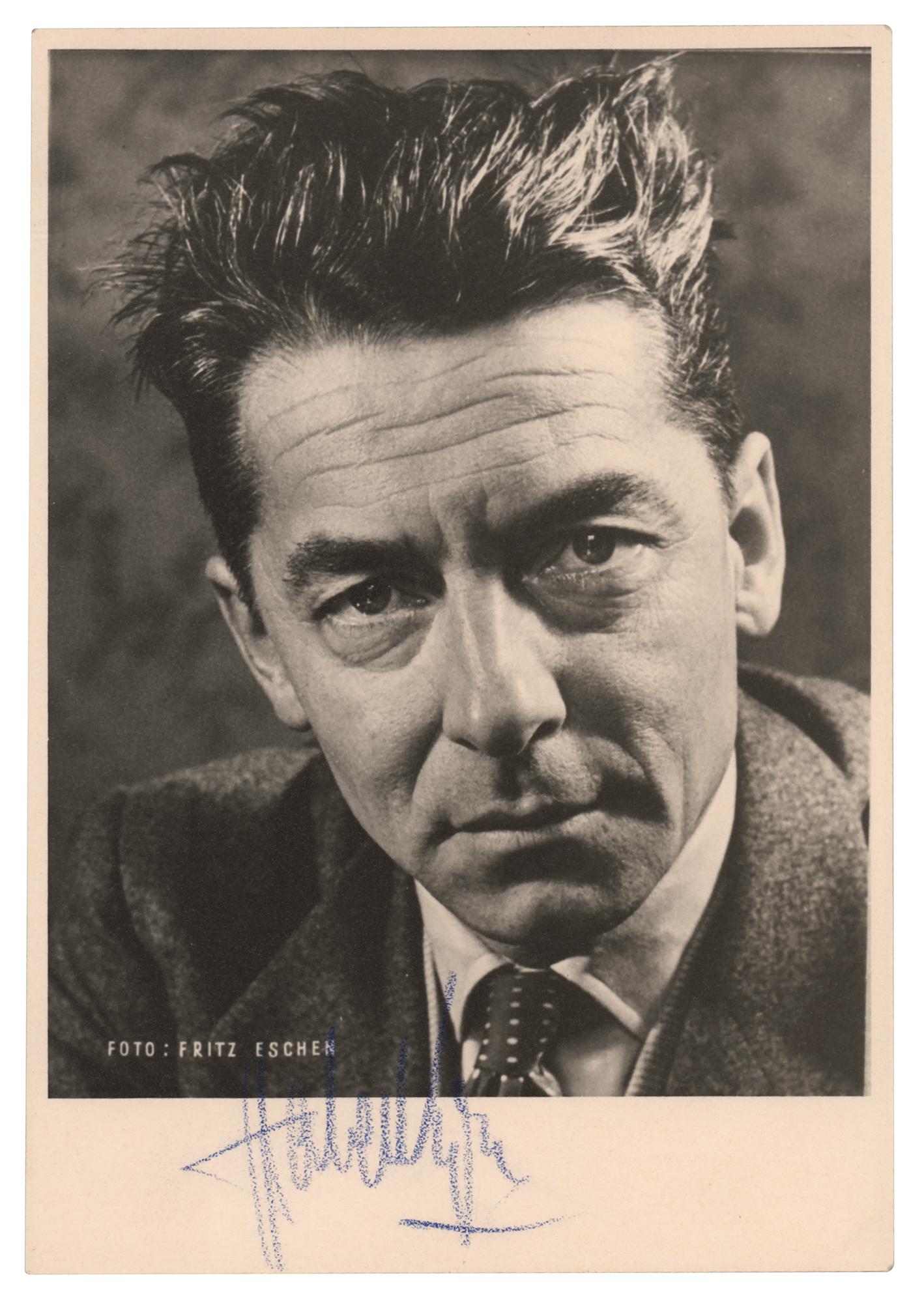 Austrian orchestra and opera conductor (1908-1989) regarded as one of the greatest of the 20th century. Handsome vintage matte-finish 4 x 5.75 postcard photo featuring a portrait of the conductor by Fritz Eschen, signed in the lower border in blue indelible pencil. In very fine condition.