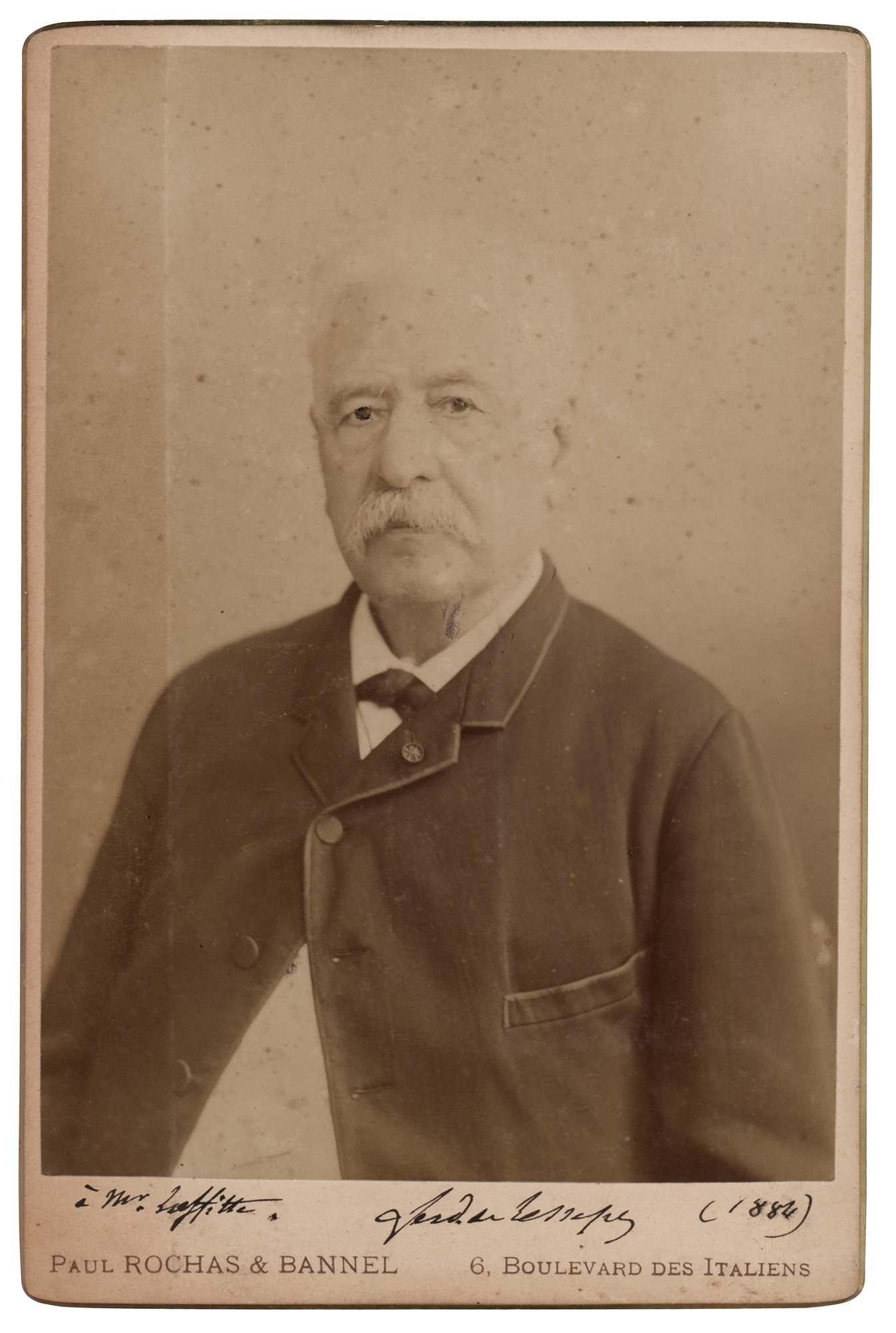 French diplomat (1805–1894) who spearheaded the project to build the Suez Canal. Striking 4.25 x 6.5 cabinet photo of Ferdinand de Lesseps by Paul Rochas & Bannel of Paris, signed and inscribed on the mount in crisp black ink, "A Mr. Laffitte, Ferd. de Lesseps (1884)." In fine condition, with some light surface impressions.