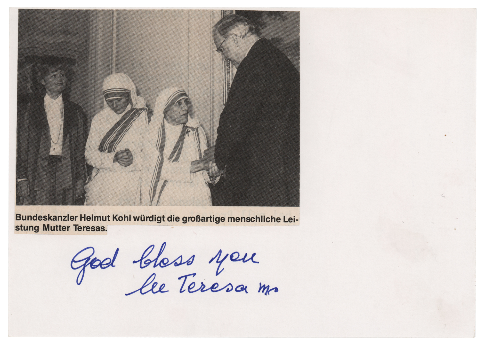 Felt tip signature, "God bless you, M Teresa mc,” on a white 5.75 x 4 card bearing an affixed newspaper clipping. In very fine condition.