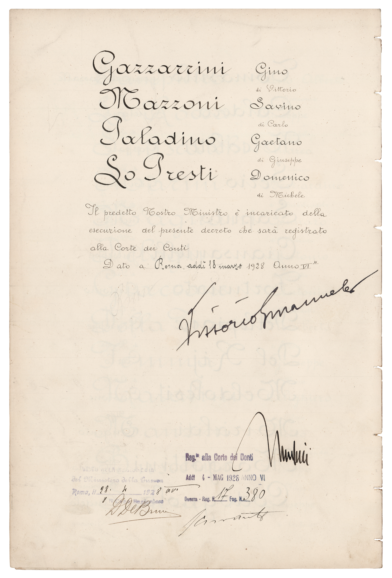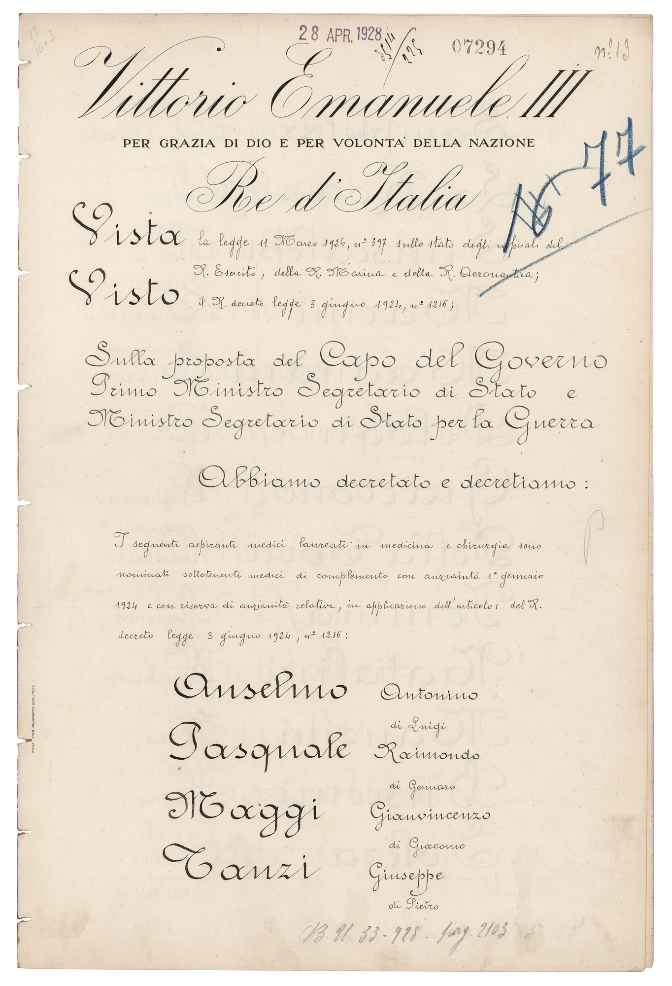 Manuscript DS in Italian, signed “Mussolini" and "Vittorio Emanuele,” four pages on two adjoining sheets, 9.75 x 14.5, March 18, 1928. Document appointing a long list of graduates as medical officers, in part: "On the proposal of the Head of Government, Prime Minister and Secretary of State, and the Minister and Secretary of State for War, We have decreed and do decree: The following medical applicants, graduates in medicine and surgery, are appointed as assistant medical officers with seniority from January 1, 1924, and with the right of future seniority accrual, in application of Article 1 of the Royal Decree-Law of June 8, 1924, No. 1216." Prominently signed at the conclusion in ink by Benito Mussolini and Vittorio Emanuele III. In fine condition.