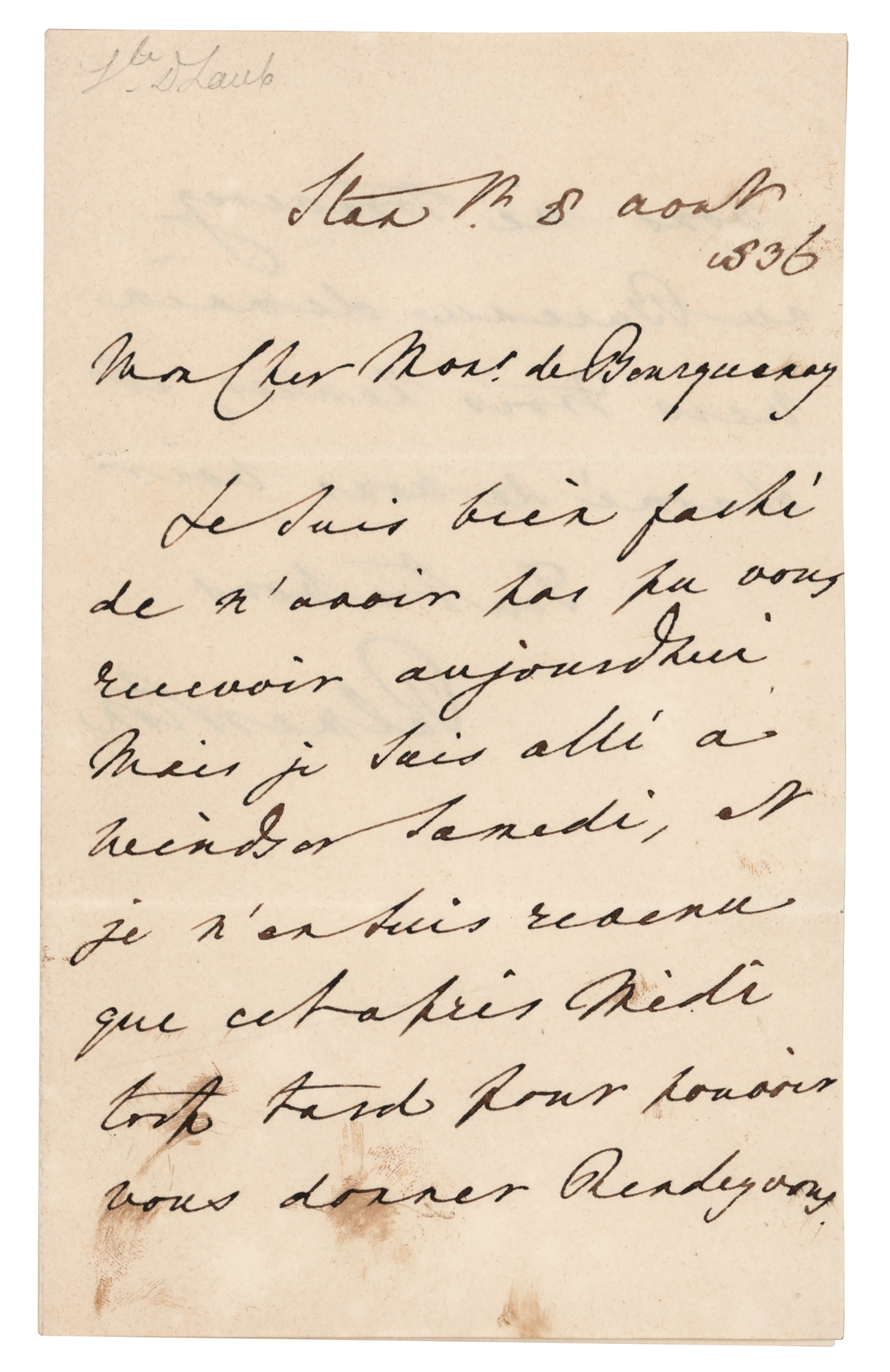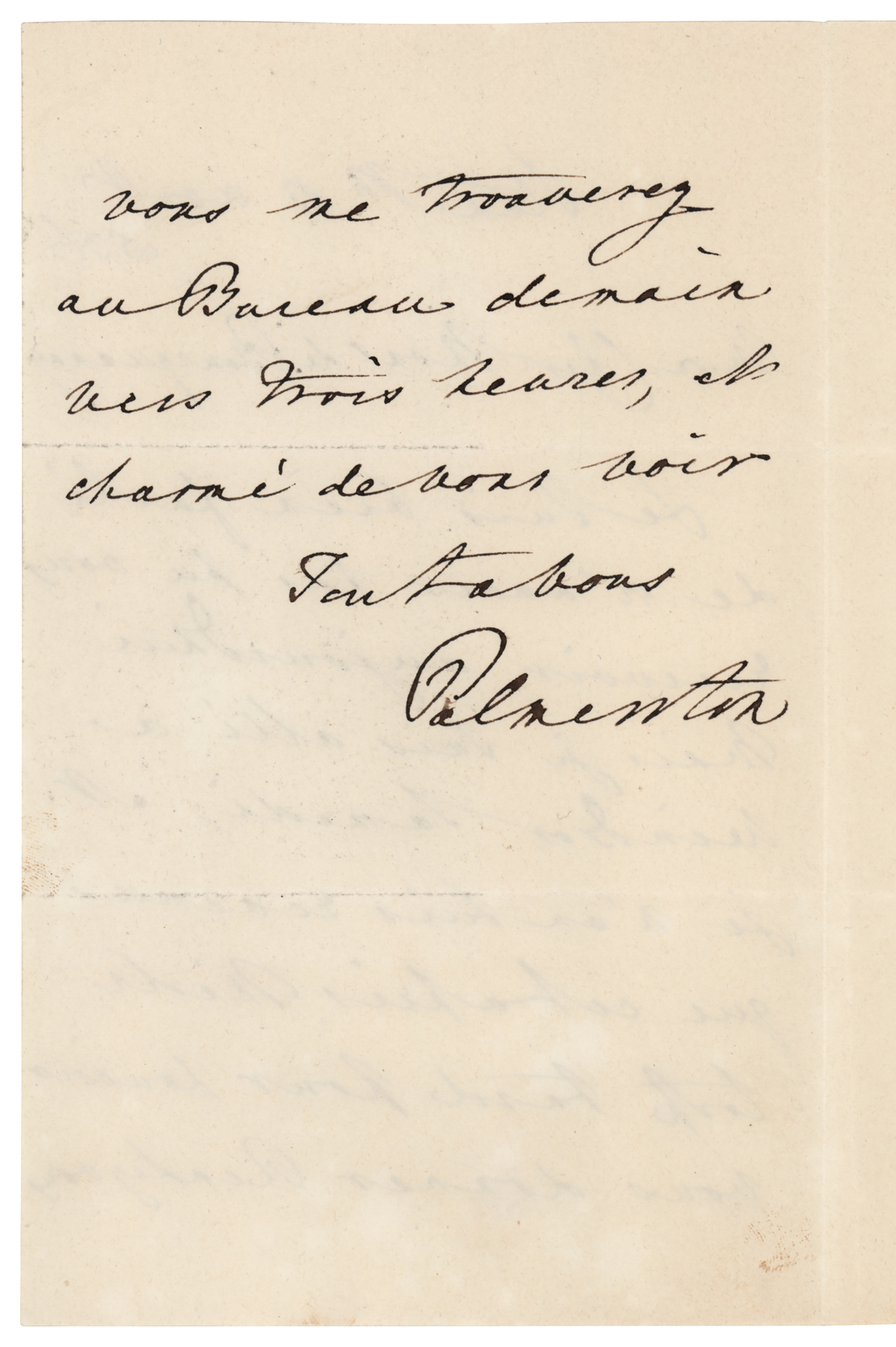 British statesman (1784-1865) who served twice as Prime Minister of the United Kingdom in the mid-19th century. ALS in French, signed “Palmerston,” one page both sides, 4.25 x 7, August 8, 1836. Untranslated handwritten letter by Palmerston. In fine condition, with a few small stains on the first page.