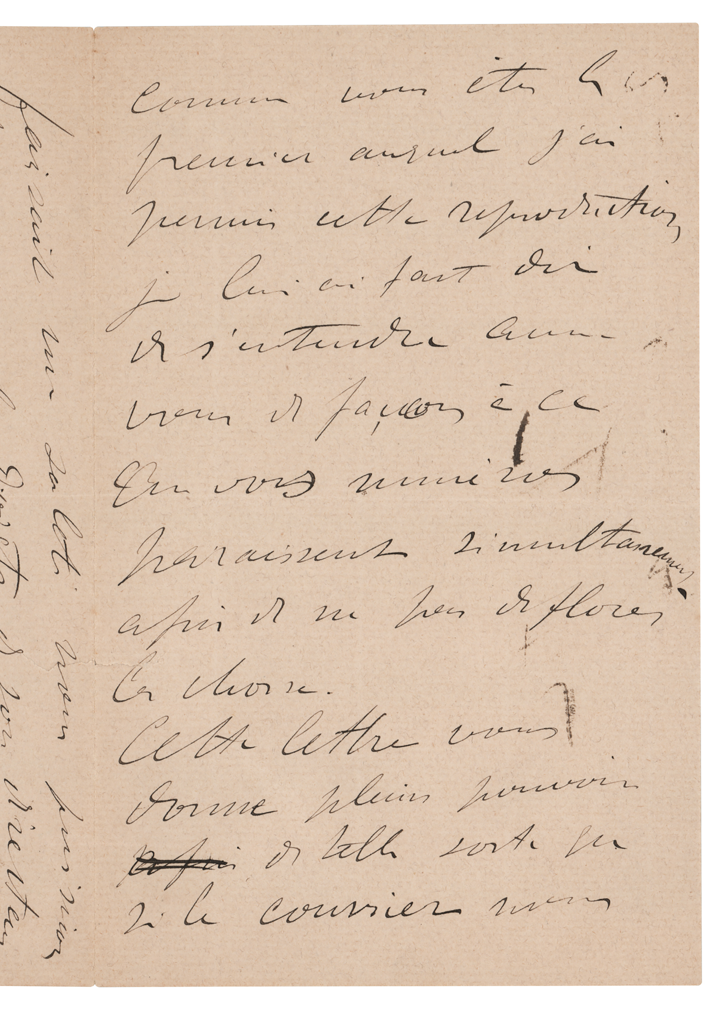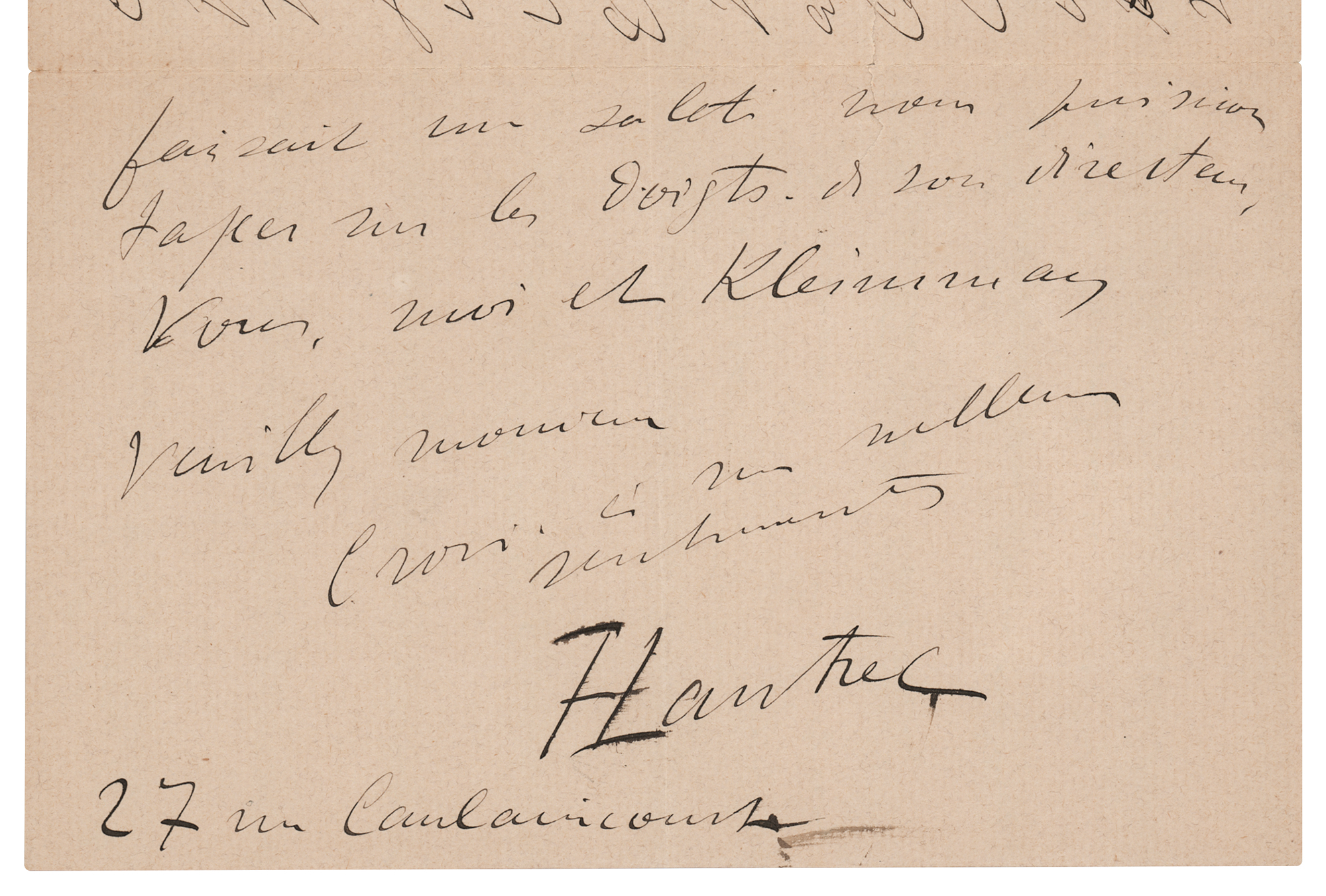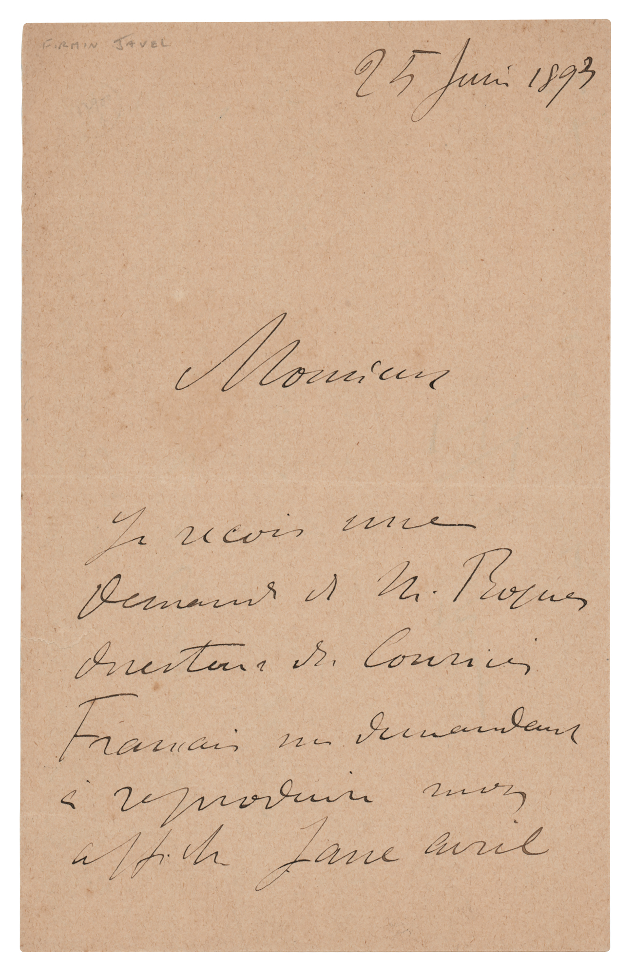 ALS in French, signed “H-T-Lautrec,” three pages on two adjoining sheets, 4.25 x 7, June 25, 1893. Handwritten letter, in part: "I have received a request from Mr. [Jules] Roques, director of the Courrier français, asking me to reproduce a Jane Avril poster. As you are the first to whom I promised this reproduction, I have sent word to him to arrange with you so that your issues appear simultaneously so as not to spoil the matter." In fine condition, with a short tear to one edge.