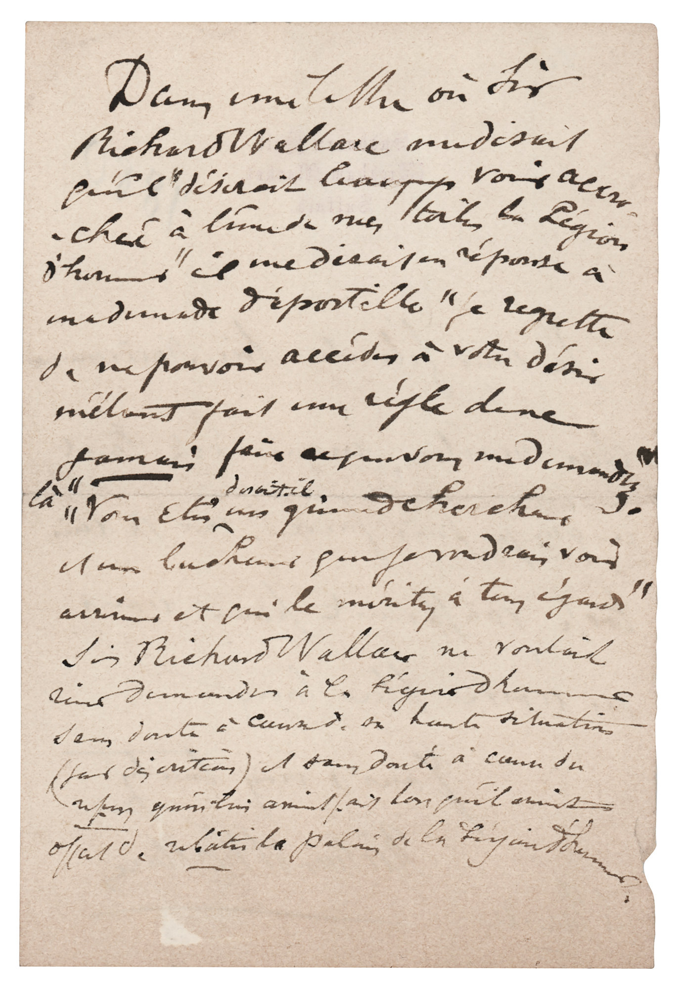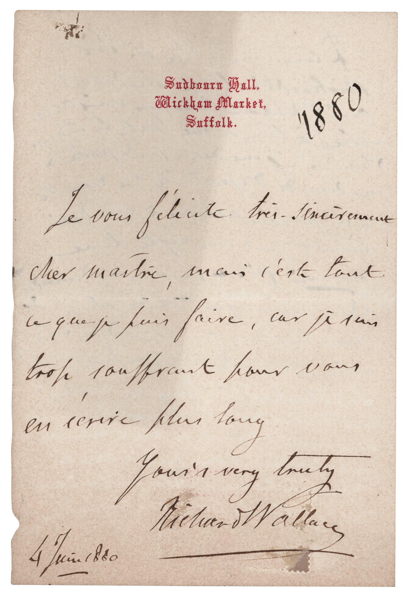 British aristocrat, art collector, and Francophile (1818–1890) who built one of the greatest private art collections in the world. ALS in French, one page, 4 x 6, Sudbourn Hall letterhead, June 4, 1880. Untranslated handwritten letter by Wallace, with annotations on the reverse in another hand. In very good to fine condition, with irregular light toning.