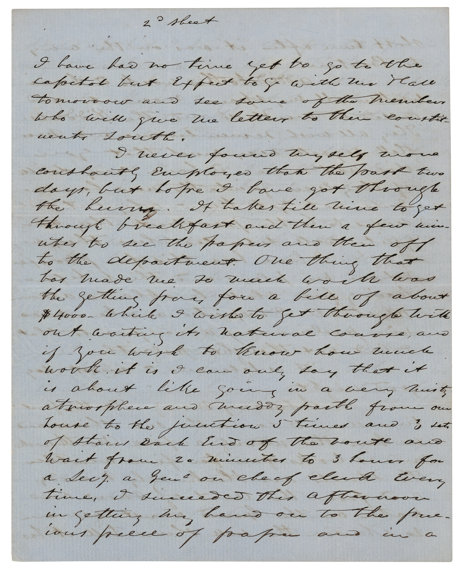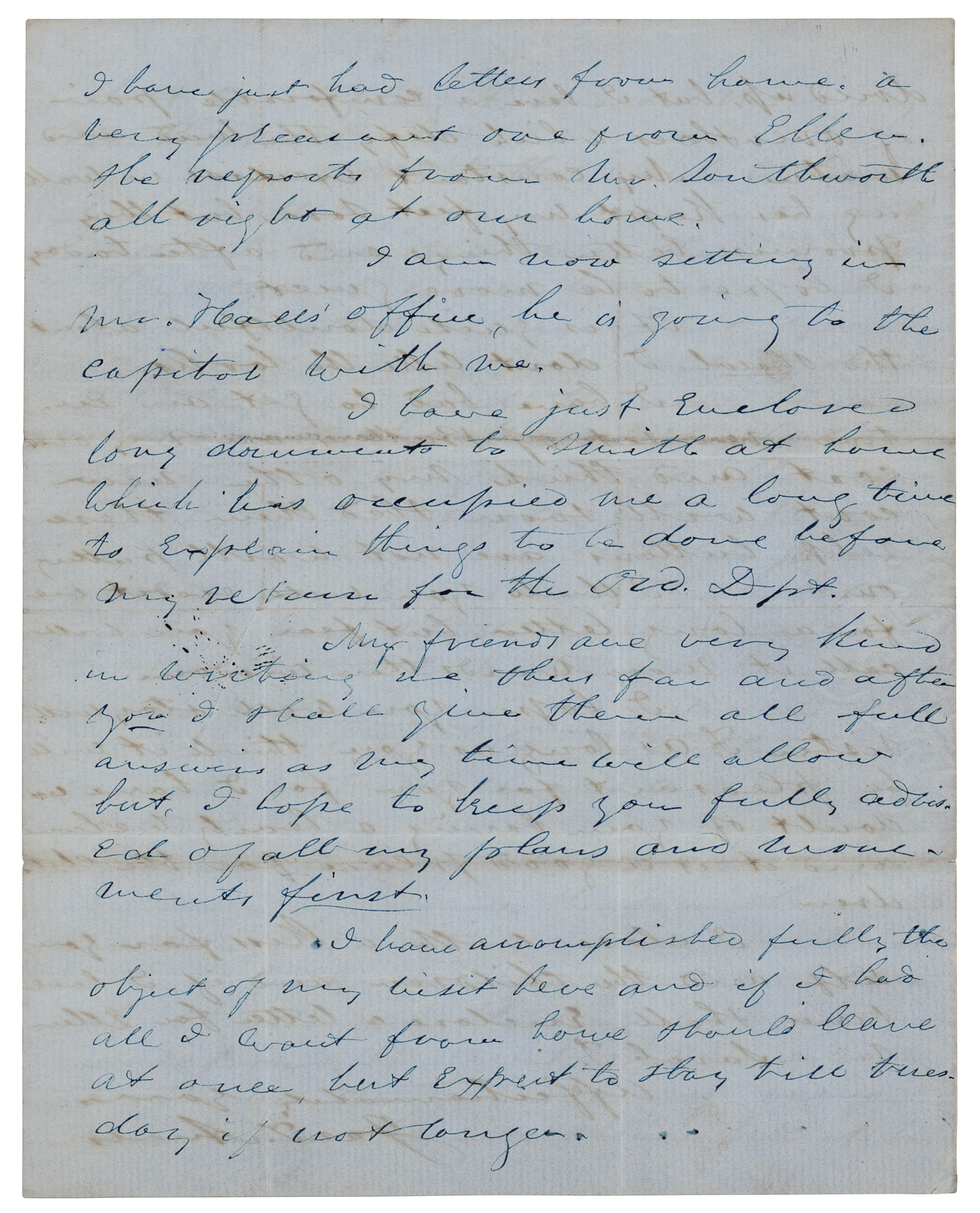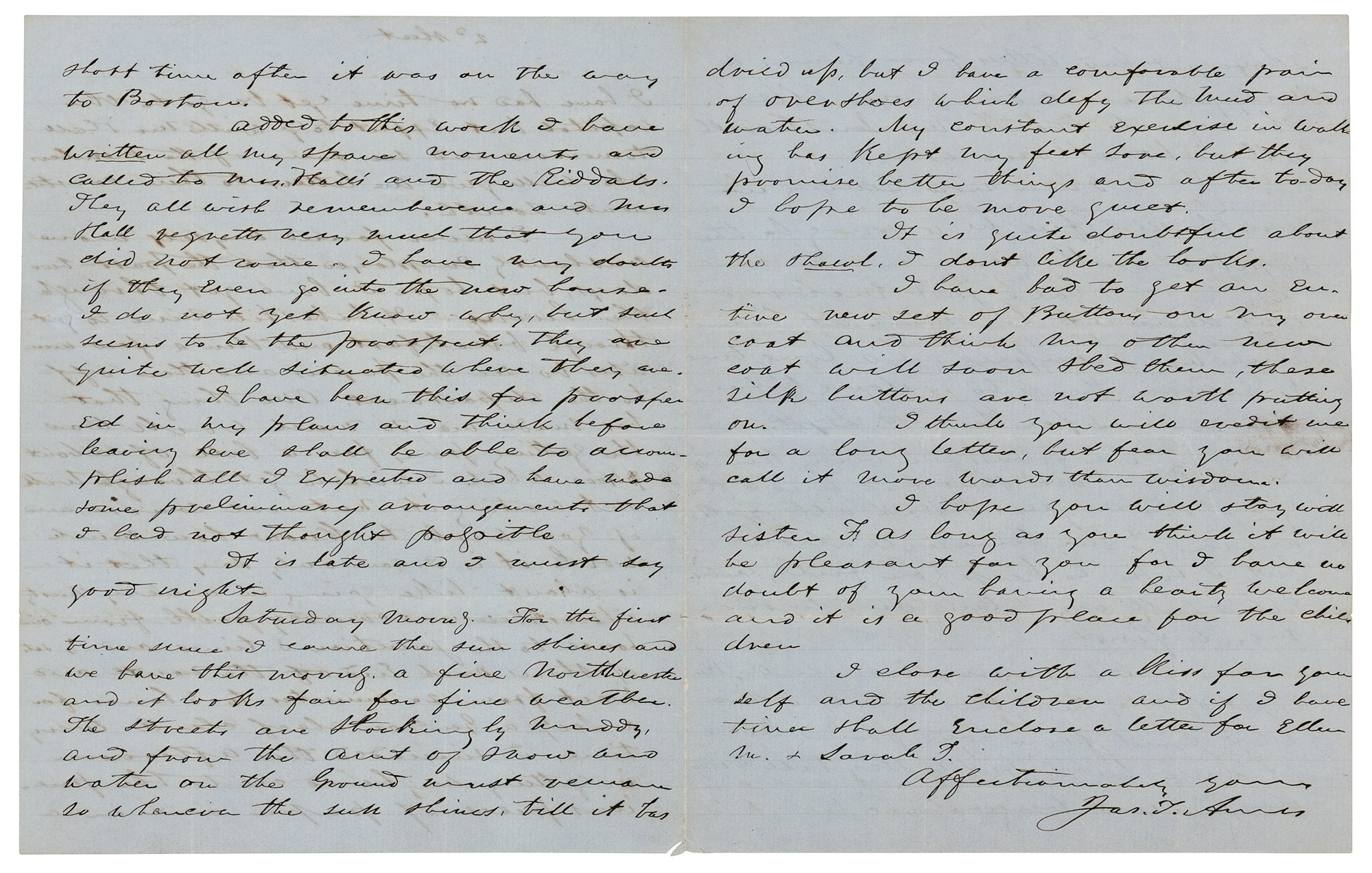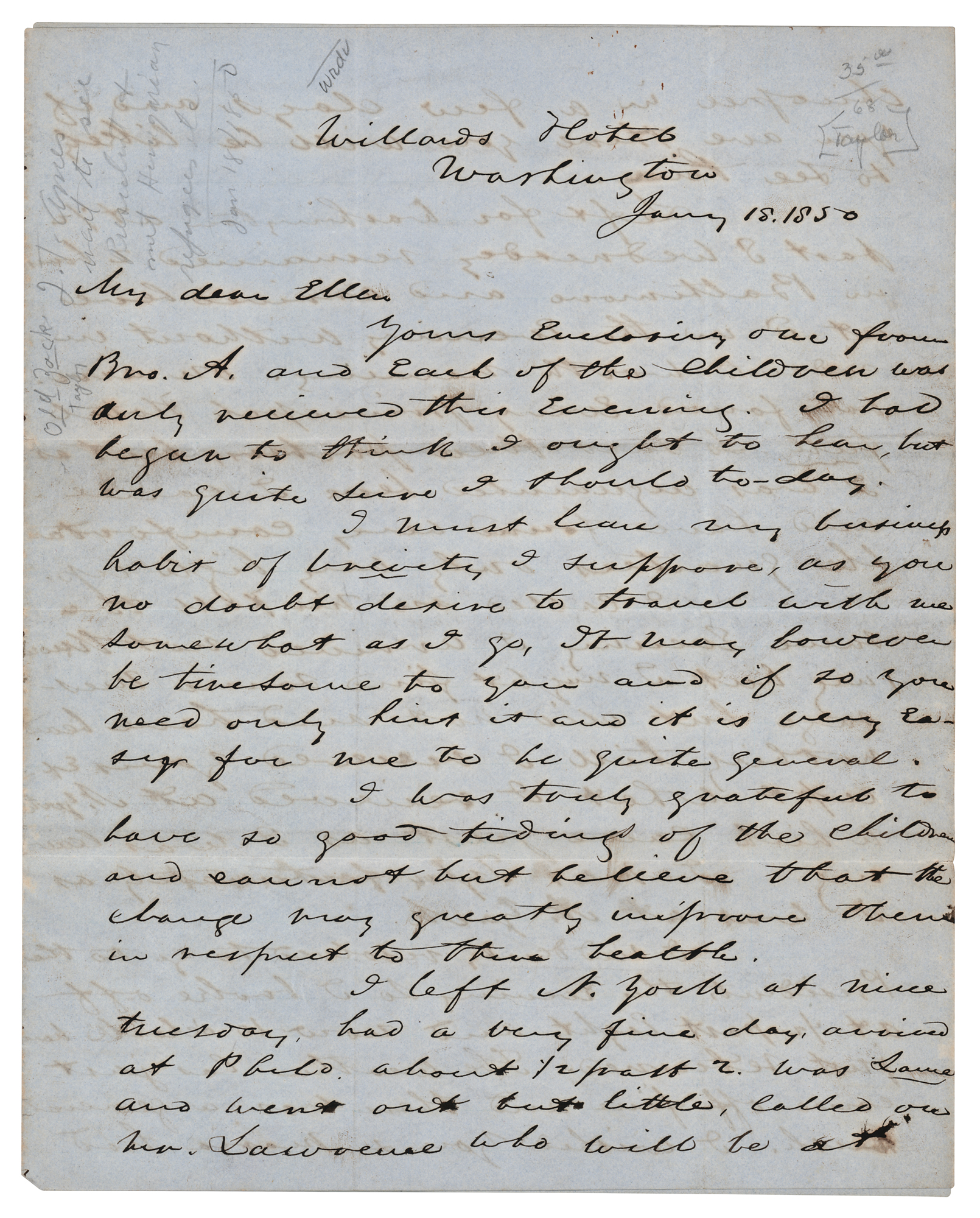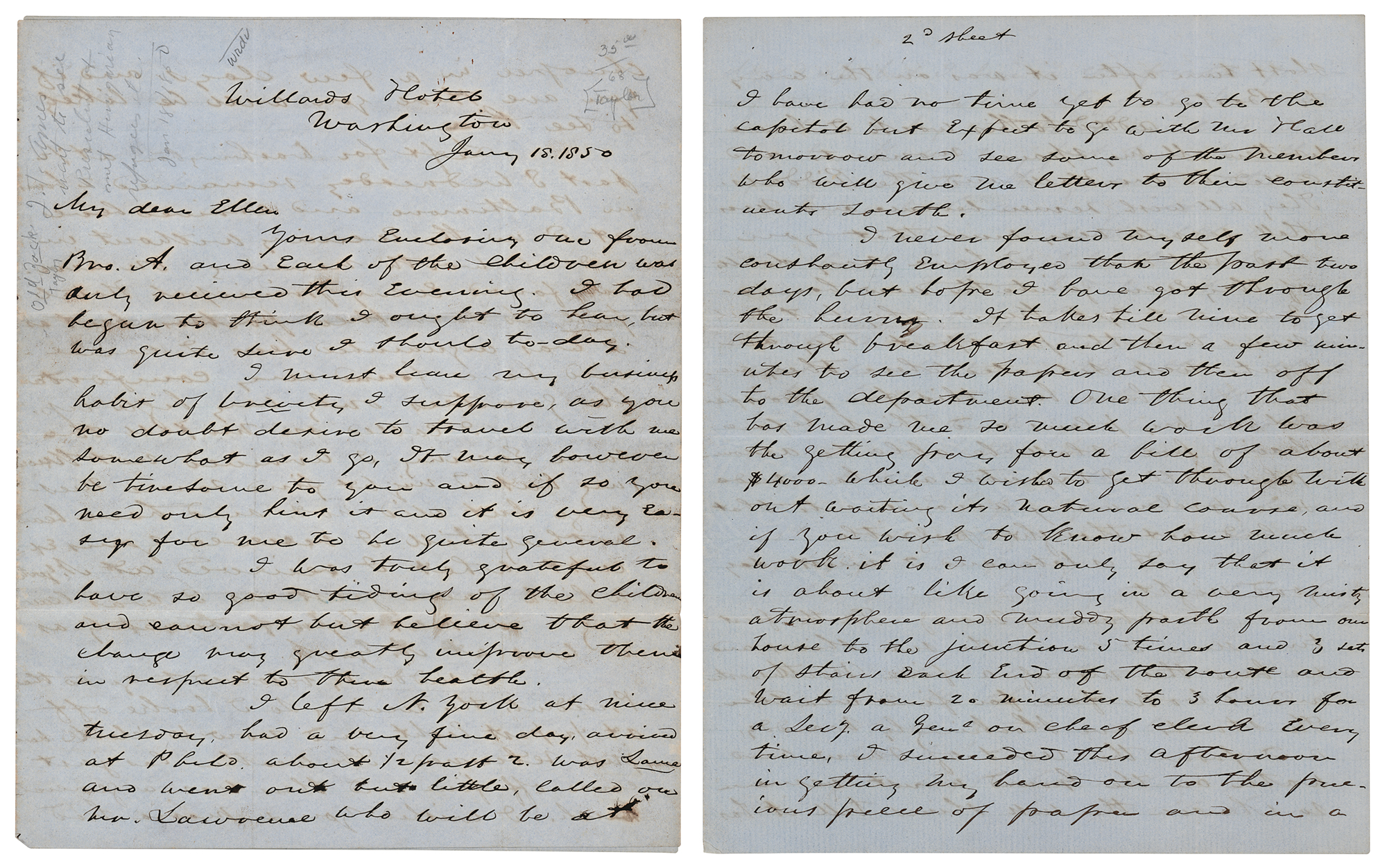 Industrialist (1810-c. 1885) who co-founded the Ames Manufacturing Company, which produced arms, swords, and light artillery during the Civil War. ALS signed “Jas. T. Ames,” eight pages, 8 x 10, January 18, 1850. Lengthy handwritten letter to his wife, Ellen, describing his trip to Washington, the climate, and his impressions of the city. He details particularly his visit with President Taylor: “I went without company or gloves determined to look at men and manners. On entering the Green Room, which you will recollect, I had a hearty grasp from the President with a pleasant salutation. Just back of him stood Maj. Bliss and Old Zack's daughter Betty." He expounds on Mrs. Bliss' charm and kindness: “She is simple in manners and dress, not having anything that would attract particular notice, but every faculty was exercised to adopt herself to the various persons introduced and she had what I believe is real politeness because it seemed to come from a good common sense guided by real kindness.” In fine condition.