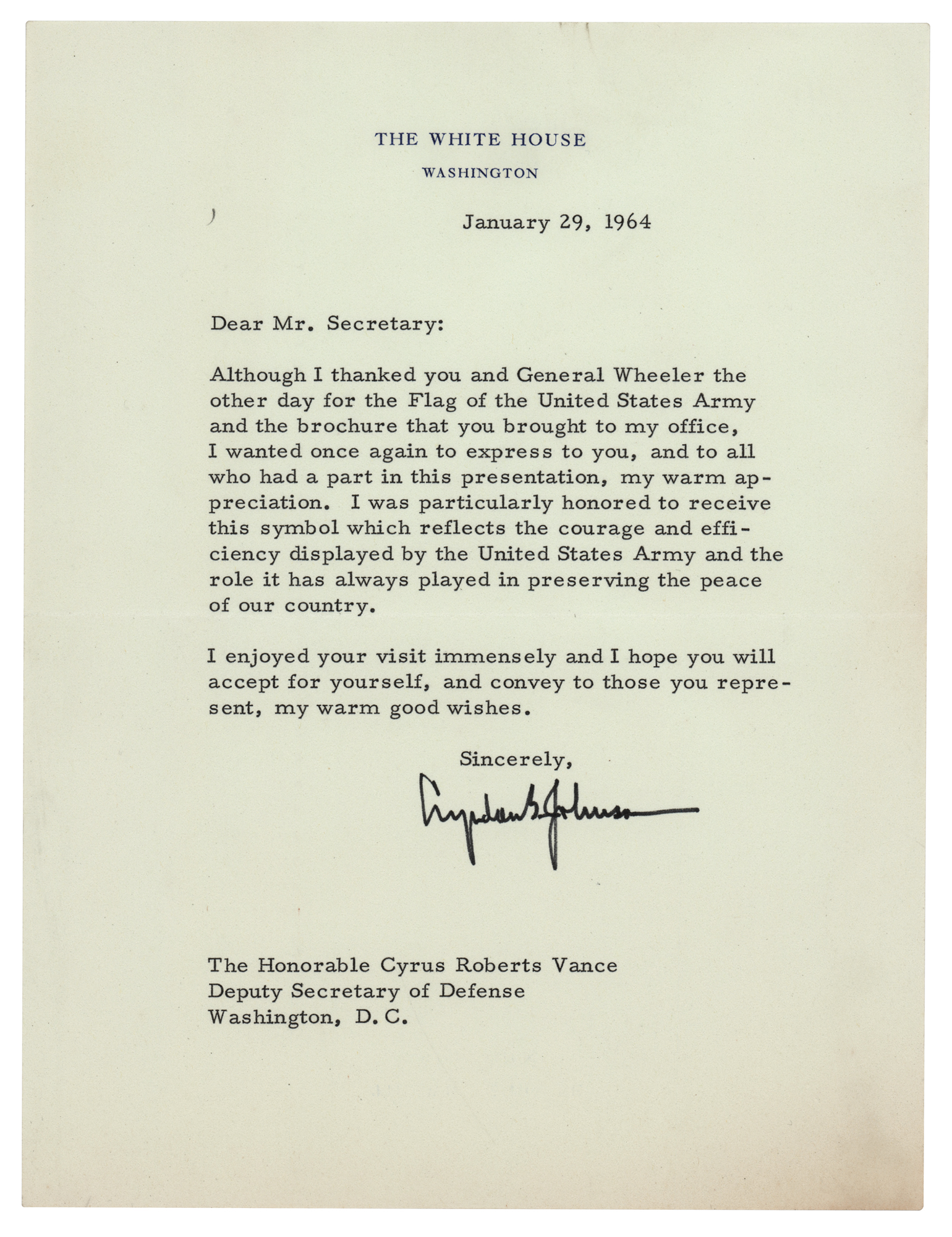 War-dated TLS as president, one page, 6.75 x 8.75, White House letterhead, January 29, 1964. Letter to Deputy Secretary of Defense Cyrus Roberts Vance, in full: “Although I thanked you and General Wheeler the other day for the Flag of the United States Army and the brochure that you brought to my office, I wanted once again to express to you, and to all who had a part in this presentation, my warm appreciation. I was particularly honored to receive this symbol which reflects the courage and efficiency displayed by the United States Army and the role it has always played in preserving the peace of our country. I enjoyed your visit immensely and I hope you will accept for yourself, and convey to those you represent, my warm good wishes.” In fine condition. Accompanied by the original mailing envelope.