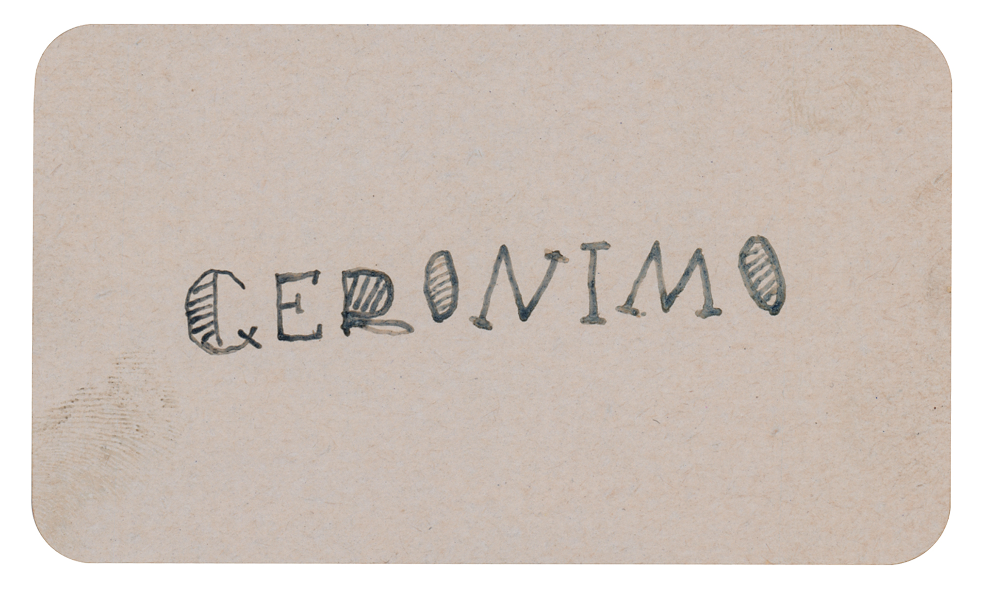Magnificent ink signature, “Geronimo,” on an off-white 4 x 2.25 card, which is accompanied by an ALS from noted Native American portrait painter Elbridge Ayer Burbank, signed “E. A. Burbank,” one page, both sides, 5 x 8, April 19, 1897, handwritten from Fort Sill, Oklahoma, and addressed to Mr. Dyche, in part: “I do not know when will return to Chicago not for a few weeks…I am having a fine time here with the Indians painting them. There are 3000 of them where I am and find them pretty good models am painting them in their genuine Indian costumes which is very picturesque. Have painted two pictures of Chief Geronimo, old Appache Chief he is a prisoner of war here.” In fine condition. Accompanied by a full letter of authenticity from PSA. A beautiful signature from the storied Apache leader, whose ink autographs are far rarer than their graphite counterparts.