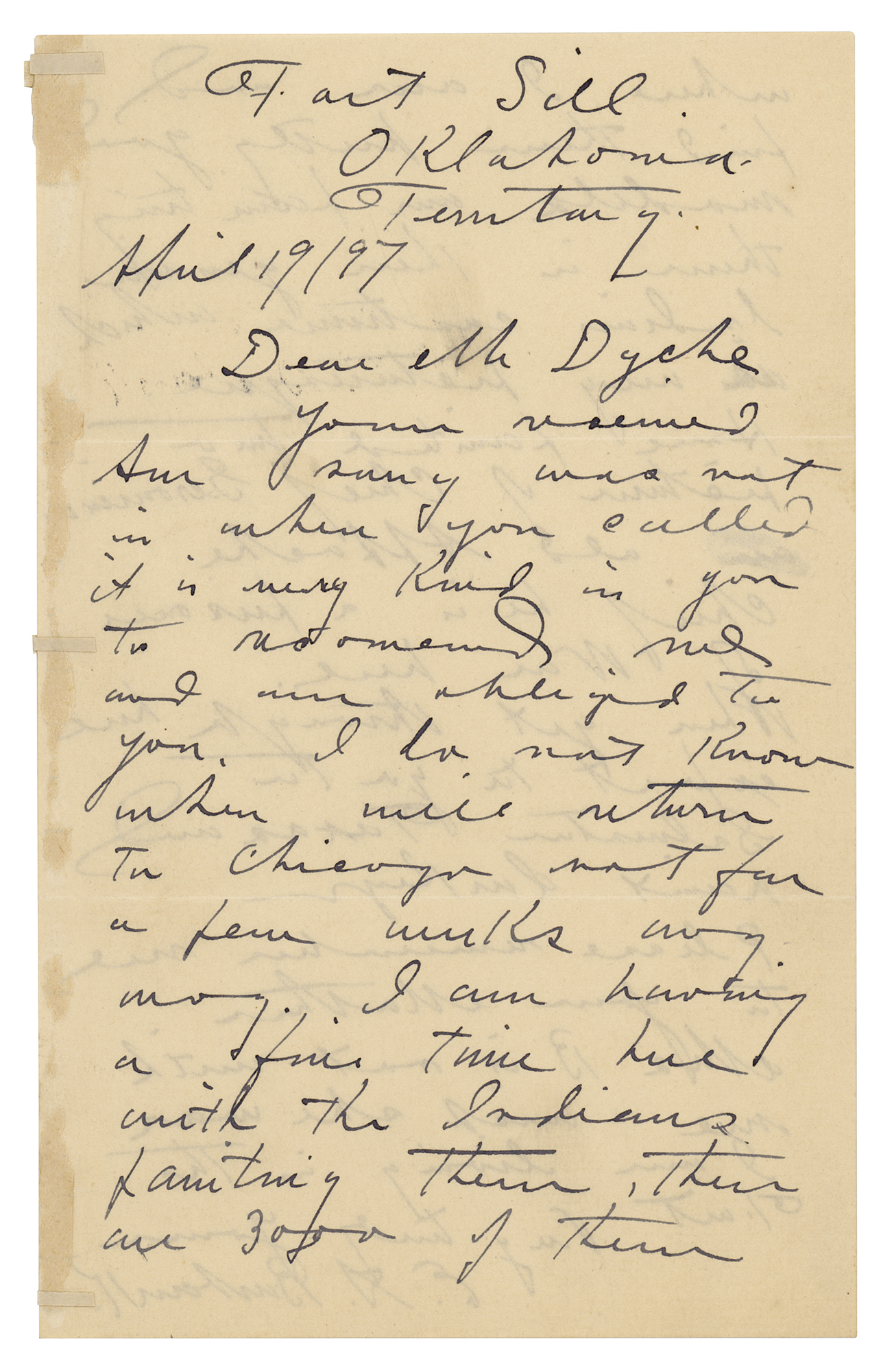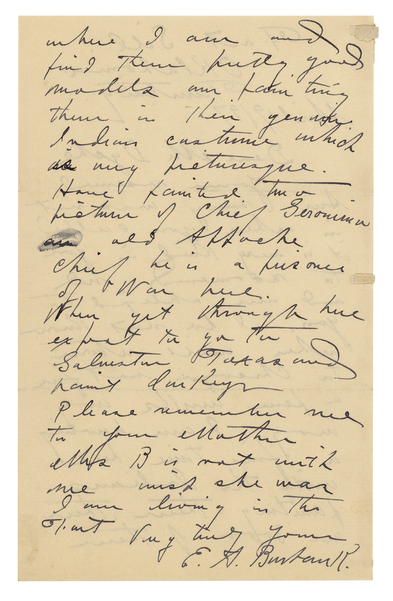 Elbridge Ayer (E. A.) Burbank (1858–1949) was an American artist who sketched and painted more than 1200 portraits of Native Americans from 125 tribes. He is believed to be the only person to paint the war chief Geronimo from life, which he did a total of seven times. Burbank’s first sittings with Geronimo occurred in 1897, the very year of the offered letter.