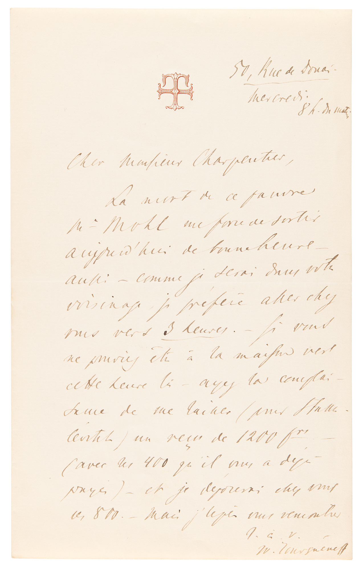 Highly influential Russian author (1818–1883) whose 1862 novel Fathers and Sons remains one of the pillars of 19th-century literature. ALS in French, signed “Iv. Tourgueneff,” one page, 5 x 8, personal cross-style monogrammed letterhead, no date [circa January 1876]. Addressed from “Rue de Douai” in Paris, a handwritten letter sent to “Monsieur Charpentier,” ostensibly Georges Charpentier (1846-1905), the French publisher of Emile Zola, Gustave Flaubert, and Guy de Maupassant, and champion of Impressionist painters. In full (translated): “The death of poor Mr. Mohl forces me to go out early today, so as I will be in your neighbourhood, I prefer to go to your place around 3 o'clock. If you can't be at home at this time of day, please could you leave me (for Stanilevitch) a receipt for 1200 francs (with the 400 he has already paid you) – and I will leave the 800 with you. But I hope to see you.” In very fine condition. An attractively penned handwritten letter from the great Russian scribe, who was then in the midst of writing Virgin Soil, his sixth and final novel, which was published the following year.