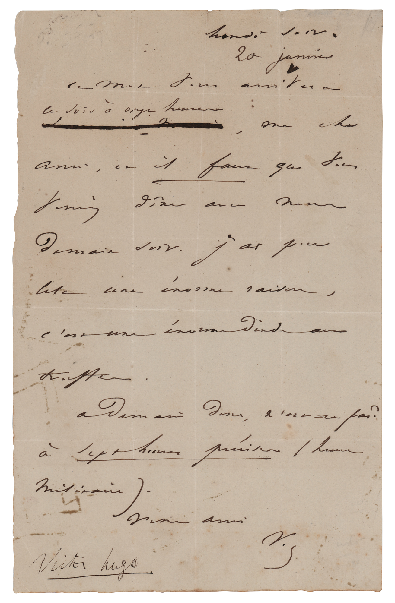 ALS in French, signed “V. H.,” one page, 5 x 8, January 20. Penned on “Monday evening,” a handwritten letter from Hugo inviting his correspondent to a special dinner, in full (translated): “This word will reach you this evening at eleven o'clock, my dear friend, and you must come and have dinner with us tomorrow evening, I have an enormous reason for that, it is an enormous turkey with truffles. See you tomorrow then, isn't it? At seven o'clock sharp - military time. Your friend.” In fine condition, with multiple intersecting folds.