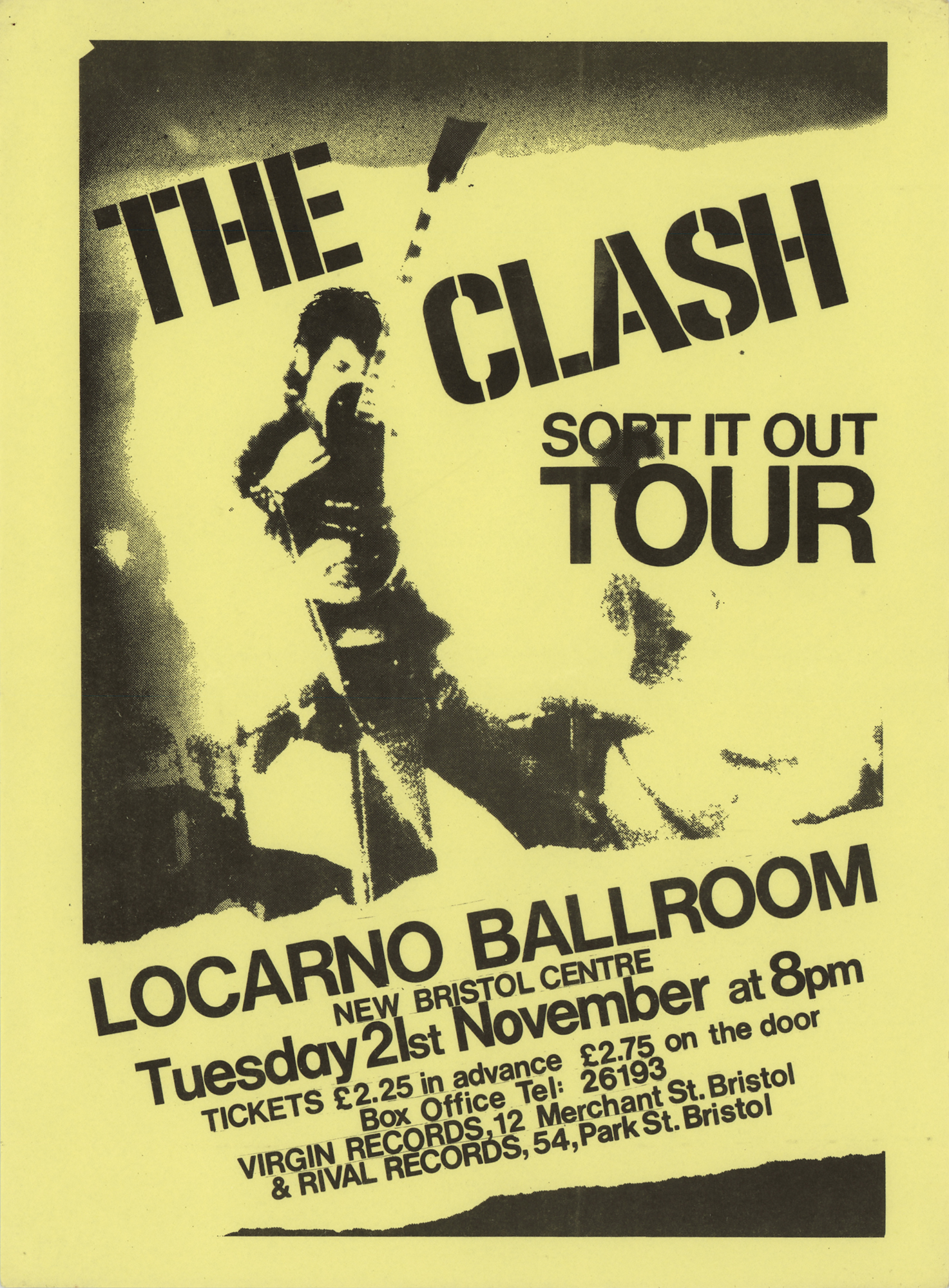Original 6 x 8 handbill for a concert by The Clash at the Locarno Ballroom in Bristol, England, on November 21, 1978, as part of the group’s Sort It Out Tour. In fine condition. Accompanied by a certificate of authenticity from Tracks.