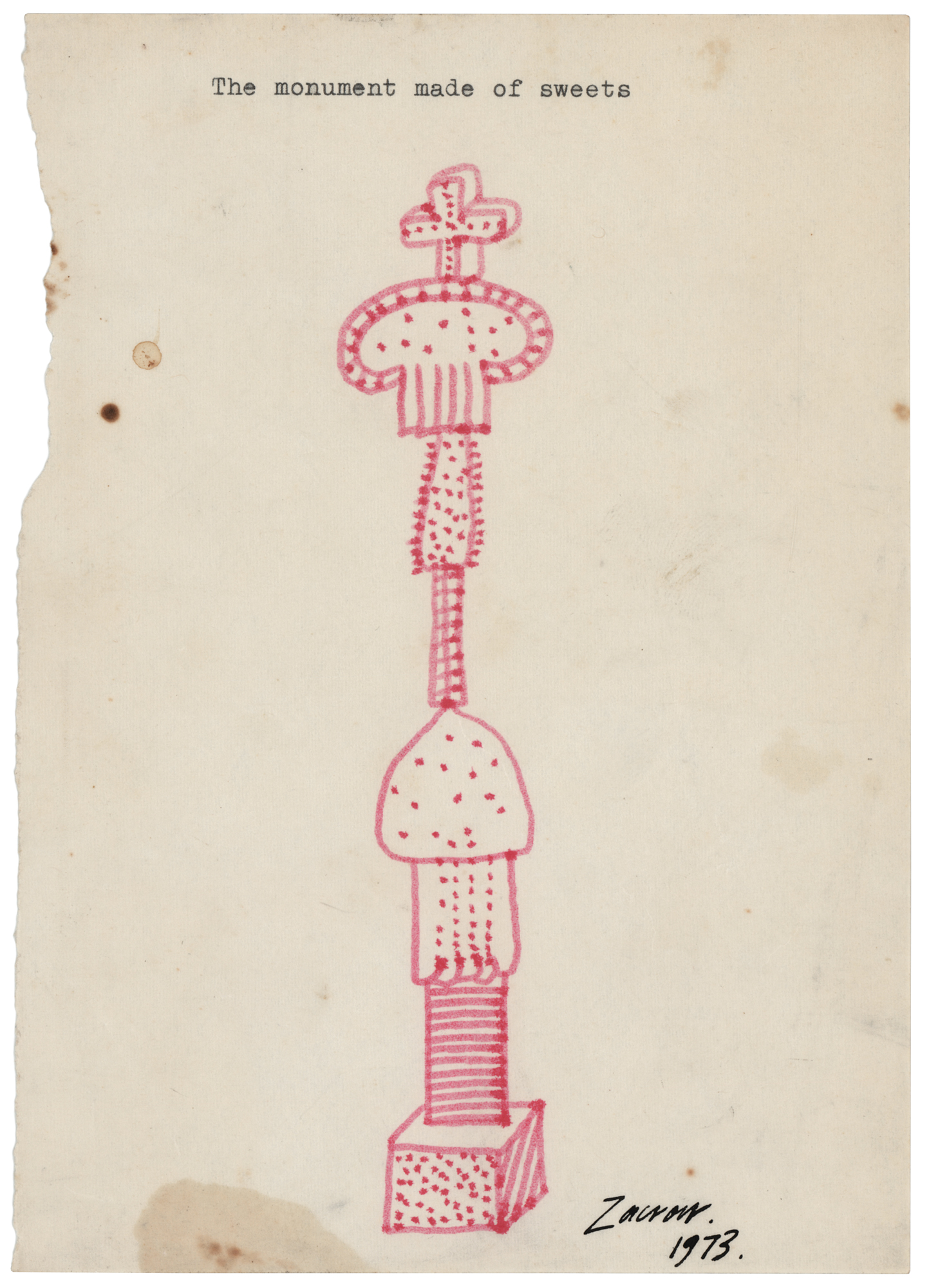 Original sketch by English artist Zacron (Richard Drew) of a stack of candies, accomplished in red felt tip on an off-white 6 x 8.25 sheet, which bears a typed caption above, “The monument made of sweets,” and signed below in black ink, “Zacron, 1973.” In fine condition, with several small stains. Accompanied by a certificate of authenticity from Tracks.