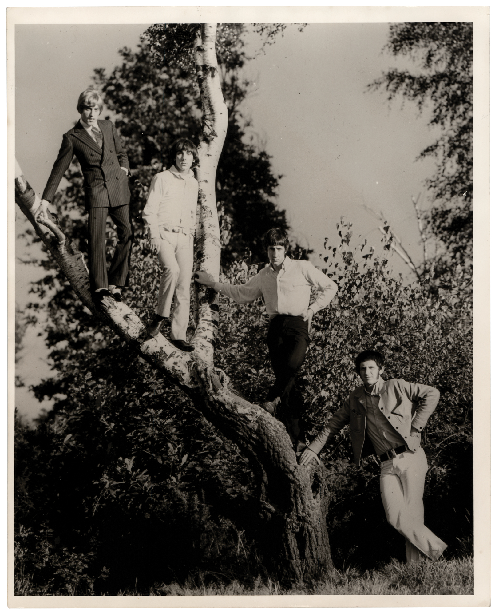 Original vintage 1960s glossy 8 x 10 silver gelatin press photo of The Who, depicting the band playfully posing outdoors, either standing or leaning on a large tree. In fine condition, with light rippling to the left edge. Accompanied by a certificate of authenticity from Tracks.