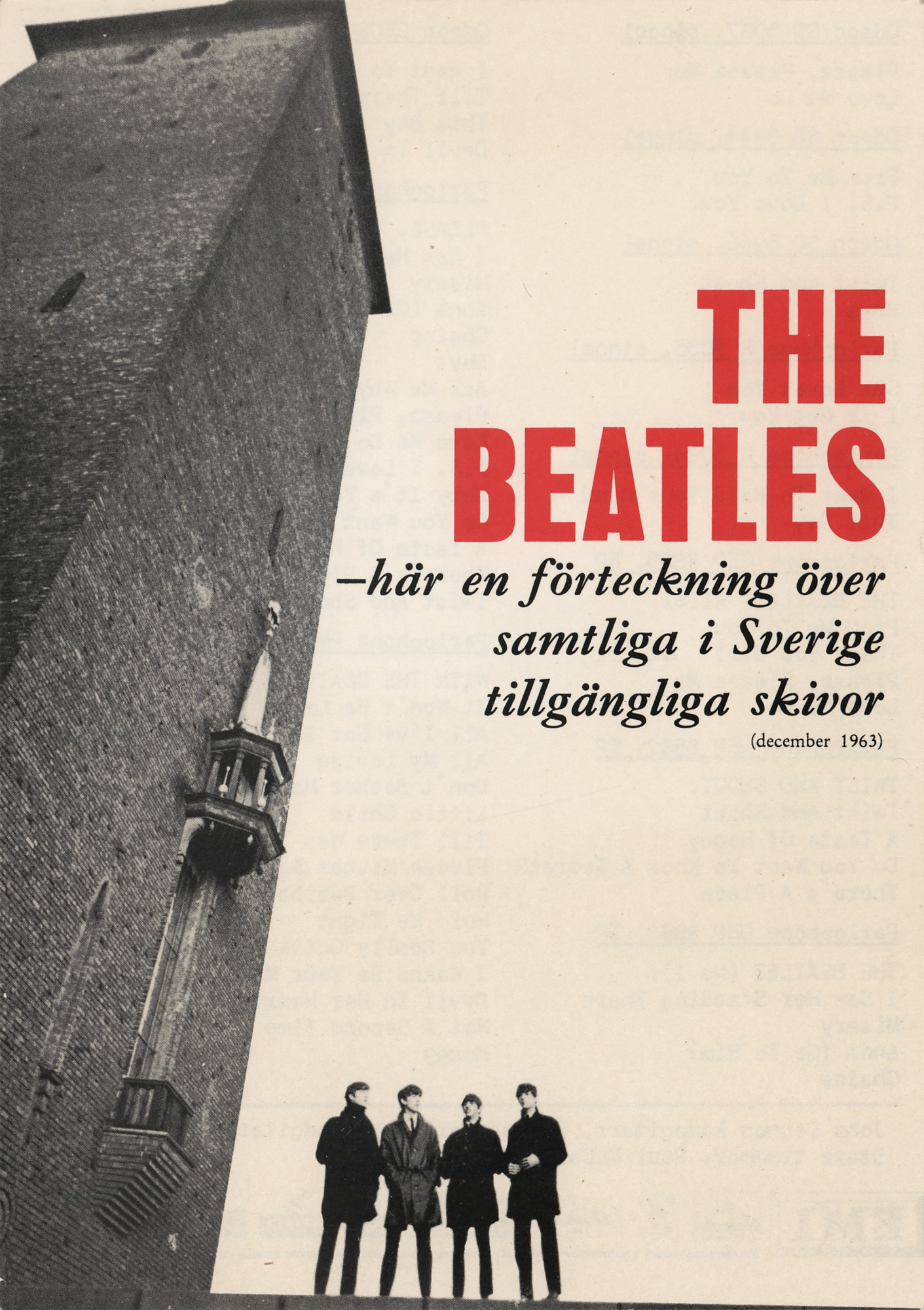 Original 1964 dual-sided 5.75 x 8.25 Odeon EMI Records promotional flyer issued to promote the Beatles’ latest releases in Sweden, the front featuring a Robert Freeman image of the band posing on a wall at the Stockholm City Hall with printed text (translated): “The Beatles – Here is a list of all disc available in Sweden (december 1963).” The reverse contains the full list of Beatles releases in the country. Printed in Stockholm, Sweden in 1964. In fine condition. Accompanied by a certificate of authenticity from Tracks.