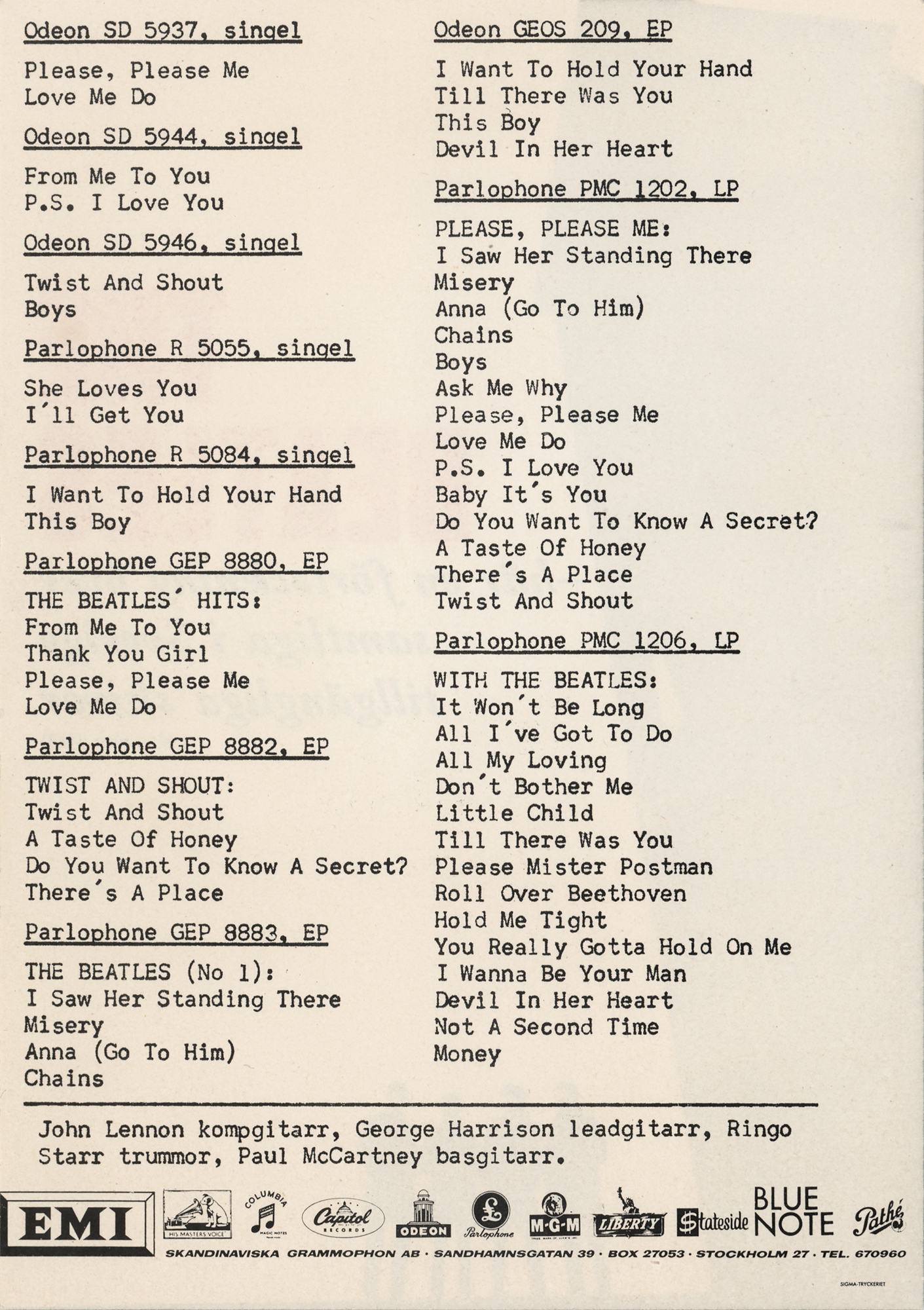 Beatles 1964 Swedish Promotional Flyer (Odeon EMI Records)