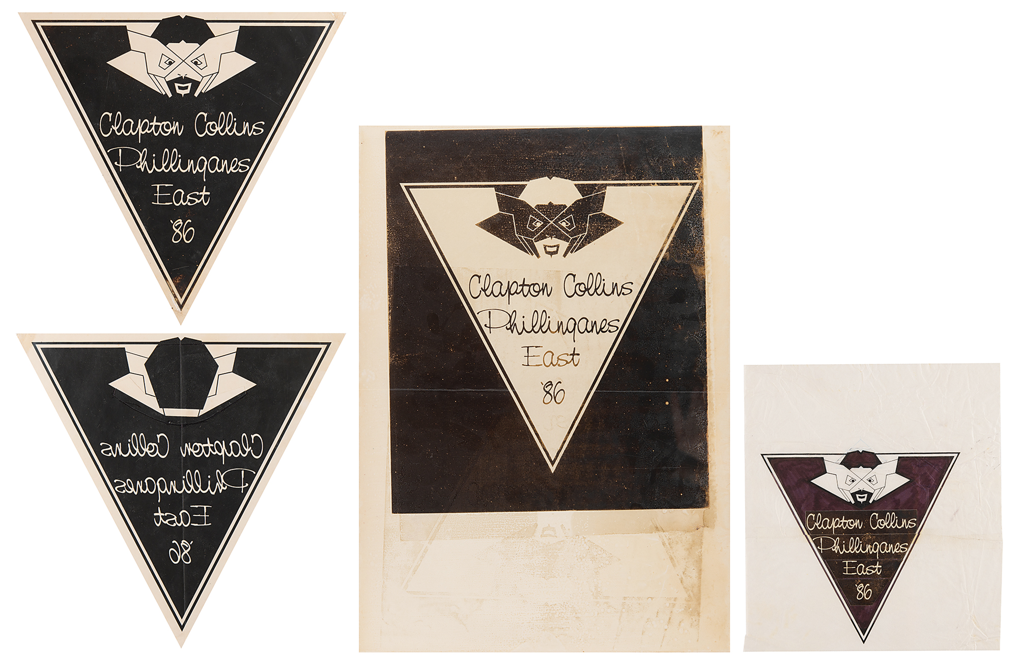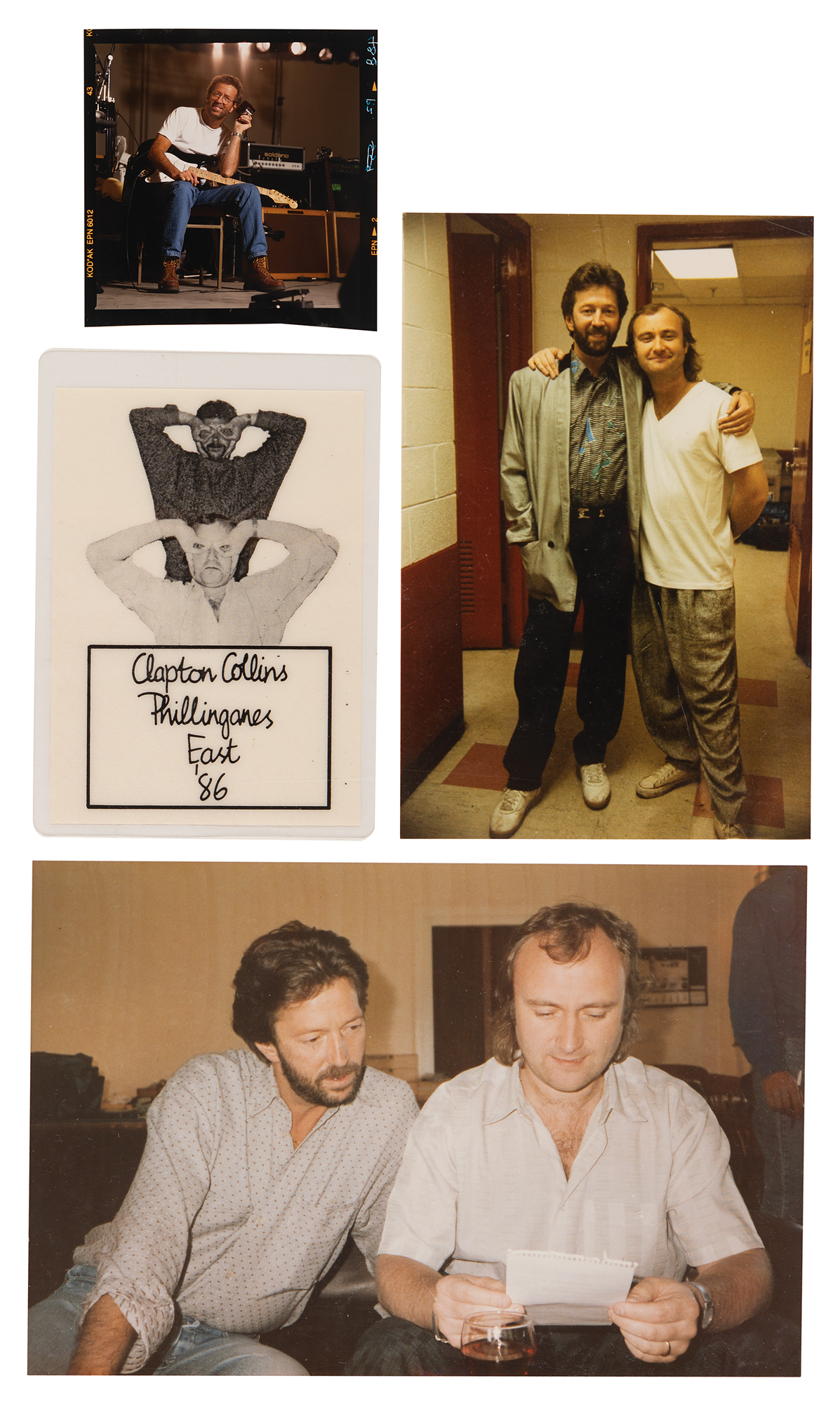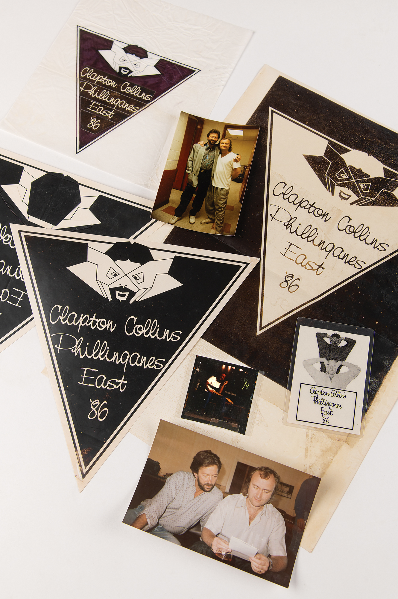 Appealing group lot of items related to the ‘Clapton Collins Phillinganes East 86’ tour, which featured musicians Eric Clapton, Phil Collins, Nathan East, and Greg Phillinganes. The lot includes original design material for the cover logo of the ‘Clapton Collins Phillinganes East 86’ tour program, such as: a hand-drawn template, accomplished in black felt tip on an 8 x 9 sheet of tracing paper, with affixed name sheets and a humorous image of Clapton using his hands to make a mask; larger 10.25 x 10 trigaular prints of the program’s front and back cover logos; and an 11.75 x 16.5 photographic proof of the front cover logo. Also included in the lot is a laminated backstage pass for the tour, which pictures both Clapton and Collins; two color glossy candid photos of Clapton and Collins during the tour, 6 x 4 and 3.5 x 5.25; and a color 2.25 x 2.25 photo transparency of Clapton seated with his guitar. In overall fine condition. Accompanied by a certificate of authenticity from Tracks.