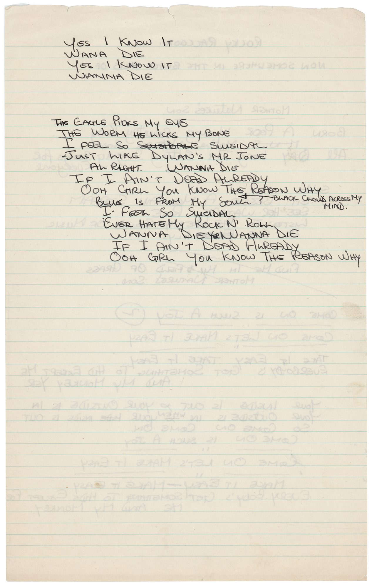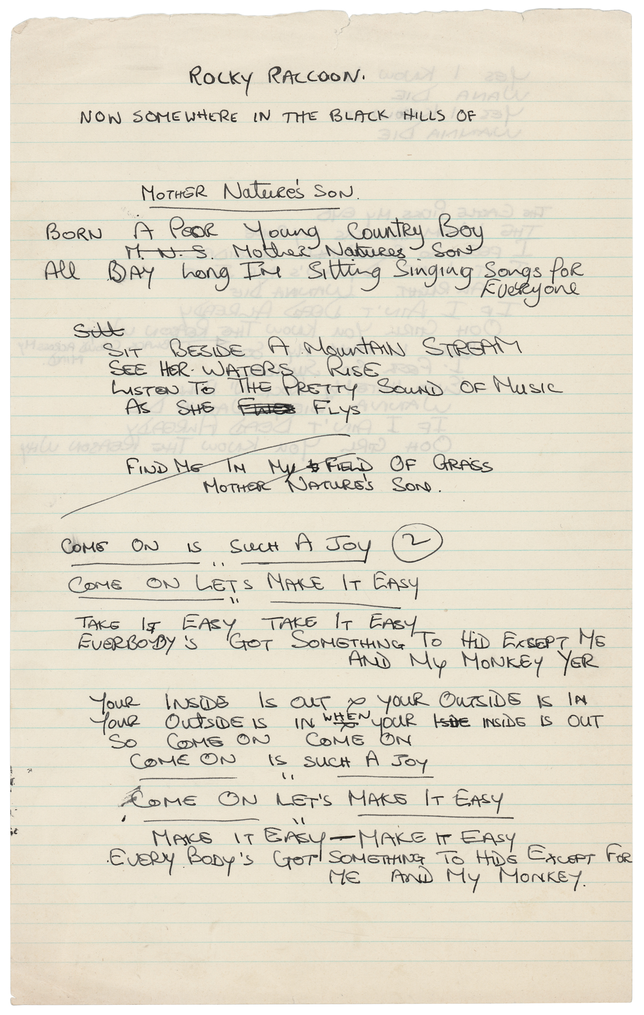 Handwritten partial lyrics in black ink by Mal Evans for four songs from the Beatles’ ‘White Album,’ unsigned, penned on both sides of an off-white 8 x 12.75 sheet of notebook paper, no date. The songs include ‘Rocky Raccoon,’ ‘Mother Nature’s Son,’ ‘Everybody’s Got Something to Hide Except for Me and My Monkey,’ and ‘Yer Blues.’ These lyrics would have been used in the studio while the Beatles were recording their self-titled album in 1968. In very good to fine condition, with light creasing, and a short tear, to the top edge. Accompanied by a certificate of authenticity from Tracks.