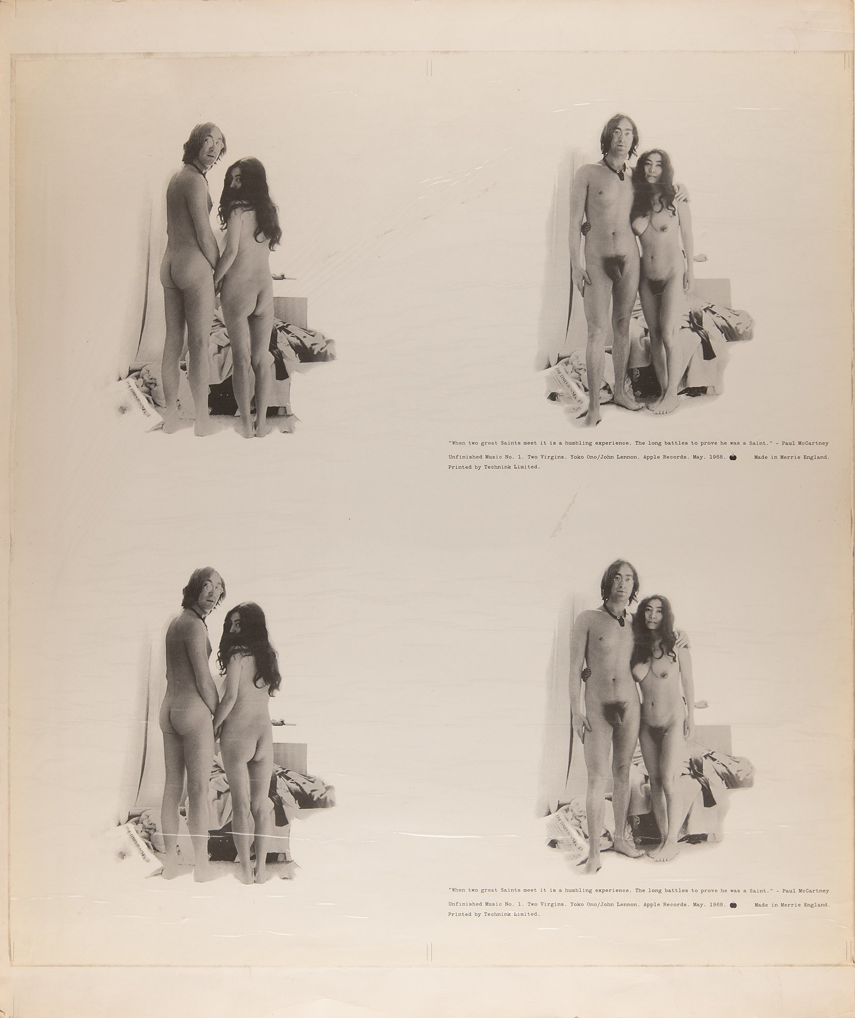 Laminated unfolded album cover proof for the mono version of Unfinished Music No. 1: Two Virgins, the first of three collaborative experimental albums released by John Lennon and Yoko Ono on Apple Records. The proof measures 25.5 x 30.25 and features two images of the album’s controversial front and back covers, which depict Lennon and Ono nude from the front and the rear; the photos were taken by Lennon and Ono with a time-delay camera, which was set up by Tony Bramwell, at 34 Montagu Square, in early October 1968. Rolled and in very good to fine condition, with some light creasing, and wrinkling to the clear lamination. Accompanied by a certificate of authenticity from Tracks.