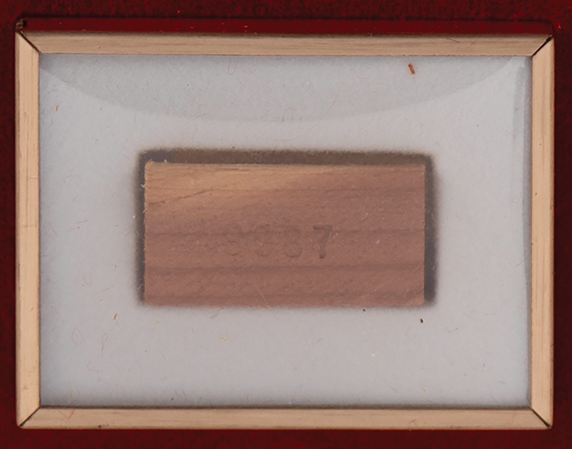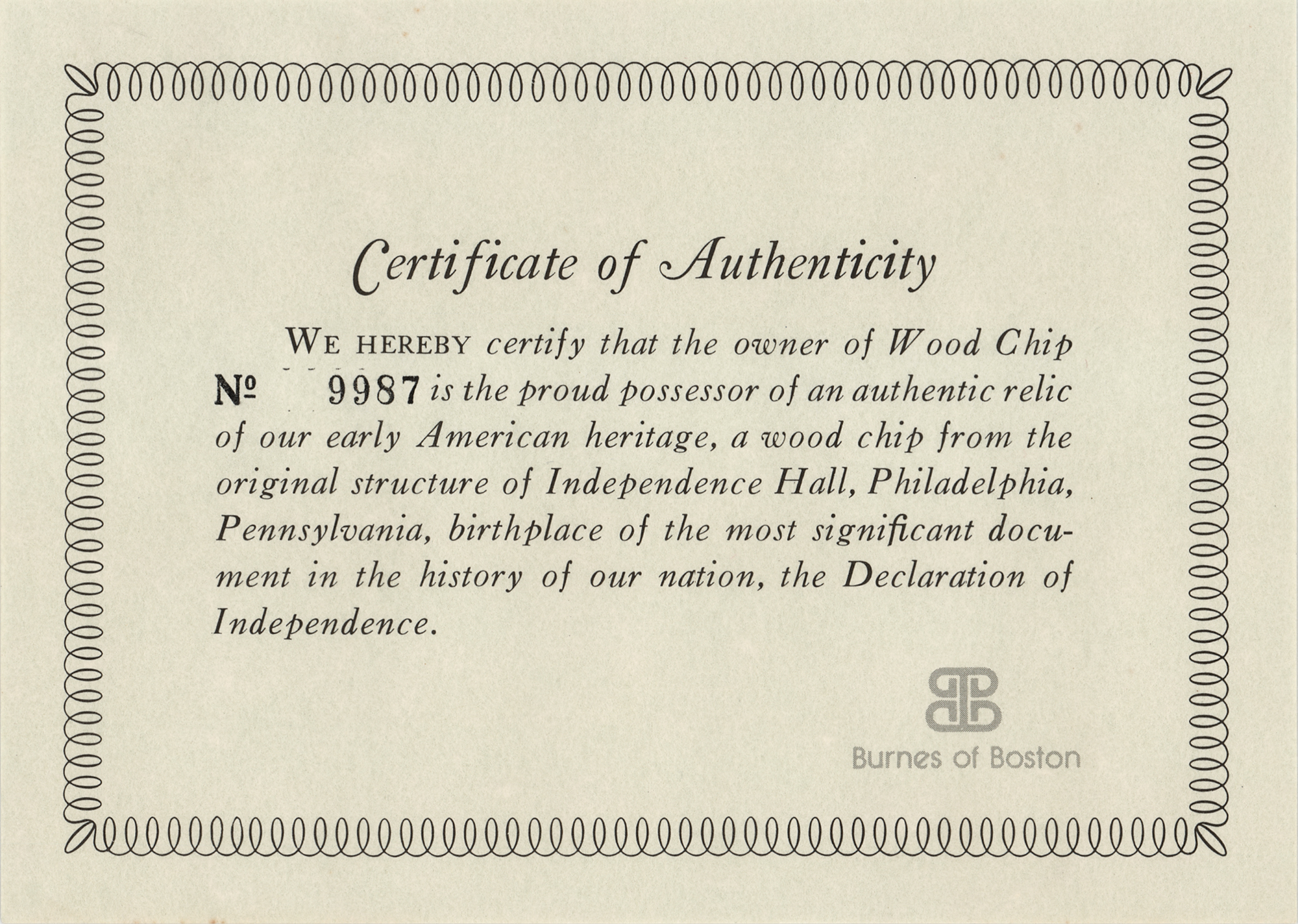 Limited edition display housing a 1˝ x .5˝ wood chip cut from the original cedar beams of Independence Hall in Philadelphia, numbered 9987 of an unspecified edition. Housed in a collector's case with an identification plaque and gold facsimile signatures of some of the signers of the Declaration of Independence. In fine condition. Accompanied by the original box, certificate, and booklet from Burnes of Boston, who released the edition during the bicentennial year of 1976.