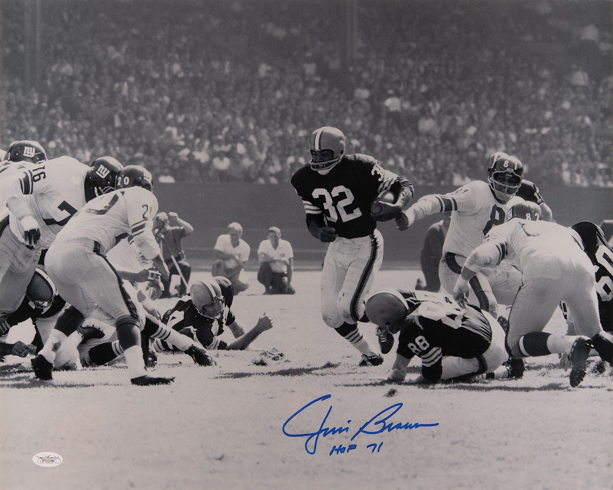 Glossy 20 x 16 photo of the legendary fullback carrying the ball for the Cleveland Browns, signed in blue felt tip, "Jim Brown, HOF 71." In fine condition, with a JSA label affixed at lower left.