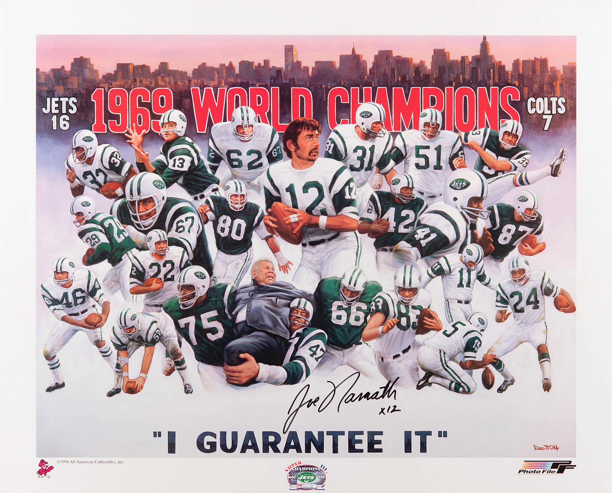 Color 23.25 x 18.75 print entitled 'I Guarantee It,' honoring the historic victory of the New York Jets in Super Bowl III, signed in thick black felt tip, "Joe Namath, 12." In fine condition.