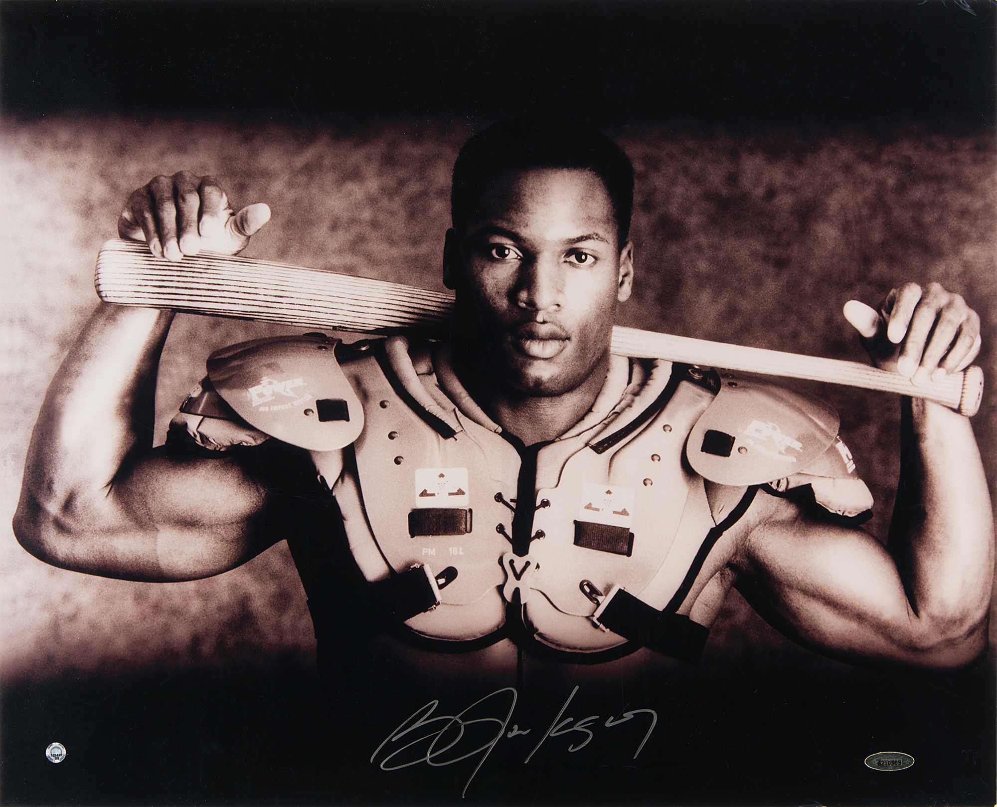 Classic color satin-finish 20 x 16 photo of Bo Jackson shirtless in his football pads, baseball bat resting across his shoulders, nicely signed in silver ink by the dual-sport legend. In fine condition, with a Tri-Star hologram affixed at lower right.