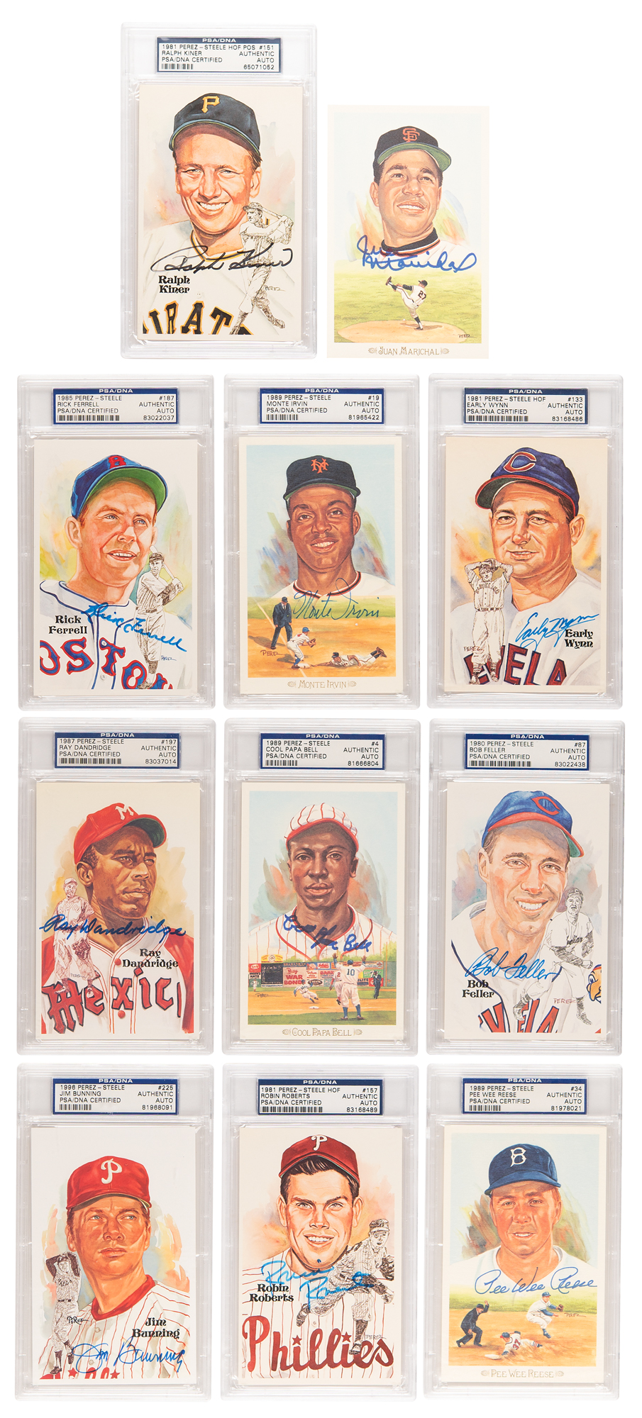 Group of 20 color Perez-Steele art postcards portraying a variety of Hall of Famers, each signed in felt tip by the subject, all but one encapsulated by PSA/DNA. Signers include: James 'Cool Papa' Bell, Johnny Bench, Jim Bunning, Rod Carew, Ray Dandridge, Bob Feller, Rick Ferrell, Jim 'Catfish' Hunter, Monte Irvin, Al Kaline, Harmon Killebrew, Ralph Kiner, Juan Marichal (not encapsulated), Willie McCovey, Robin Roberts, Brooks Robinson, Pee Wee Reese, Edd Roush, Early Wynn, and Carl Yastrzemski. In overall fine to very fine condition.