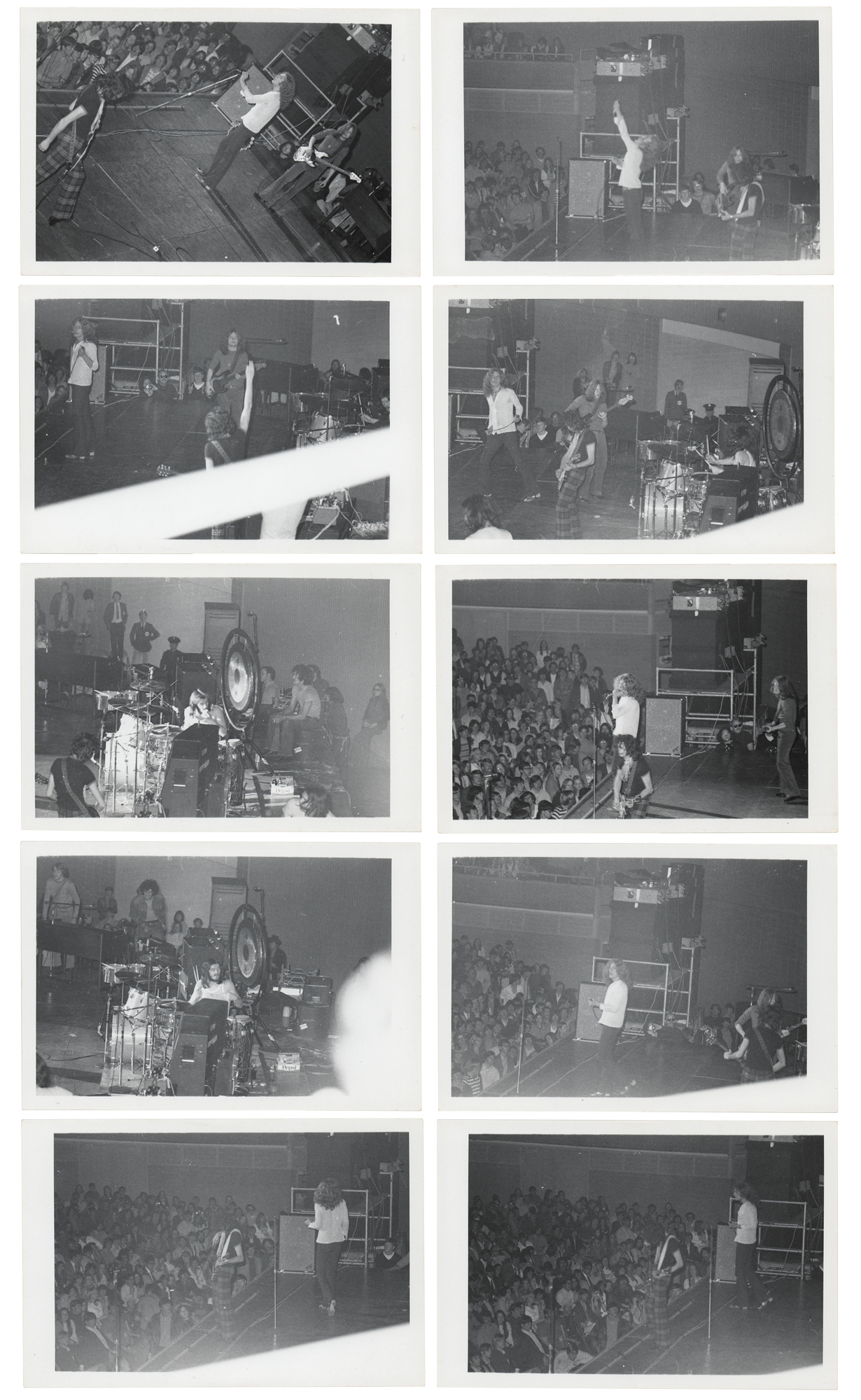 Great group of ten original vintage 5.25 x 3.5 candid photographs of Led Zeppelin in concert, circa 1969–1970, taken from the side of the stage. All four members of the band—vocalist Robert Plant, guitarist Jimmy Page, bassist-keyboardist John Paul Jones, and drummer John Bonham—are clearly visible throughout the images, which capture the essence of a classic Led Zeppelin performance. All have "A Kodak Paper" watermarks on the reverse. In overall fine condition.