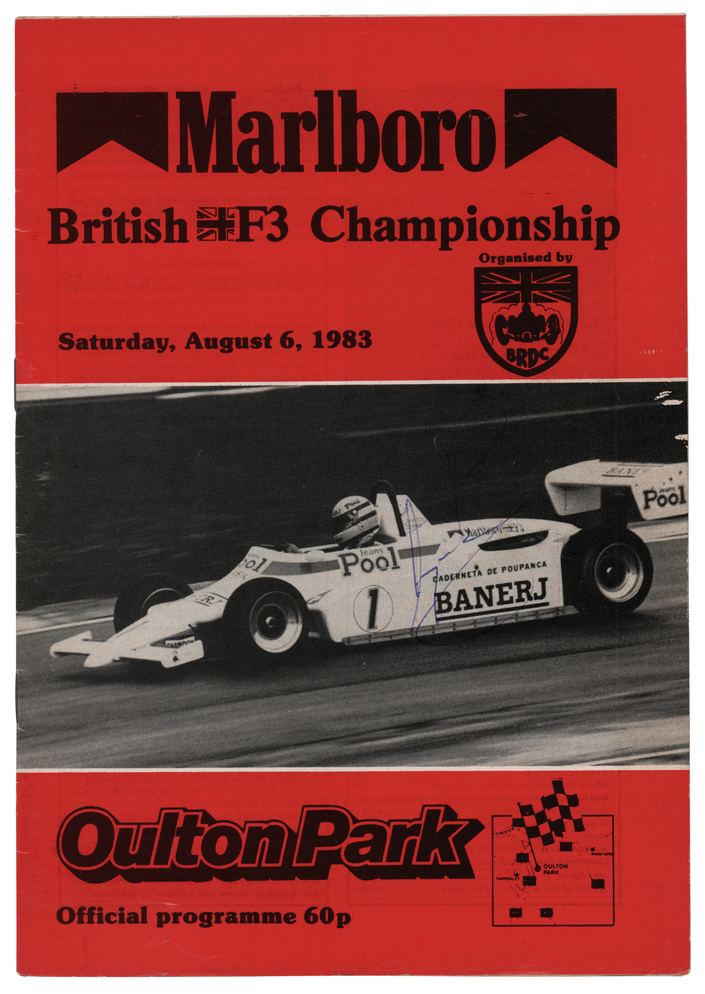 Scarce original program for the 1983 British Formula Three Championship, the 33rd season of the British Formula Three Championship, held at Oulton Park in Little Budworth, Cheshire, England, on August 6, 1983, twenty pages, 5.75 x 8.25, signed on the front cover in blue ballpoint by Ayrton Senna, who secured the fastest lap of the race. The program is also signed on page 15 by Davy Jones and Calvin Fish, the latter of whom was the race’s winning driver. The interior bears a handful of affixed results captions. In very good to fine condition, with light handling wear, and moderate signature contrast. Accompanied by an unsigned program from the 1983 British Formula Three Championship race held at Oulton Park on September 11, 1983.