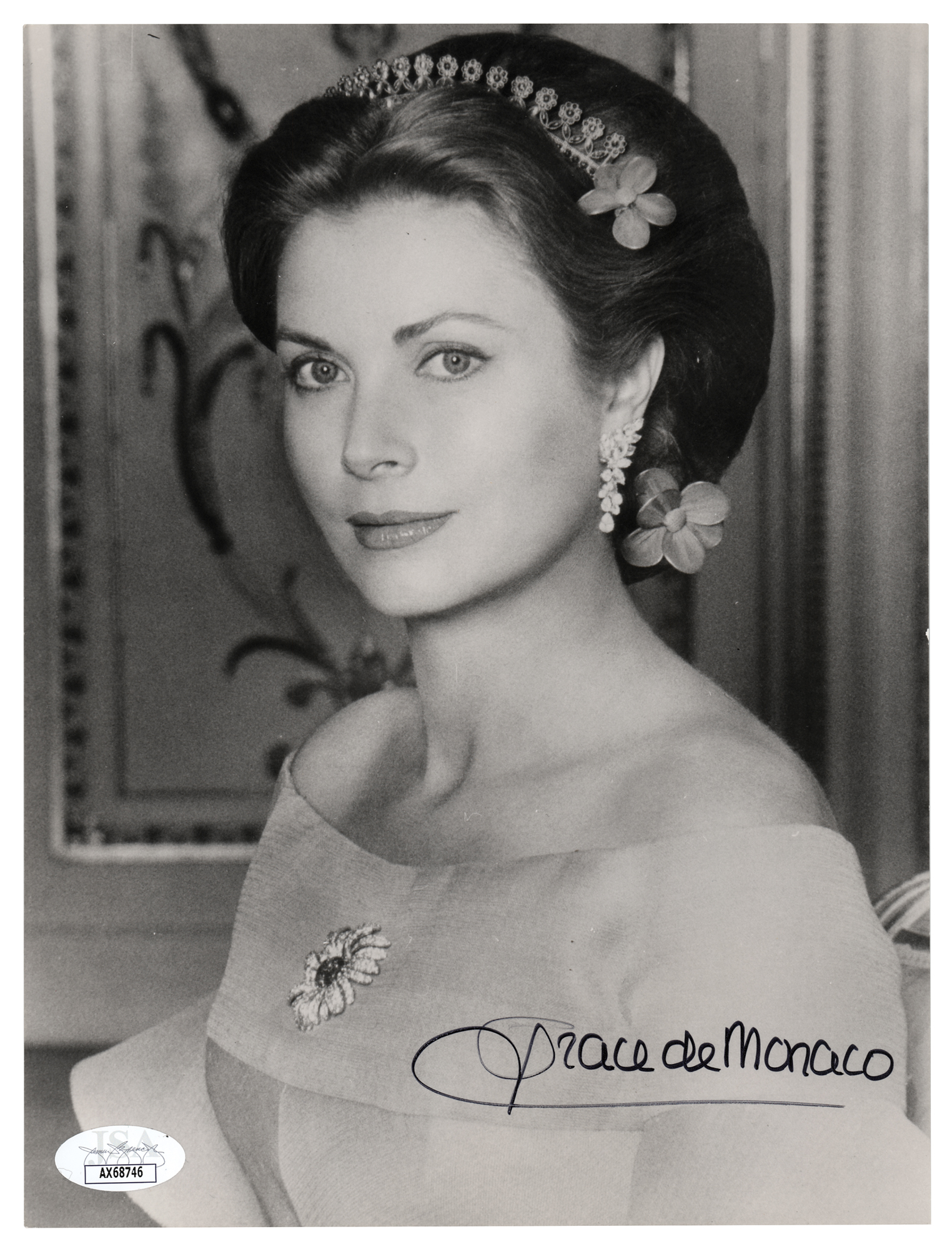 Satin-finish 7 x 9.25 head-and-shoulders portrait photo of Princess Grace of Monaco, signed in black felt tip, "Grace de Monaco." In fine condition, with a JSA label affixed to the lower left corner. Accompanied by a certificate of authenticity from JSA and a transmittal letter from Silvia Michelozzi, the secretary of Princess Grace, dated March 14, 1980.
