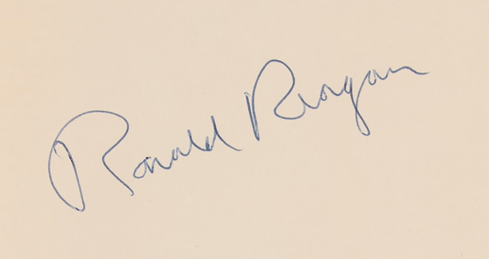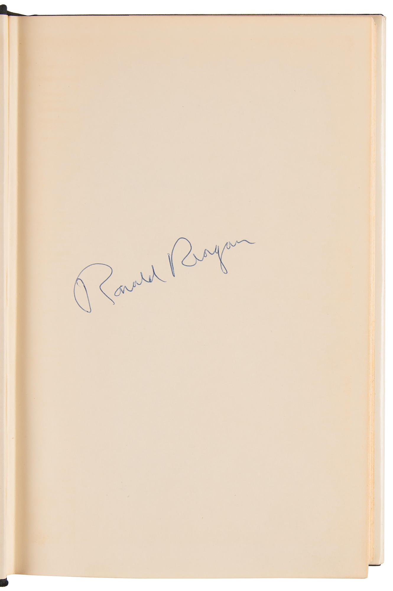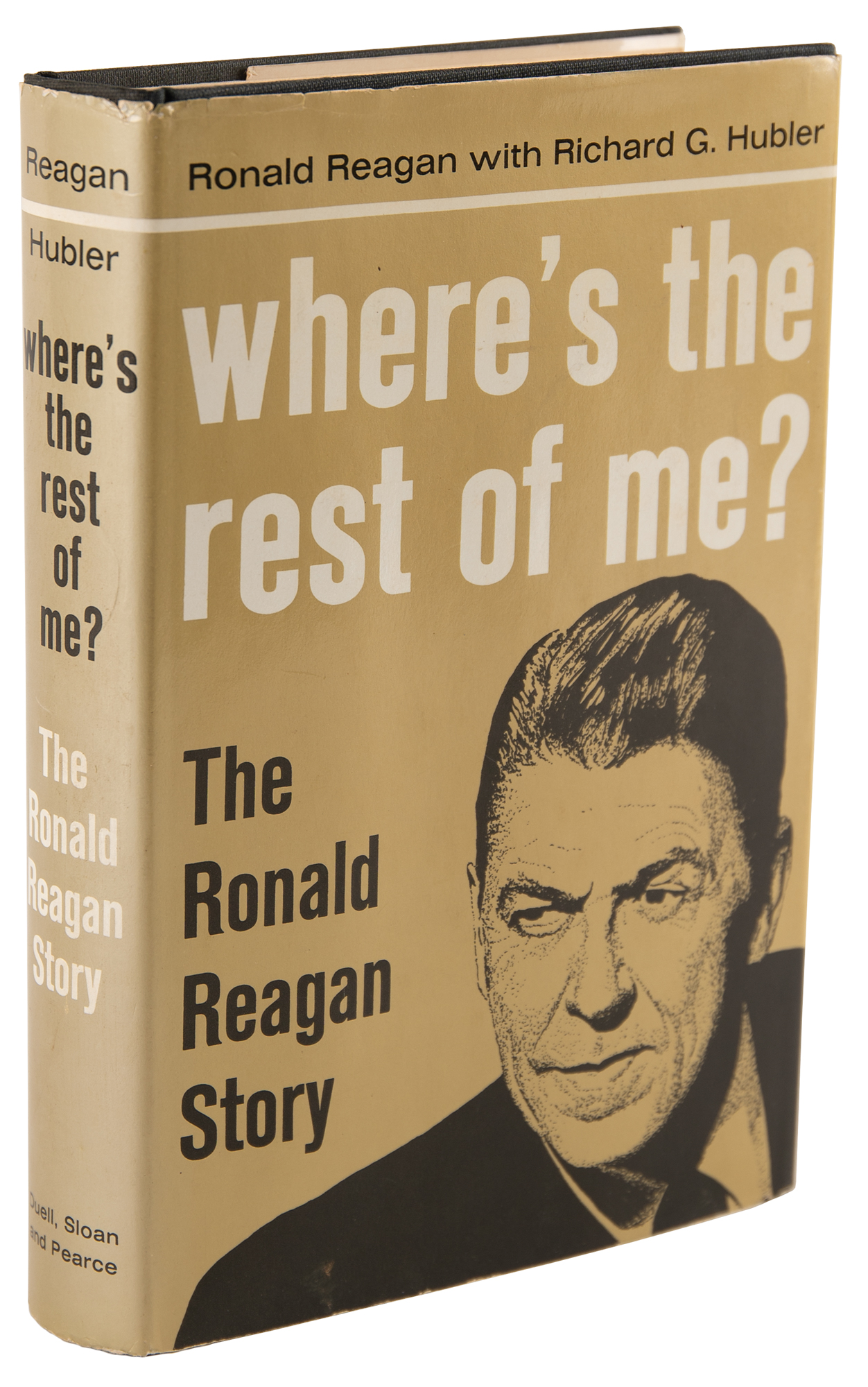 Signed book: Where's the Rest of Me? Second printing. NY: Duell, Sloan, and Pearce, 1965. Hardcover with dustjacket, 5.5 x 8.25, 316 pages. Signed on the first free end page in blue ballpoint, "Ronald Reagan." In fine condition. The title for this early autobiography derives from Reagan's famous line in the 1942 film King's Row, when his character, orphan Drake McHugh, following a boxcar accident, wakes up in a hospital and discovers that his legs have been amputated.
