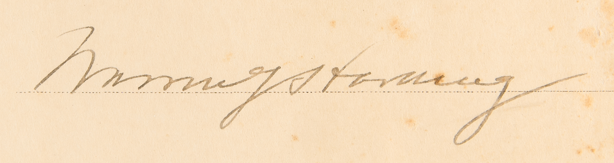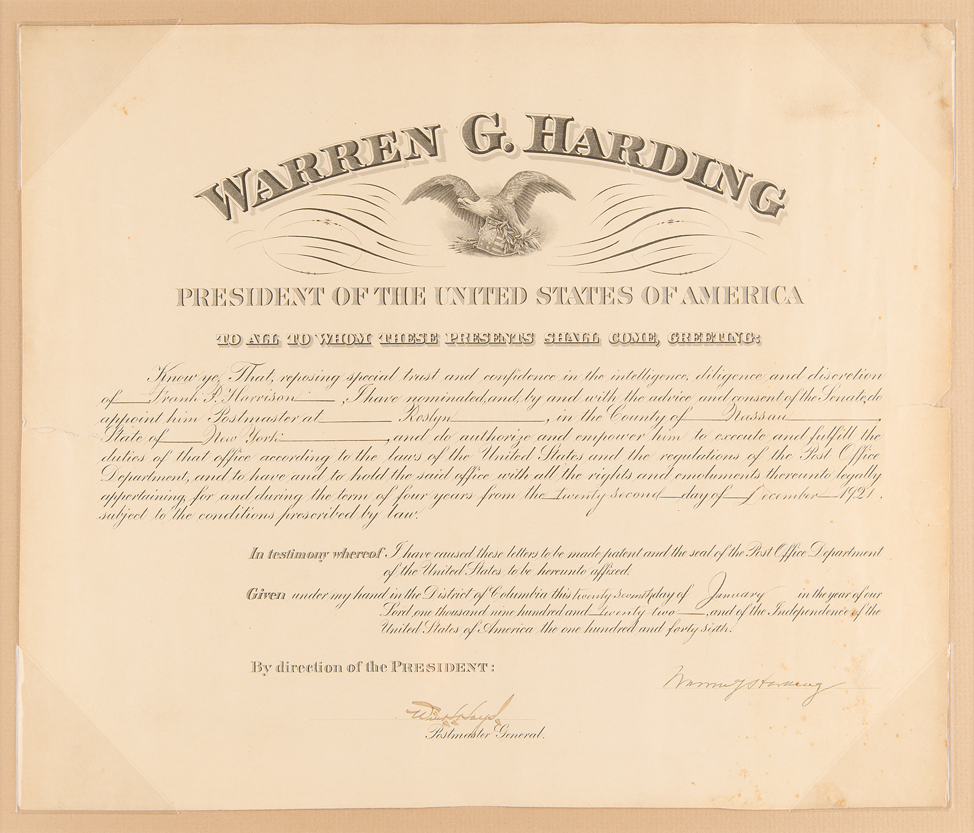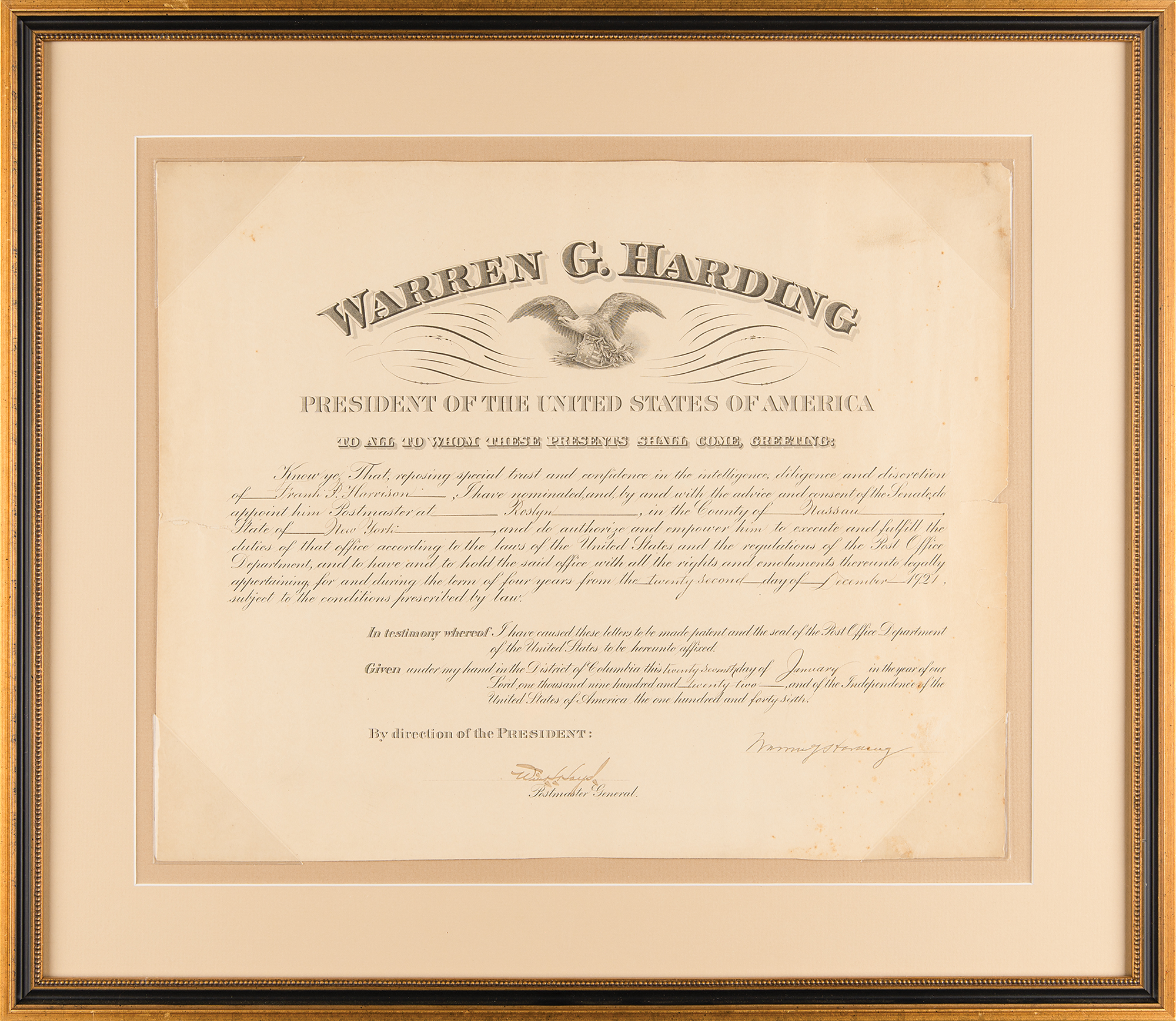 Partly-printed DS as president, one page, 16.5 x 13.5, January 27, 1922. President Warren G. Harding appoints Frank P. Harrison as "Postmaster at Roslyn, in the County of Nassau, State of New York." Signed at the conclusion in fountain pen by President Warren G. Harding and countersigned by Postmaster General William H. Hays. Archivally corner-mounted, matted, and framed to an overall size of 22.75 x 19.75. In very good to fine condition, with creasing and tears to the edges, and scattered foxing in the signature area.