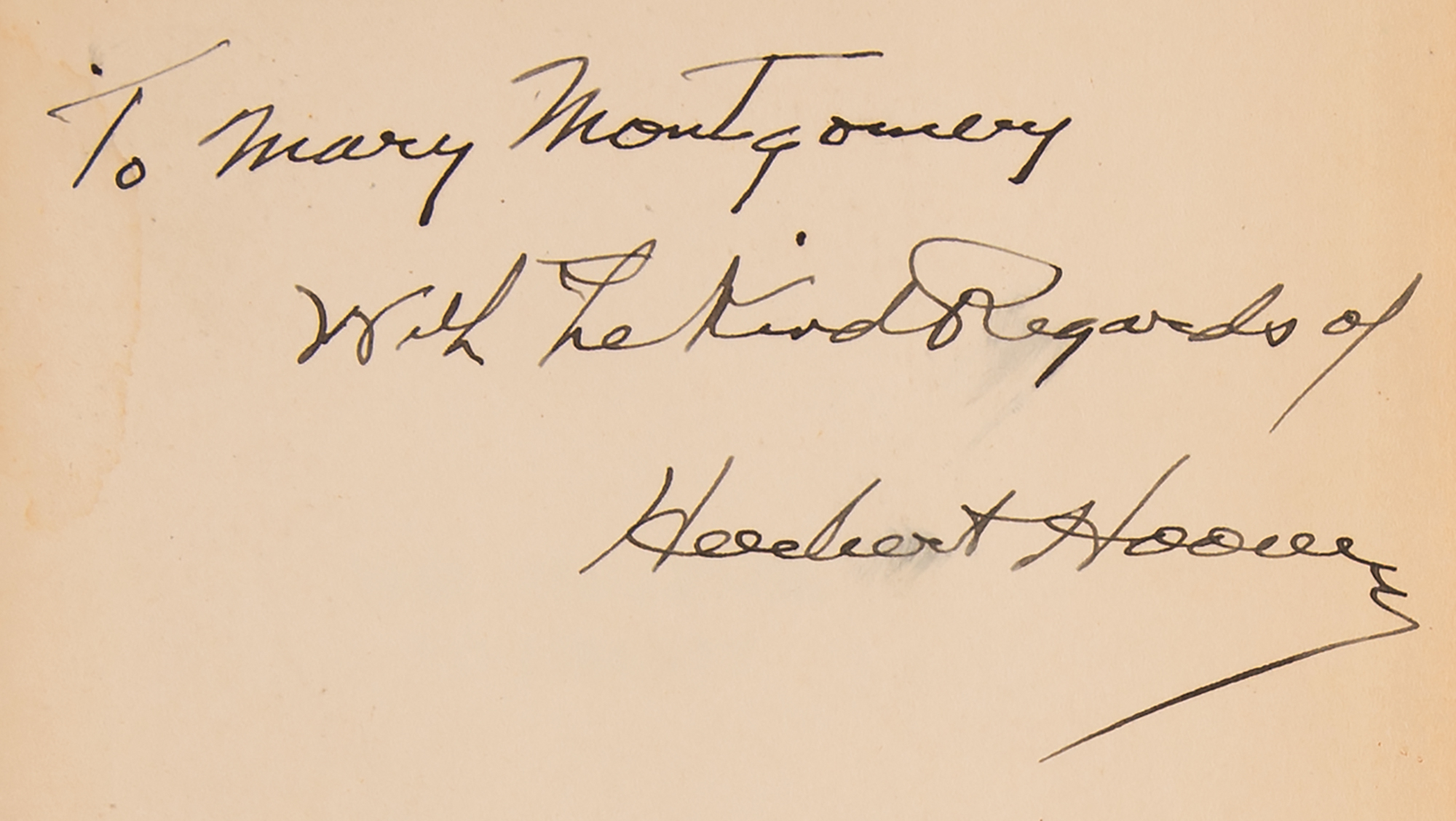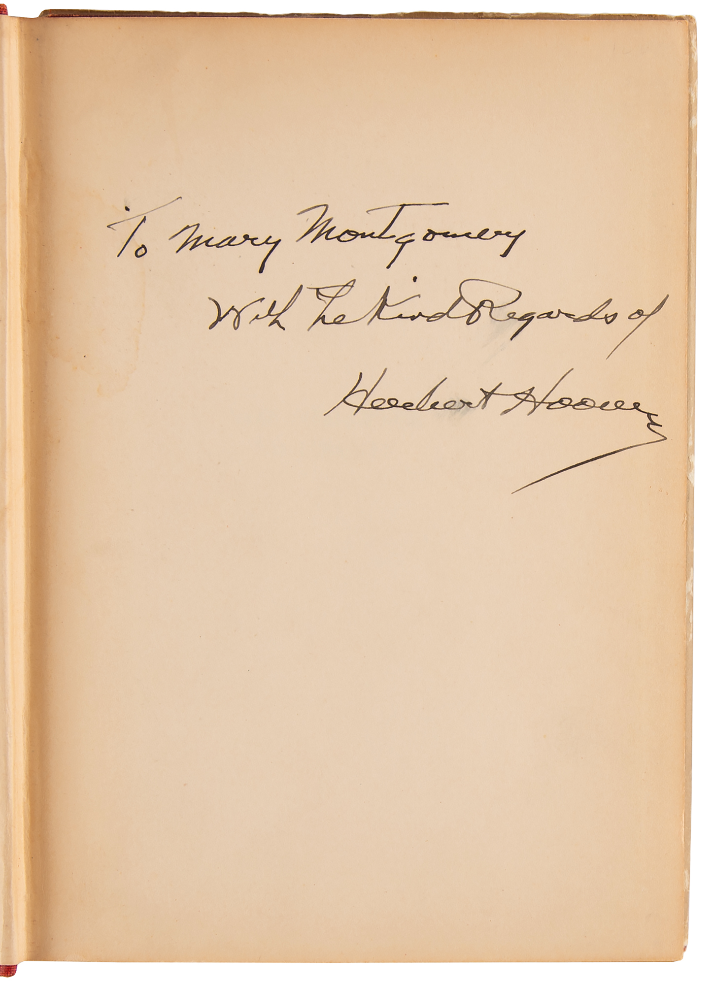 Signed book: The Challenge to Liberty. First edition. NY: Charles Scribner's Sons, 1934. Hardcover with dust jacket, 5.75 x 8, 212 pages. Signed and inscribed on the first free end page in fountain pen, "To Mary Montgomery, With the Kind Regards of Herbert Hoover." In very good to fine condition, with sunning and light damage to the spine, a light stain to the signed page, a block of toning to the title page from an inserted newspaper clipping, and staining and paper loss to the dust jacket.